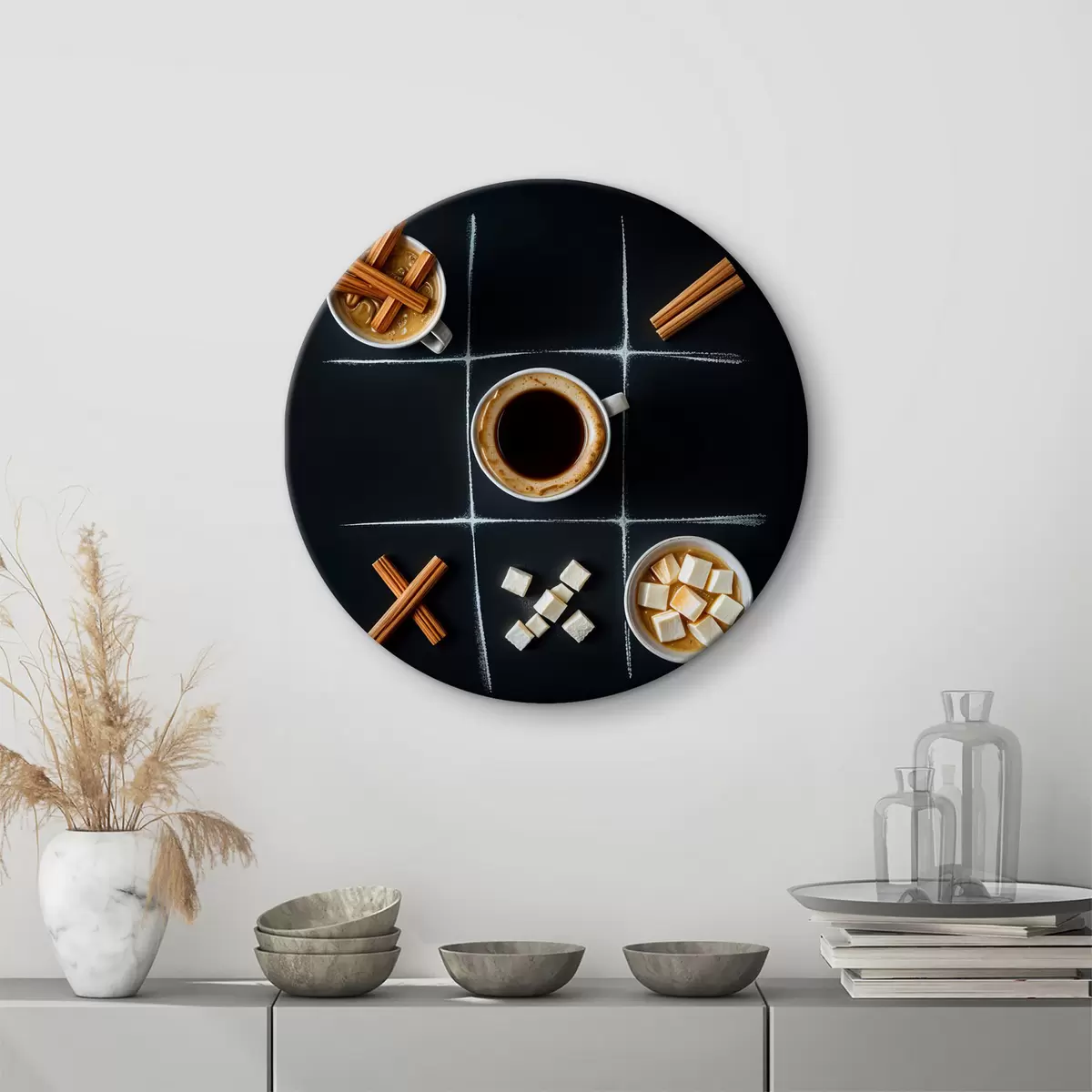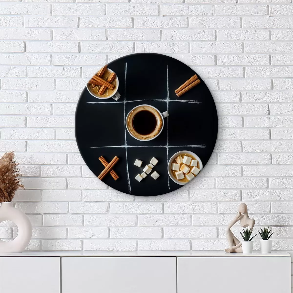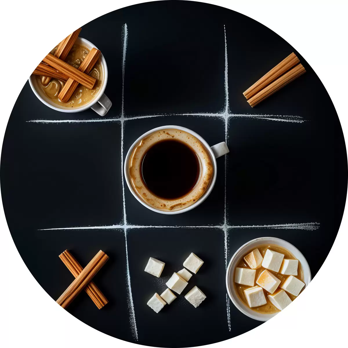 Runde Gemälde Eine Tasse Kaffee mit Zimtstangen, Zuckerwürfeln und Marshmallows, angeordnet in einem Tic-Tac-Toe-Raster r40163