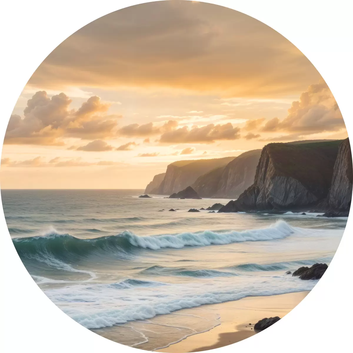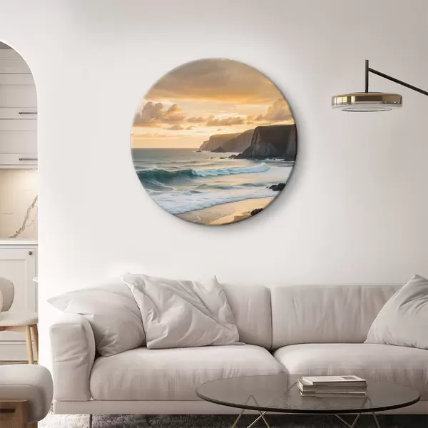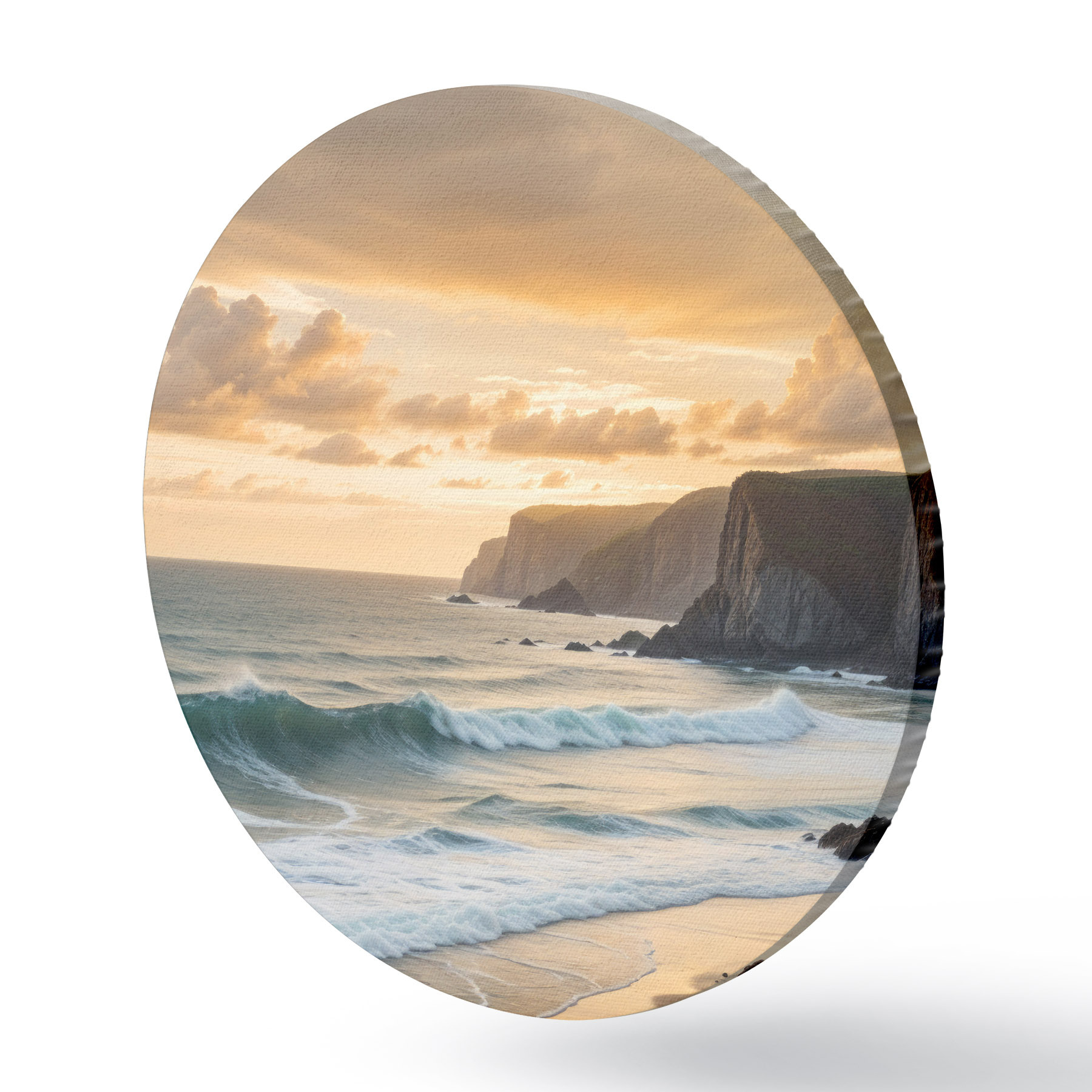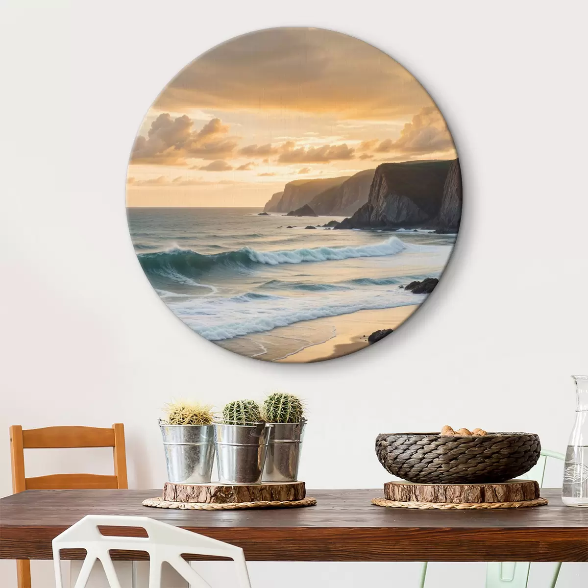 Runde Gemälde Eine malerische Küstenlandschaft mit dramatischen Klippen, tosenden Wellen und einem farbenfrohen Sonnenuntergangshimmel r40176
