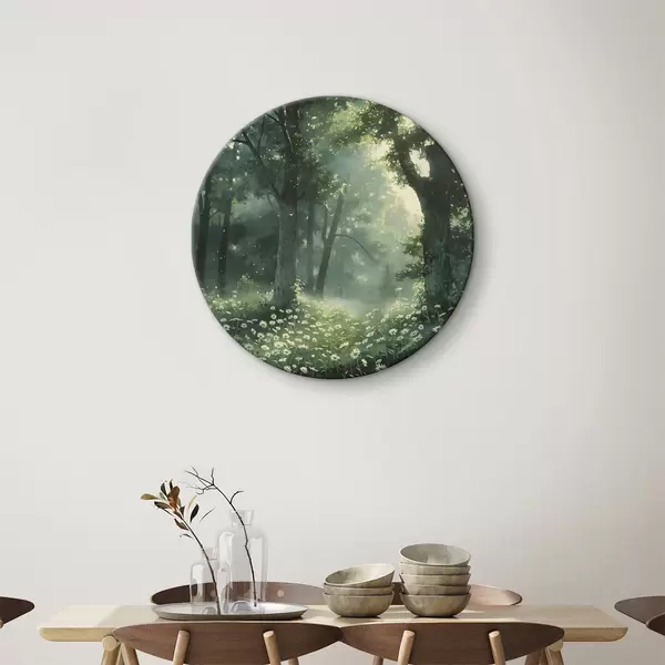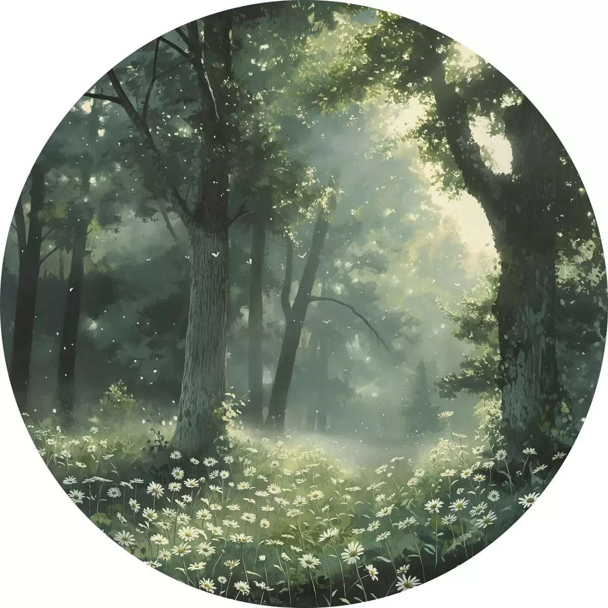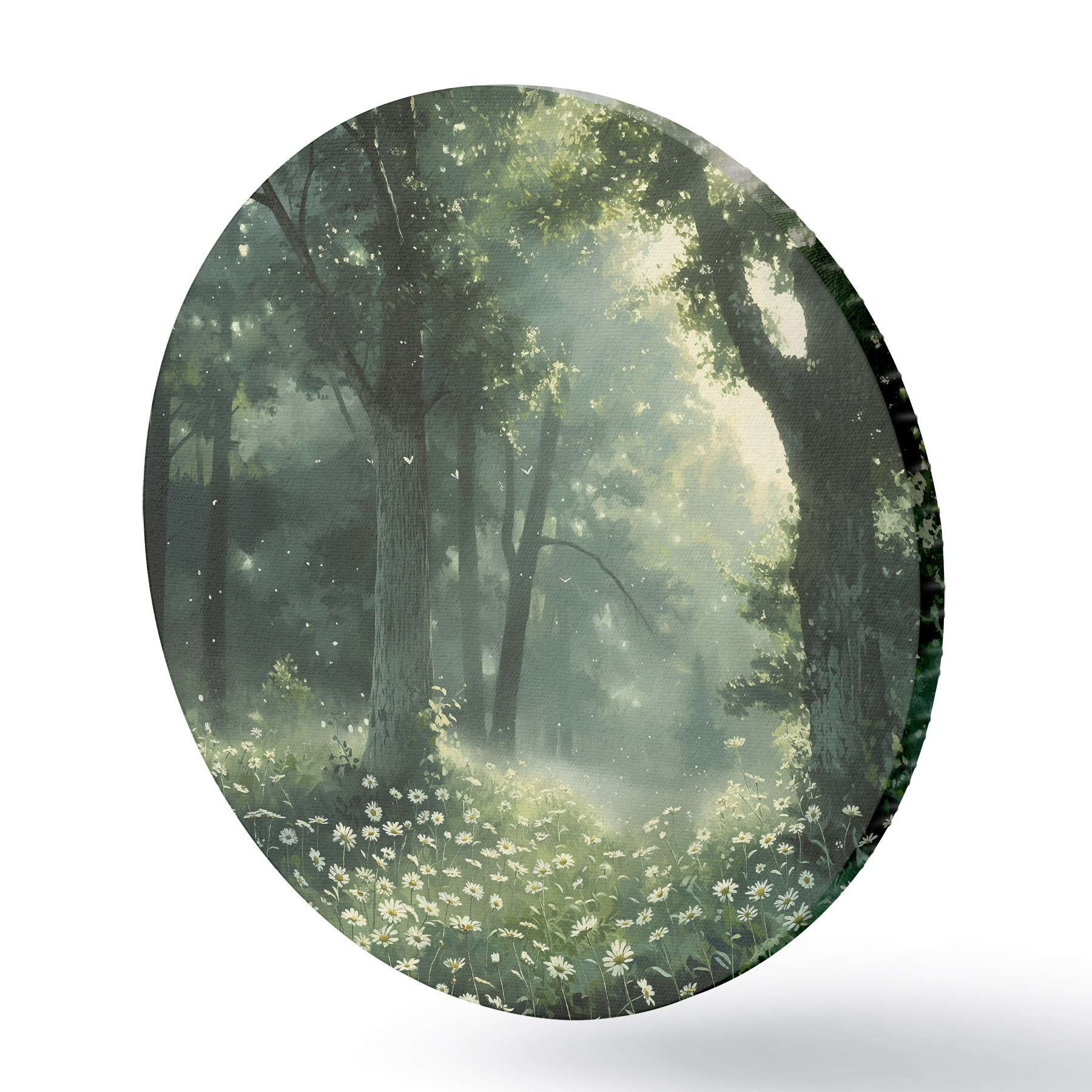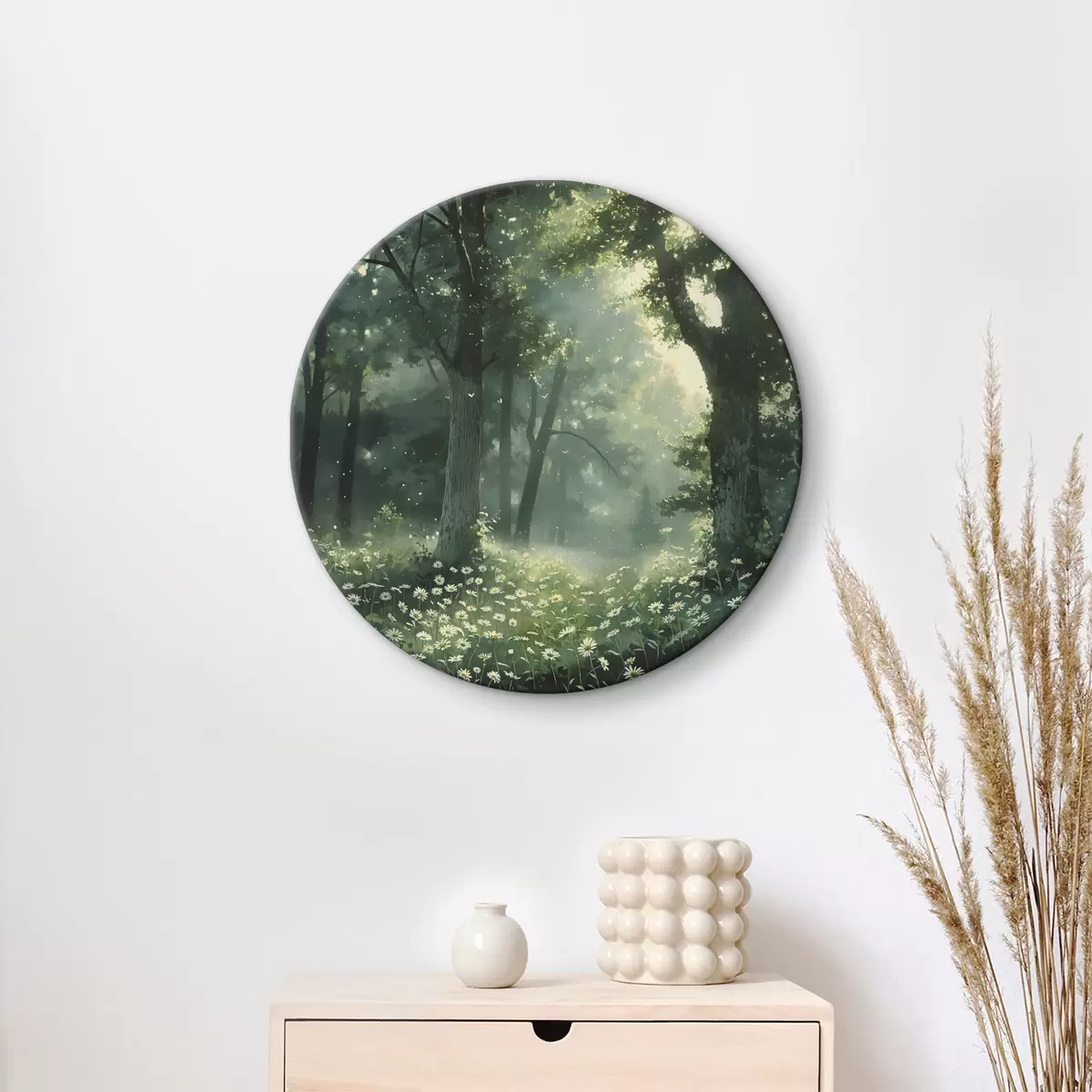 Runde Gemälde Dichter Wald mit Sonnenlicht in den Bäumen, Kamillenblüten, grünem Gras, Natur r40224