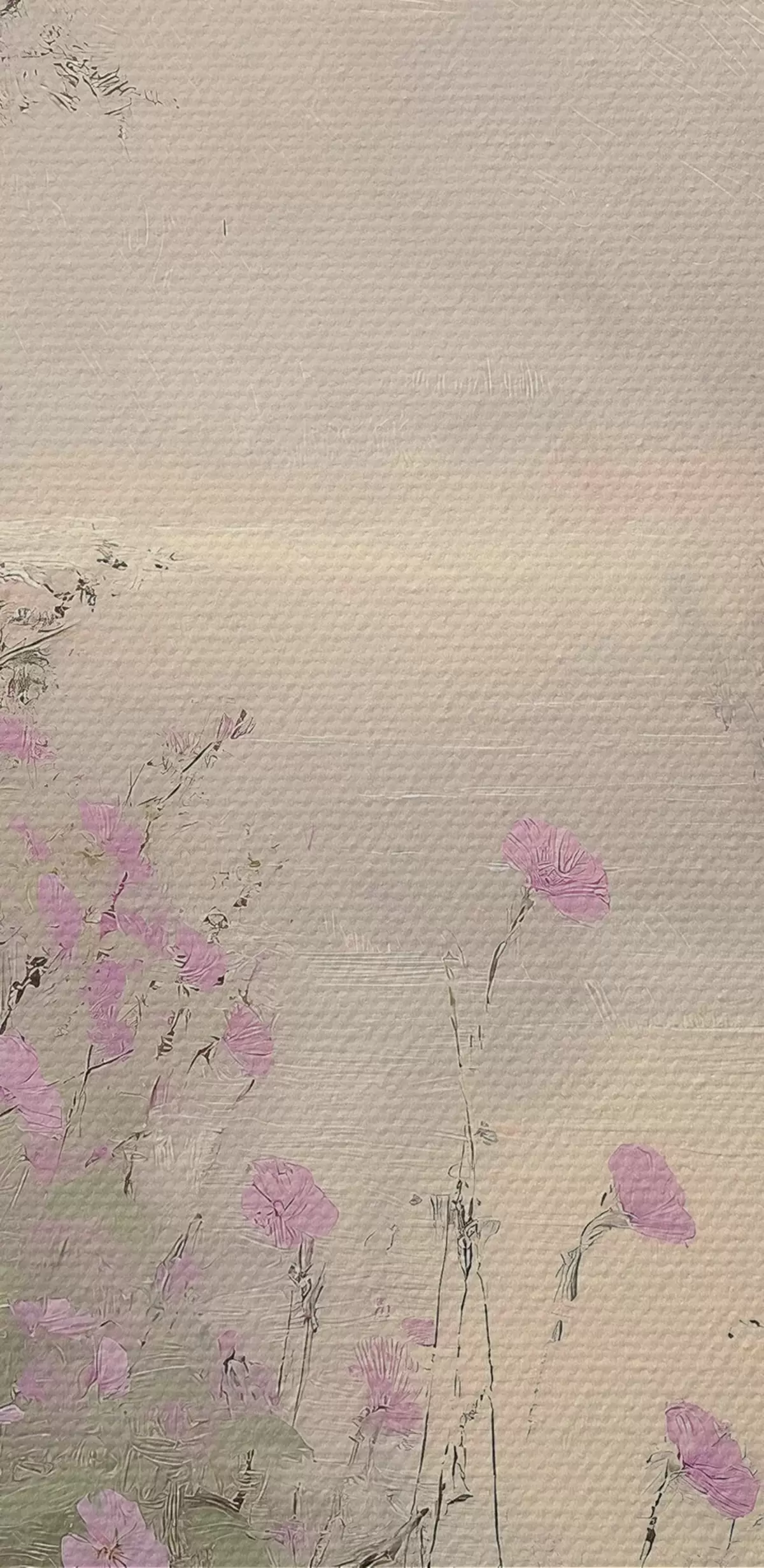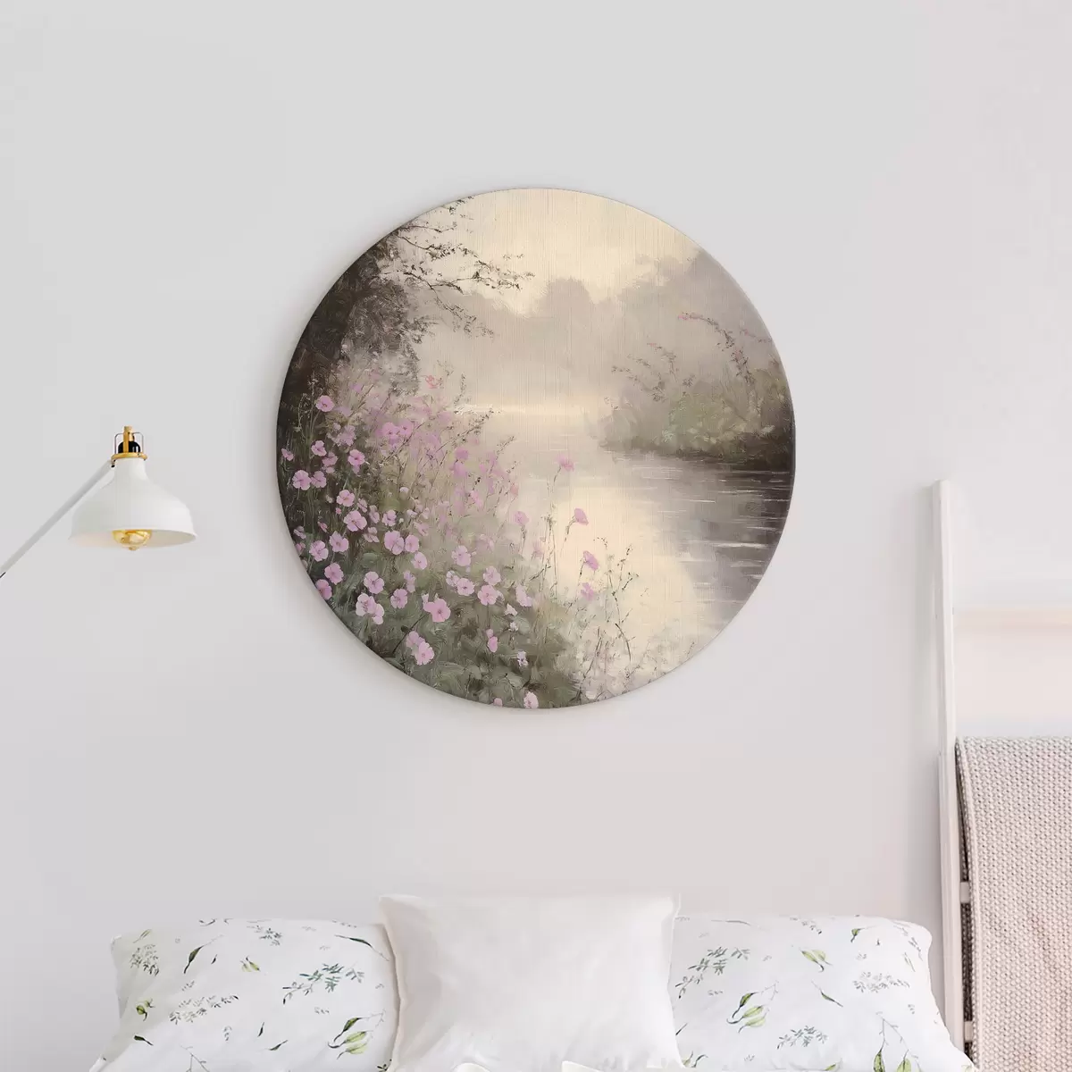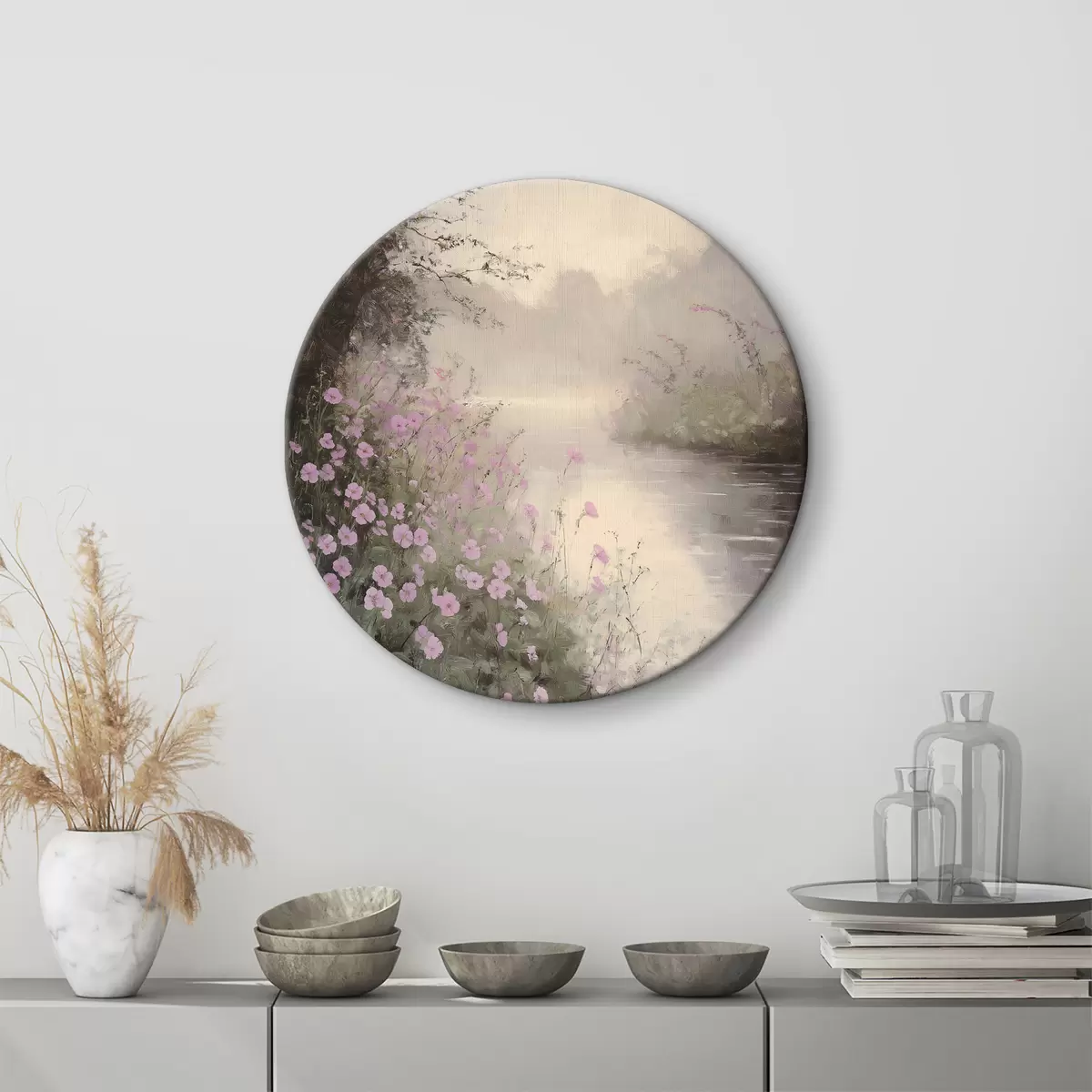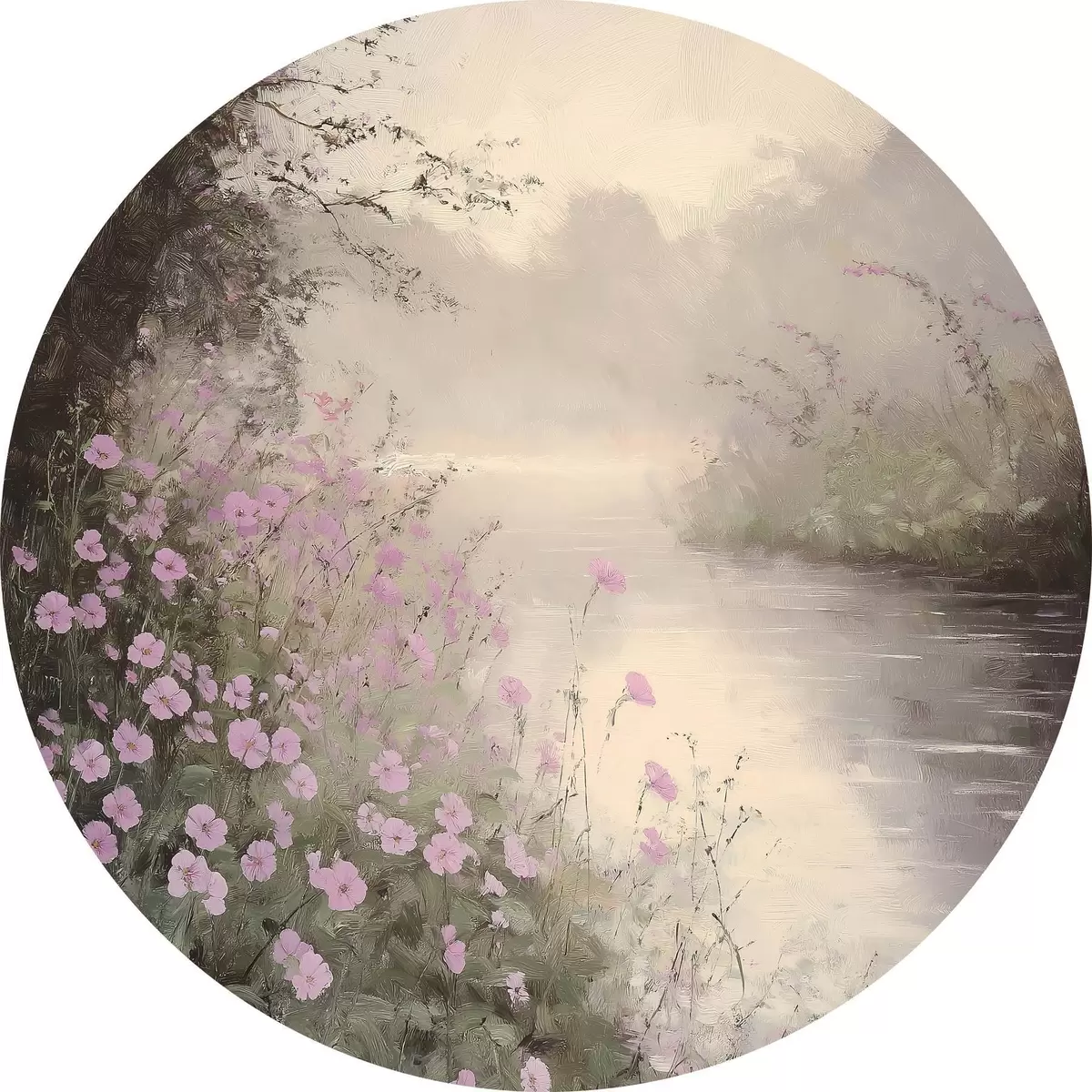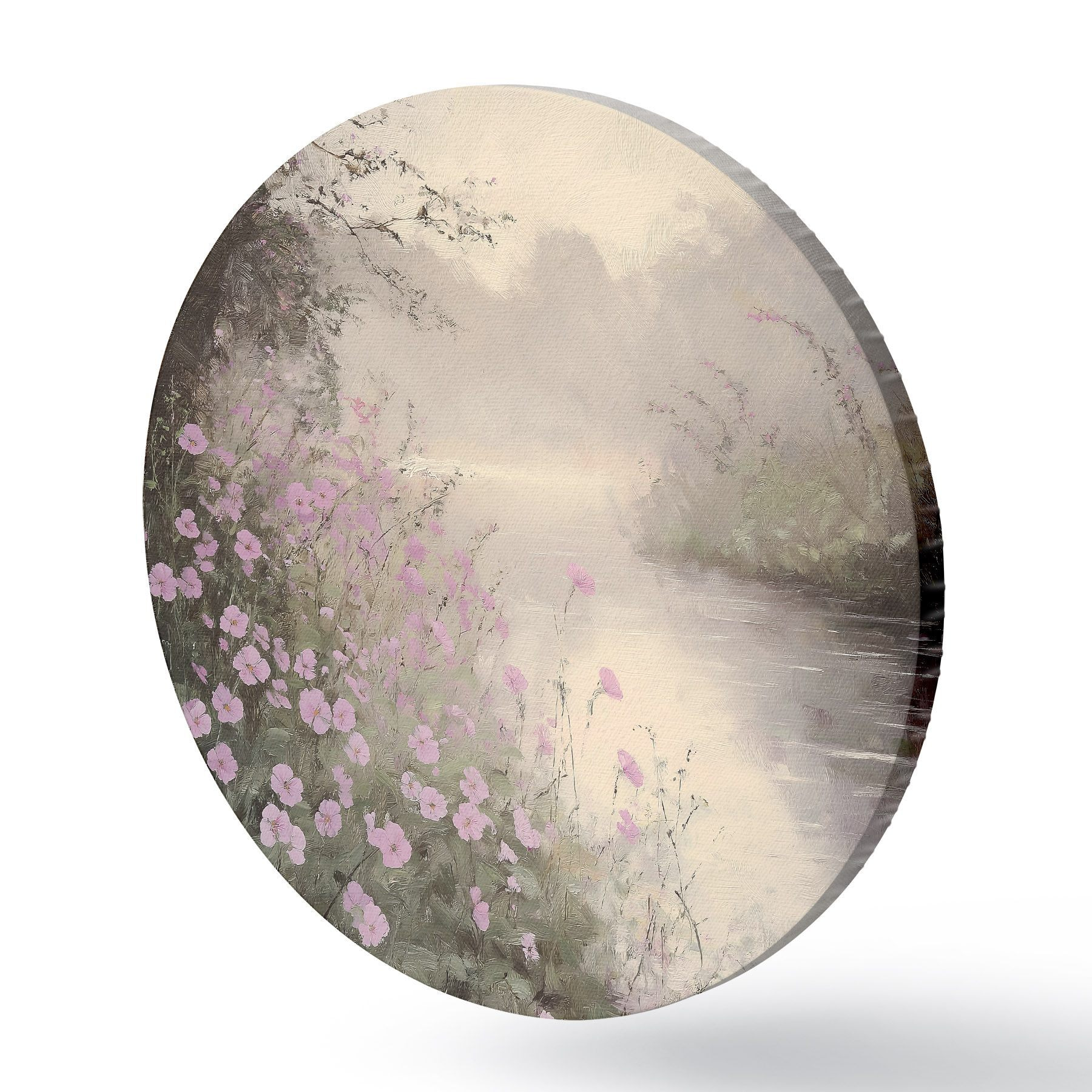 Runde Gemälde See mit rosa Blumen, Sonnenaufgang, Ölzeichnung, pastellbeige Farben, Nebel r40229