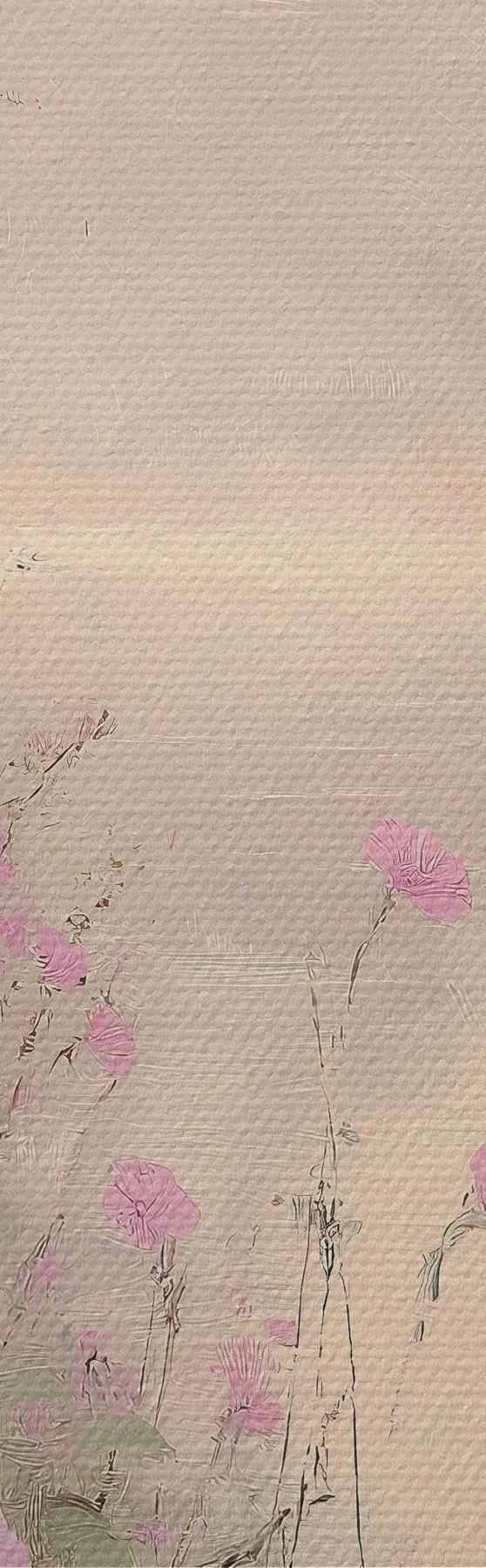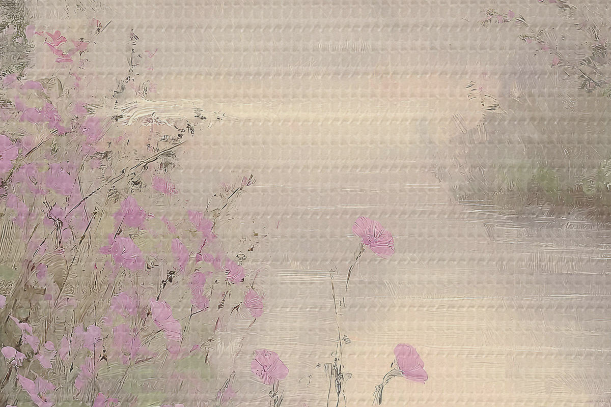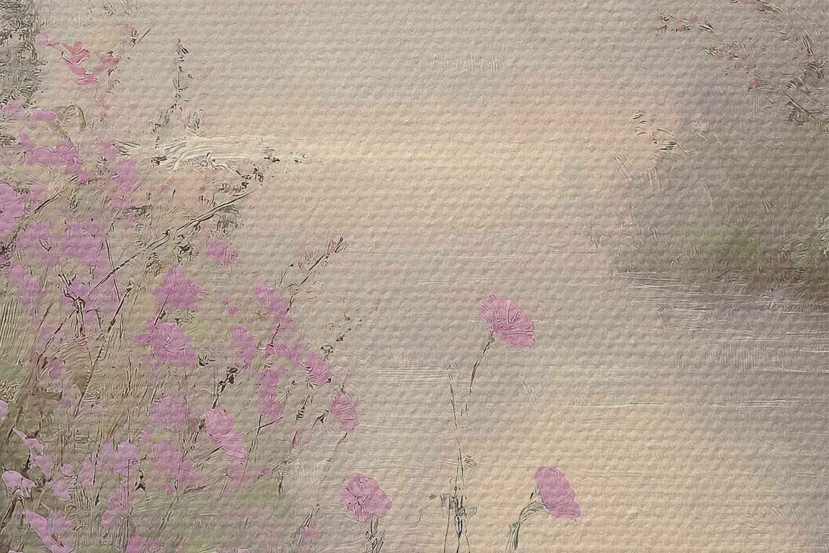 Bild See mit rosa Blumen, Sonnenaufgang, Ölzeichnung, pastellbeige Farben, Nebel Nr r40229