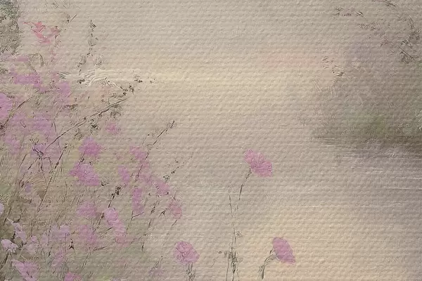 Bild See mit rosa Blumen, Sonnenaufgang, Ölzeichnung, pastellbeige Farben, Nebel Nr r40229