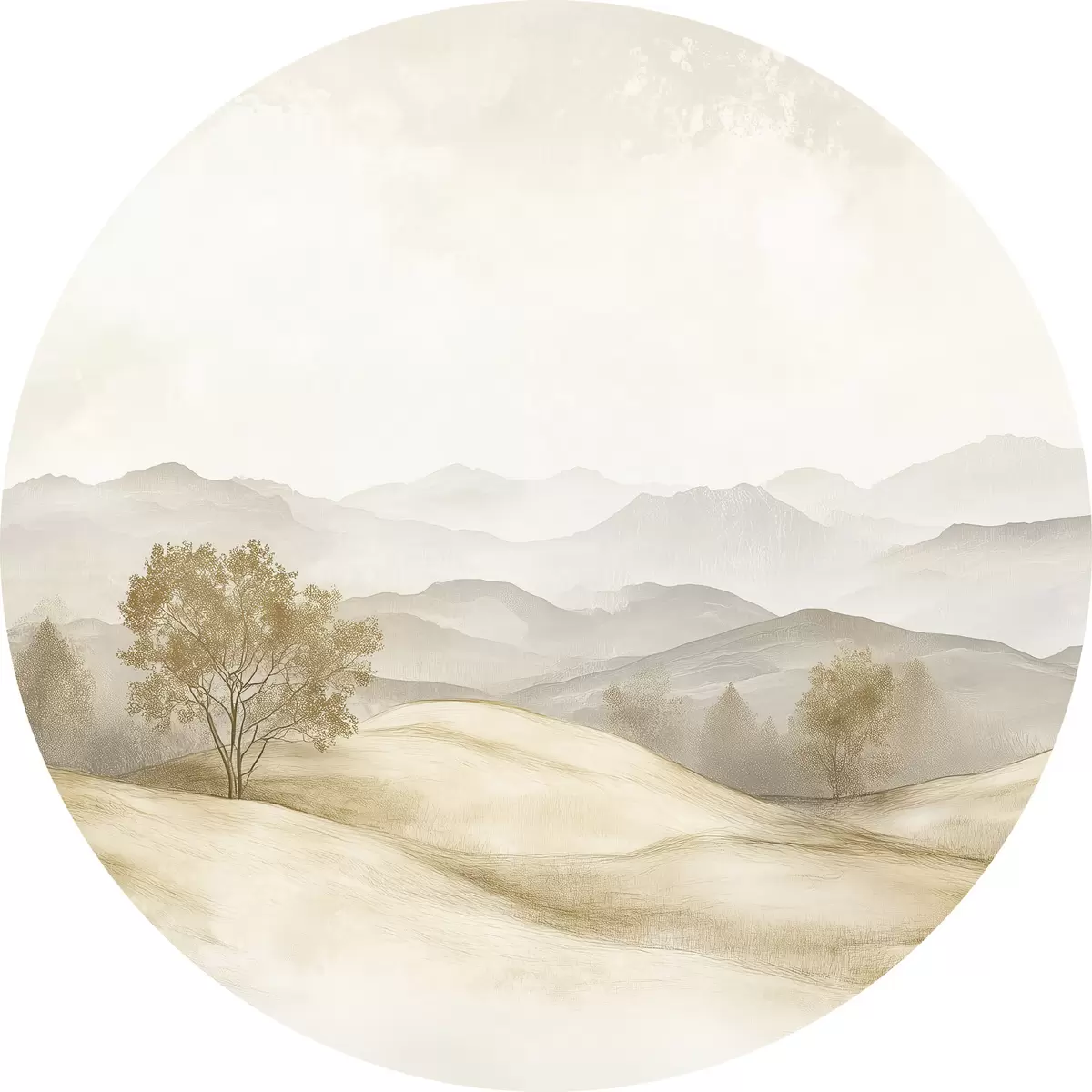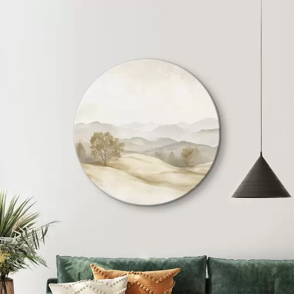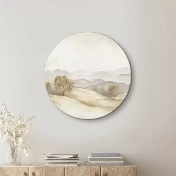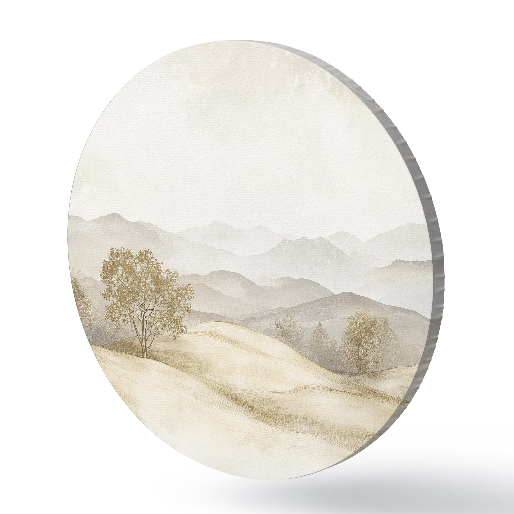 Runde Gemälde Naturlandschaft in beiger Farbpalette, Wiese, Bäume, Aquarellzeichnung r40231