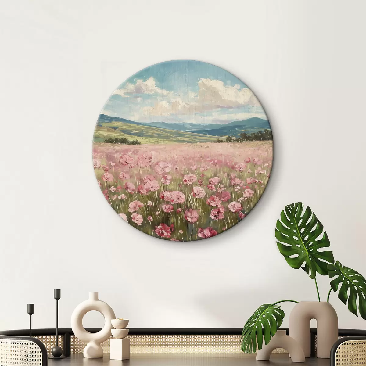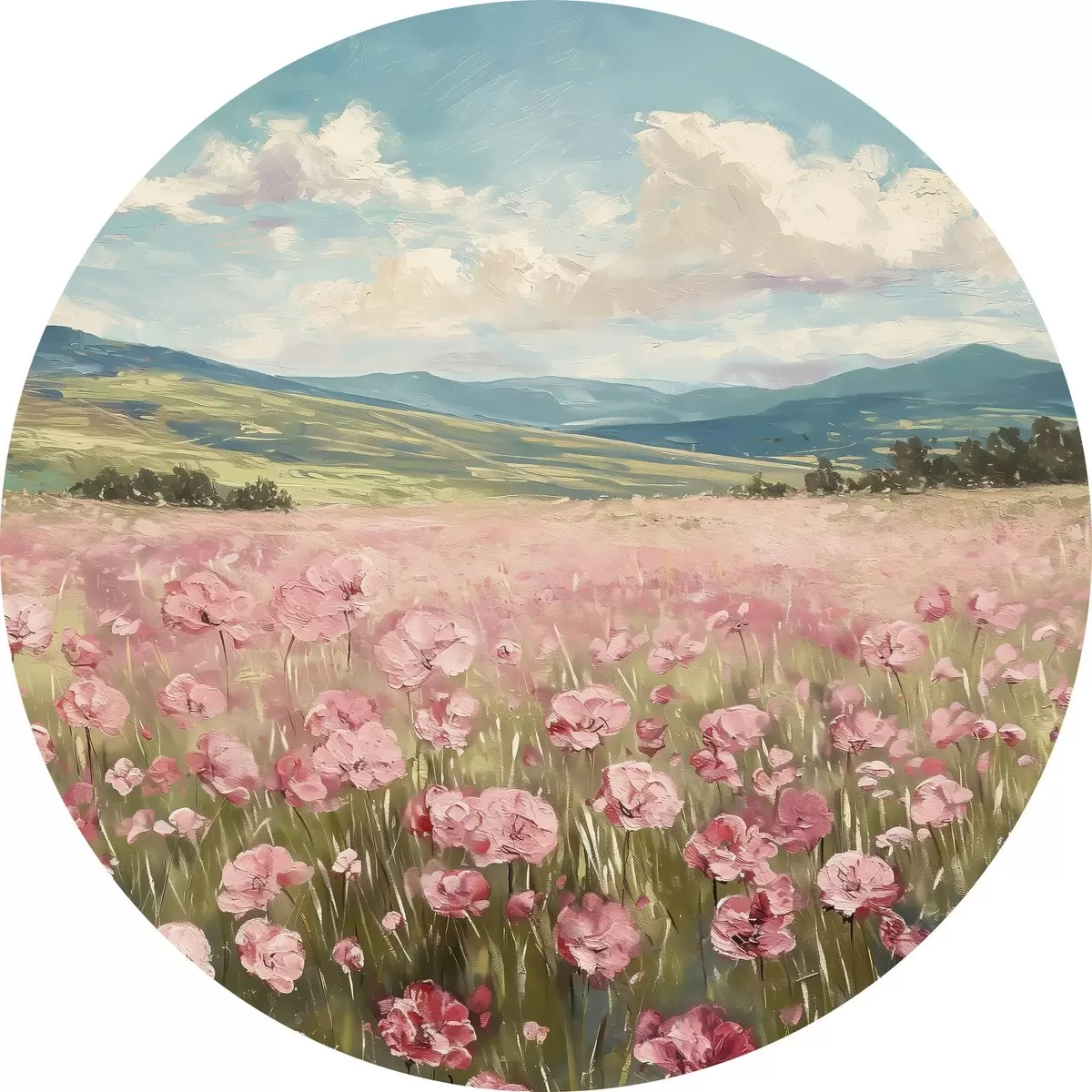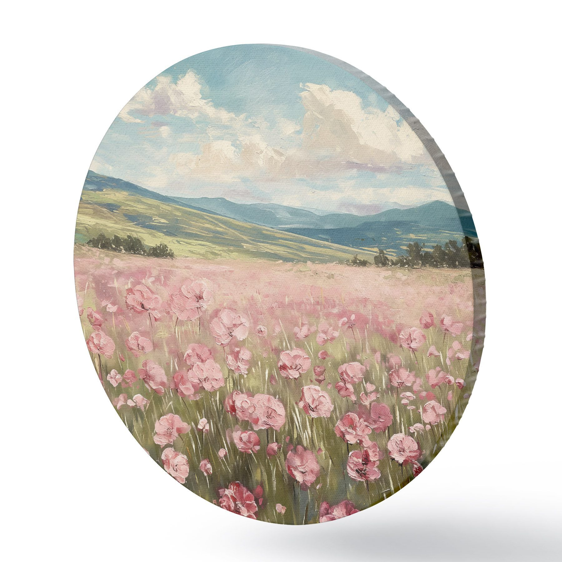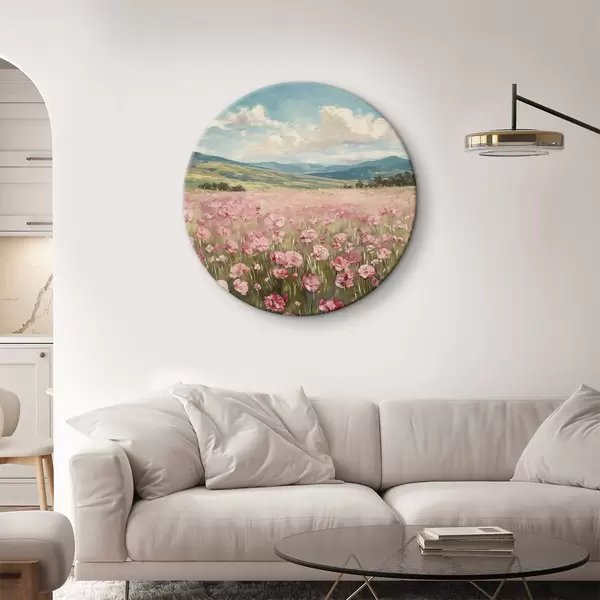 Runde Gemälde Wiese mit rosa Blumen, Berge, Naturlandschaft, blauer Himmel mit Wolken, Acryl r40232