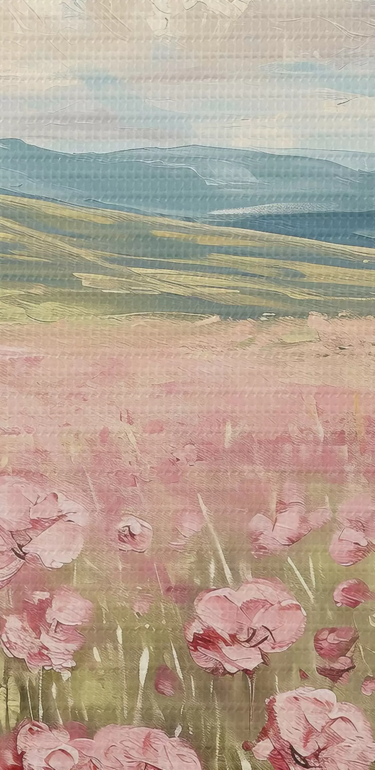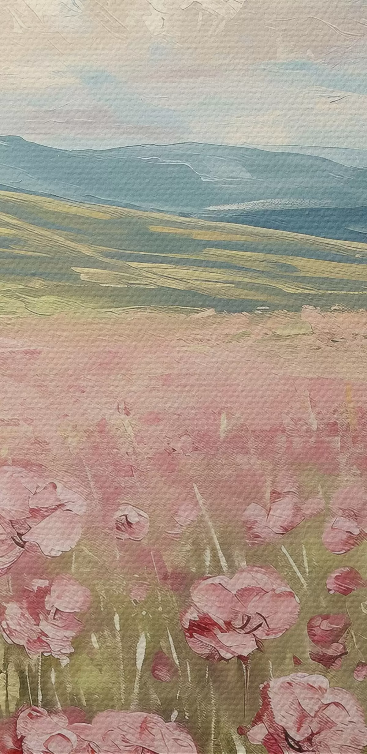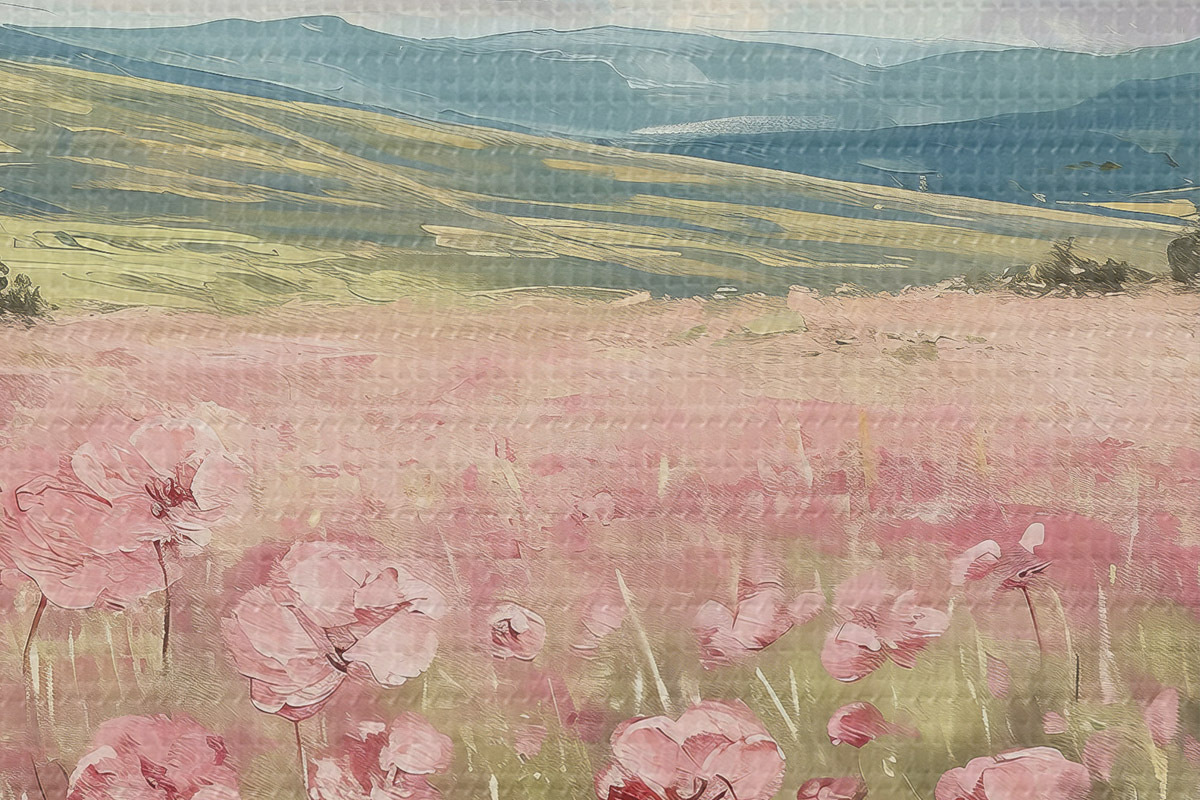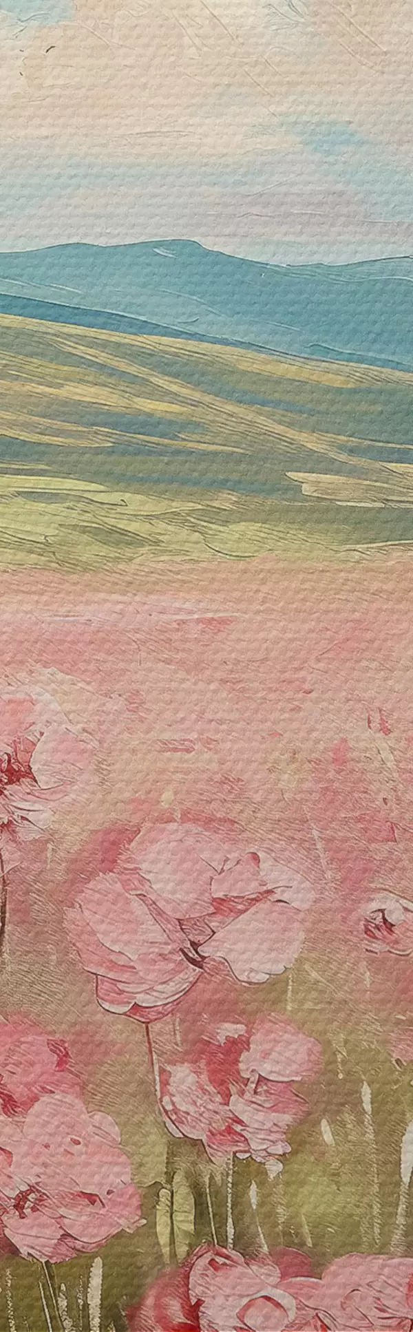 Runde Gemälde Wiese mit rosa Blumen, Berge, Naturlandschaft, blauer Himmel mit Wolken, Acryl r40232
