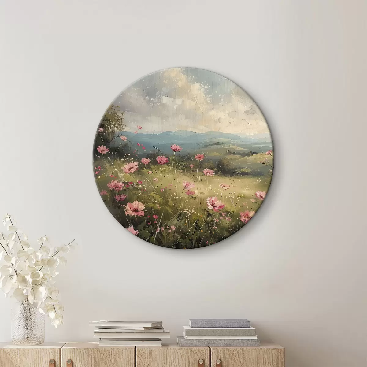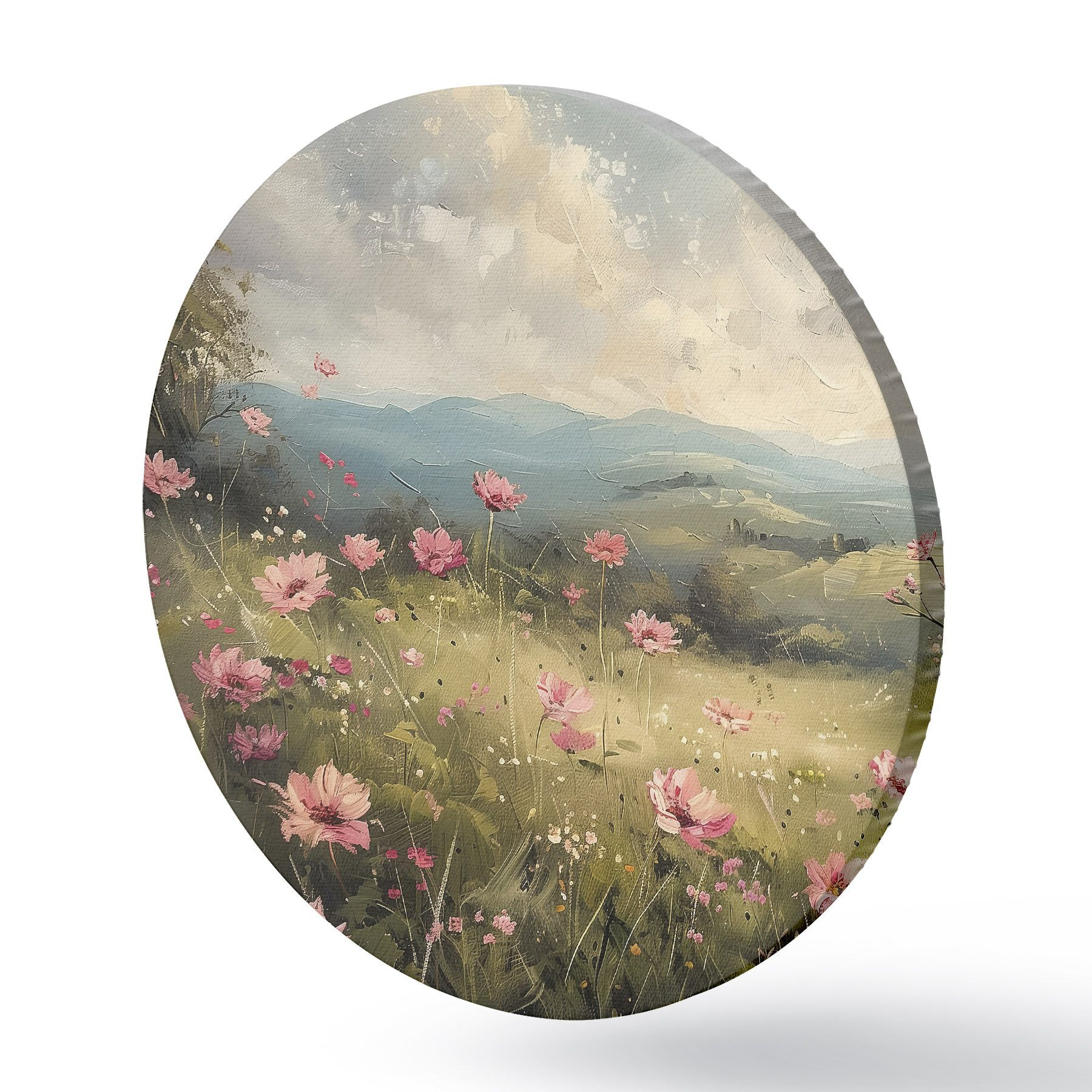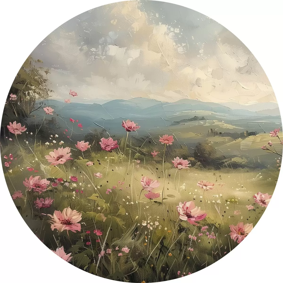 Runde Gemälde Wiese mit rosa Blumen, grünem Gras, Naturlandschaft, Himmel mit Wolken, Acrylzeichnung r40234