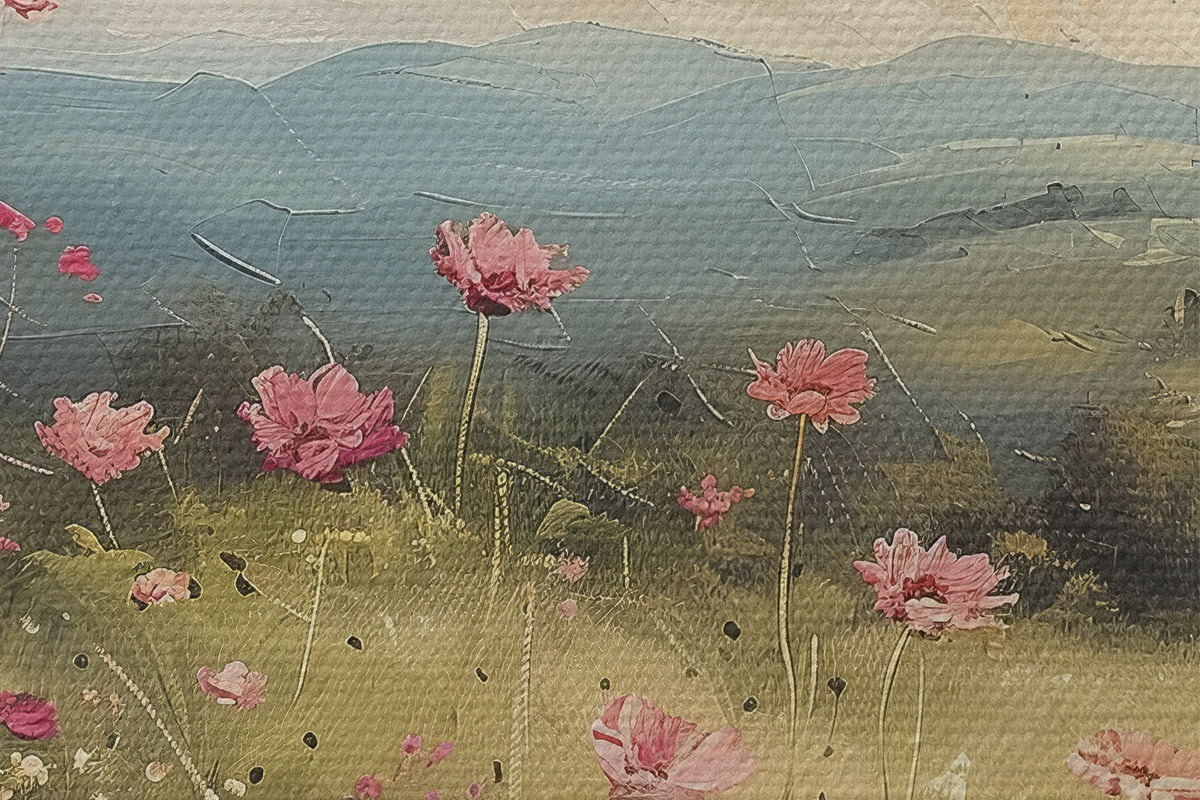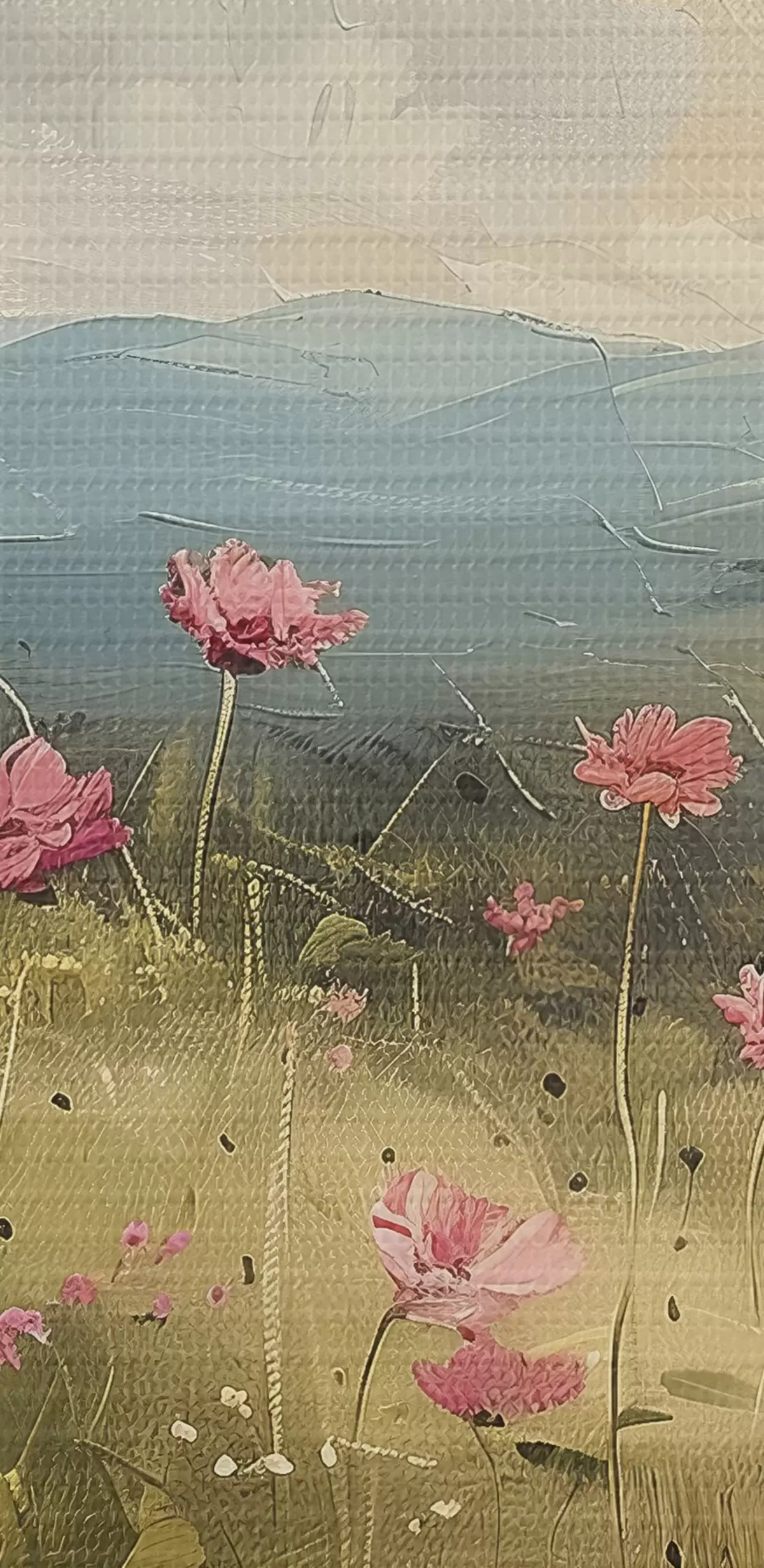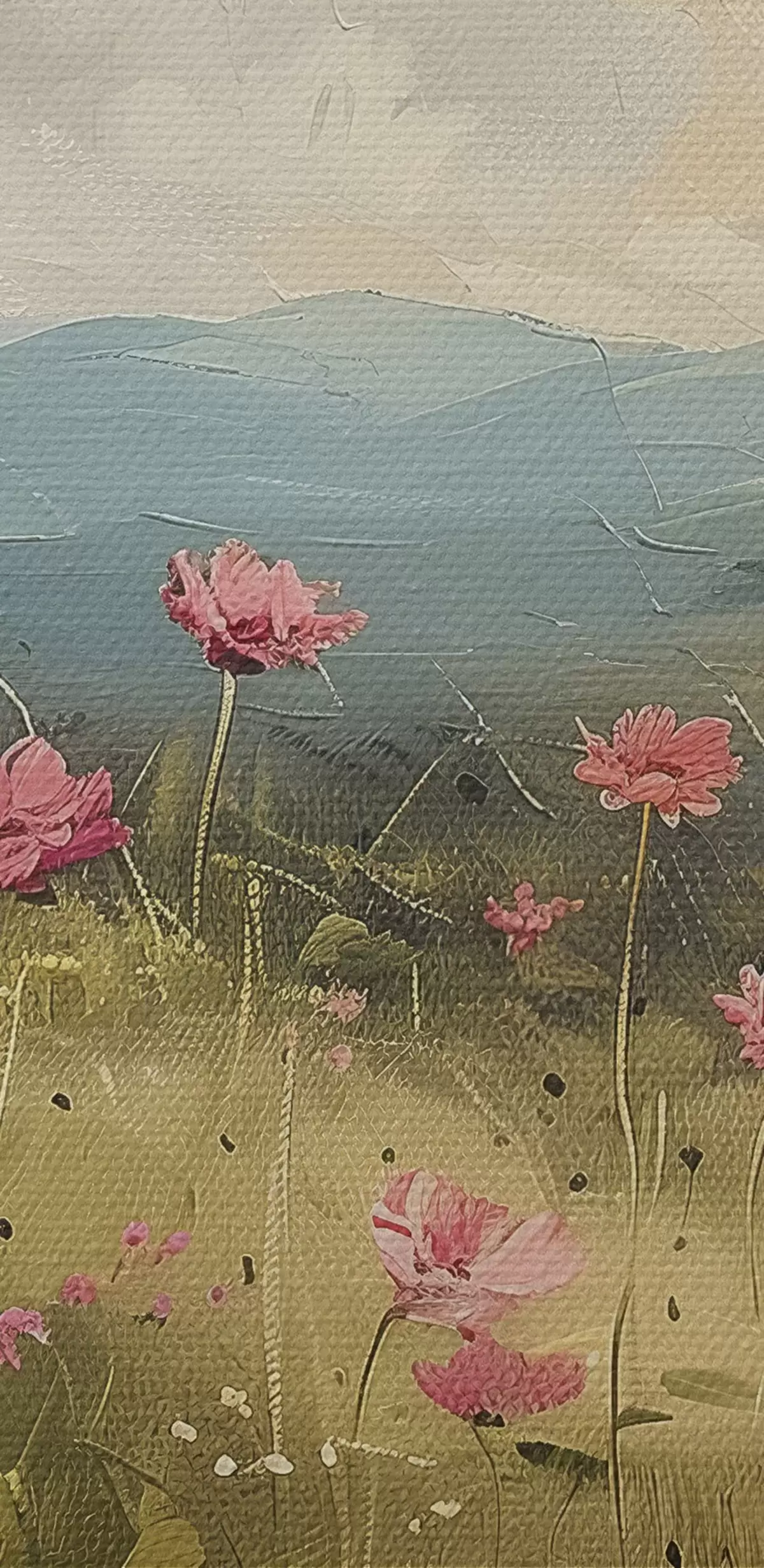 Bild Wiese mit rosa Blumen, grünem Gras, Naturlandschaft, Himmel mit Wolken, Acrylzeichnung Nr r40234