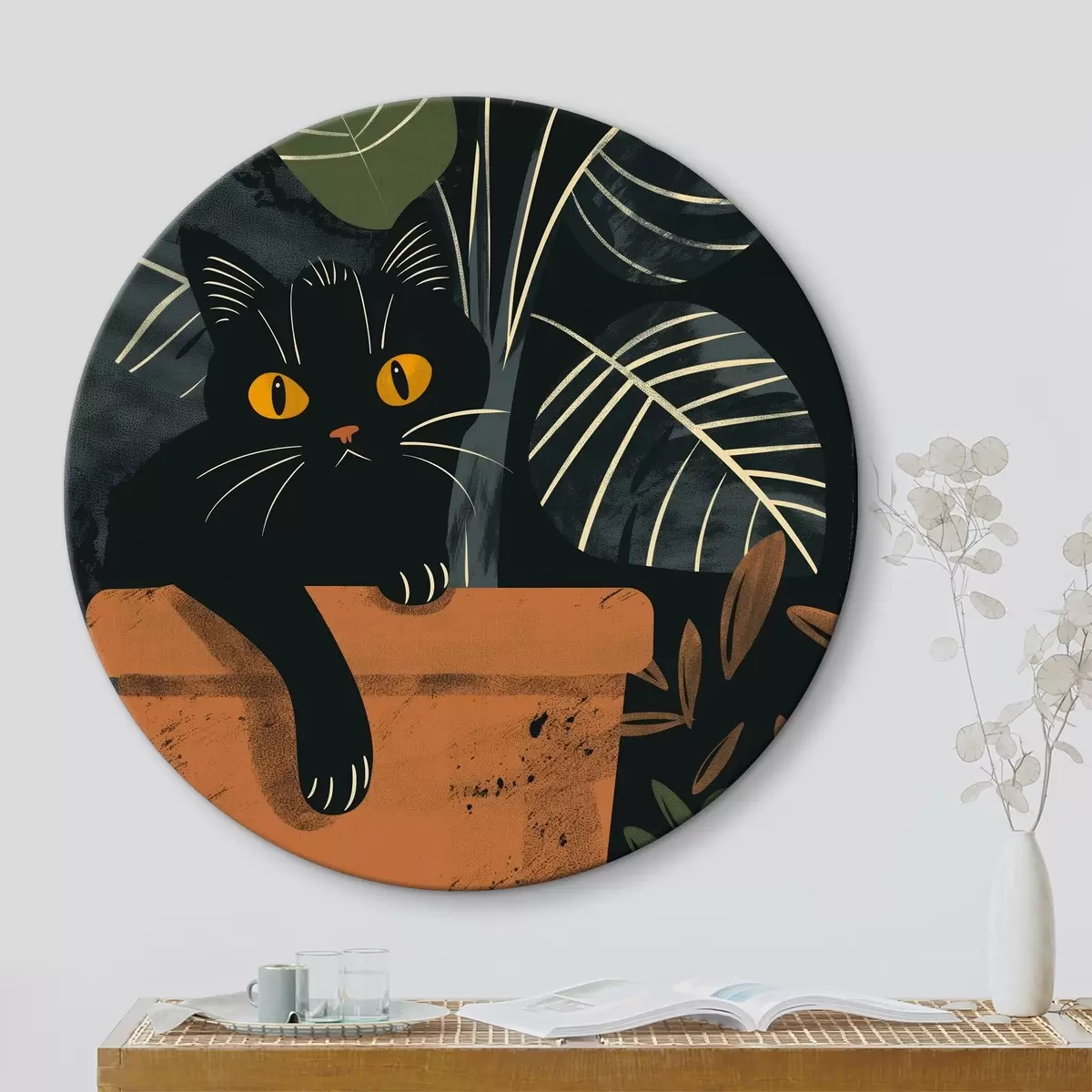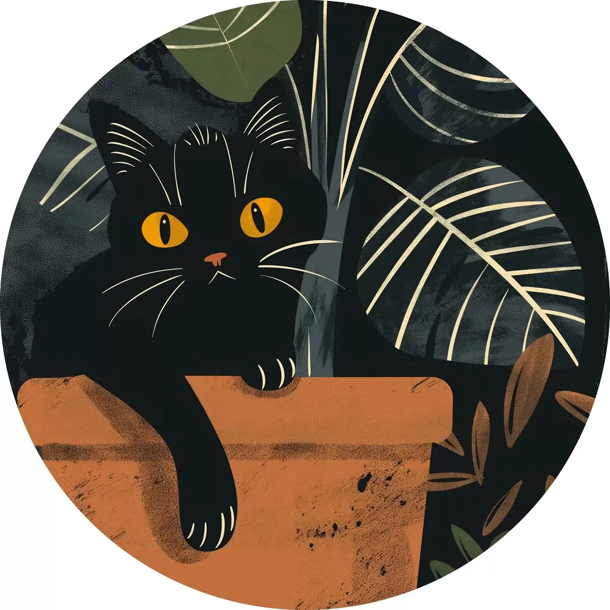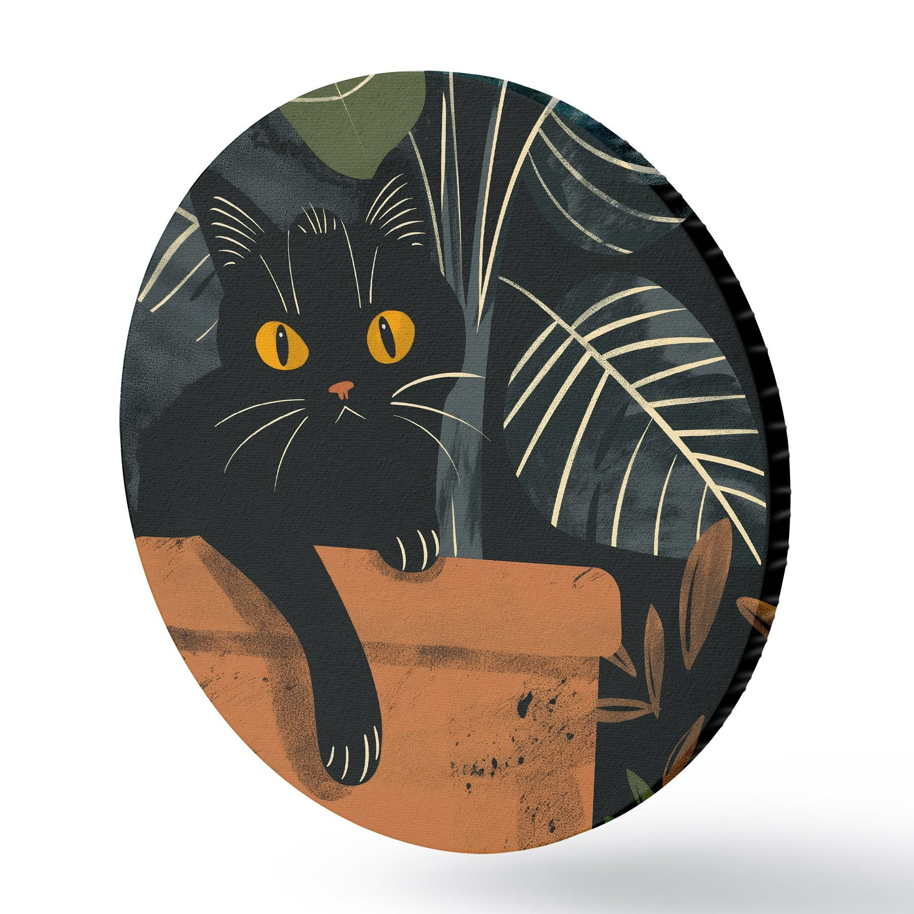 Runde Gemälde Katze in einem Topf mit einer Blume r40268