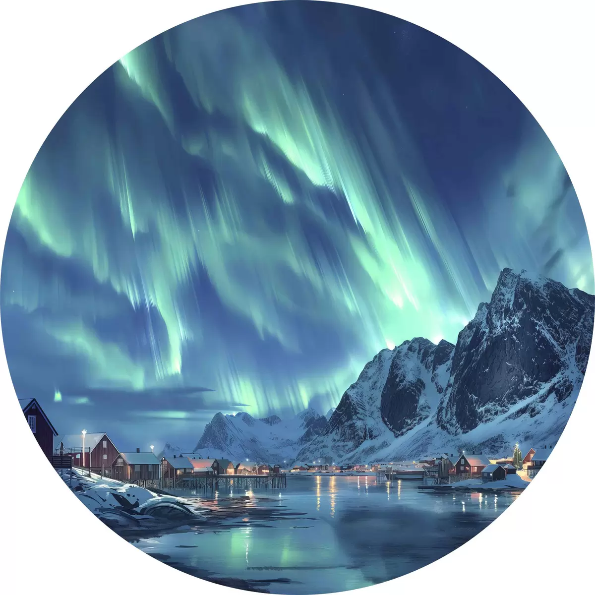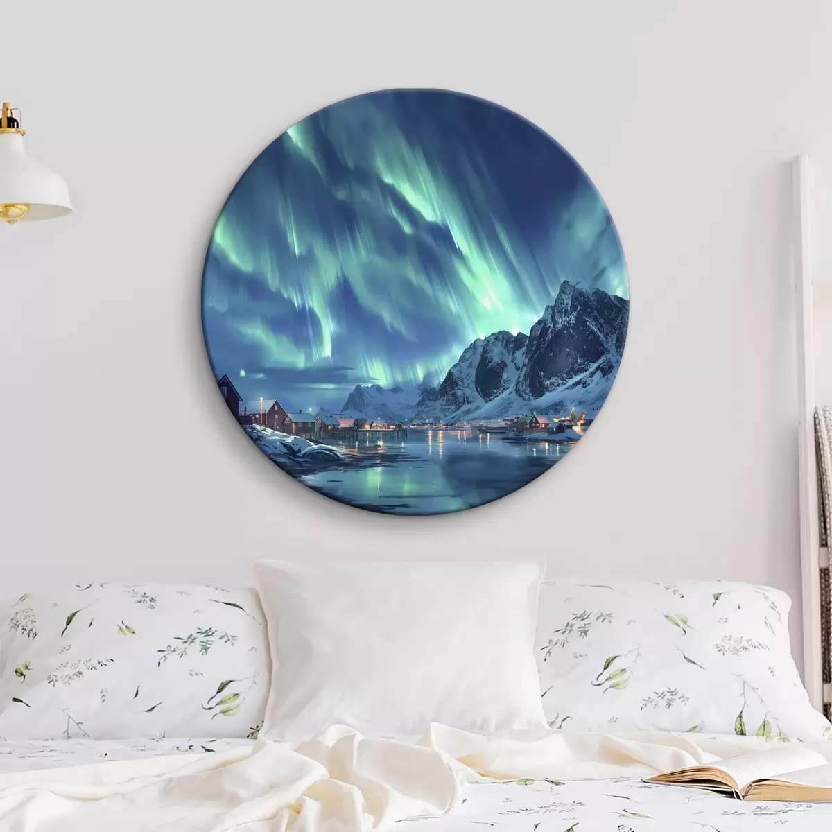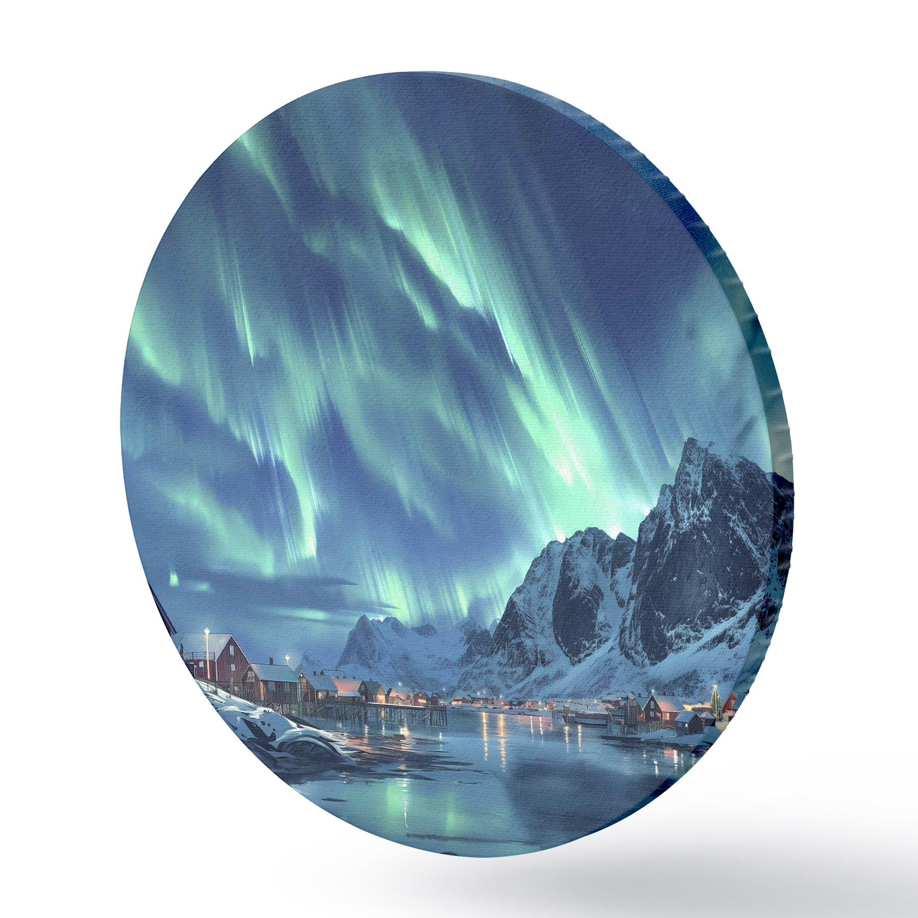 Runde Gemälde Norwegen Winterdorf, Nordlicht, Nachthimmel r40300