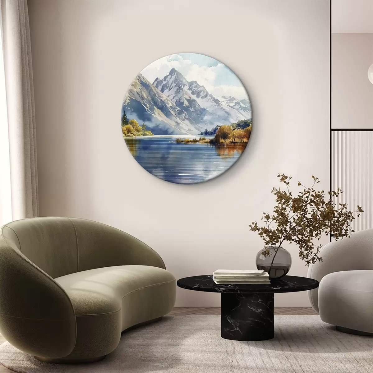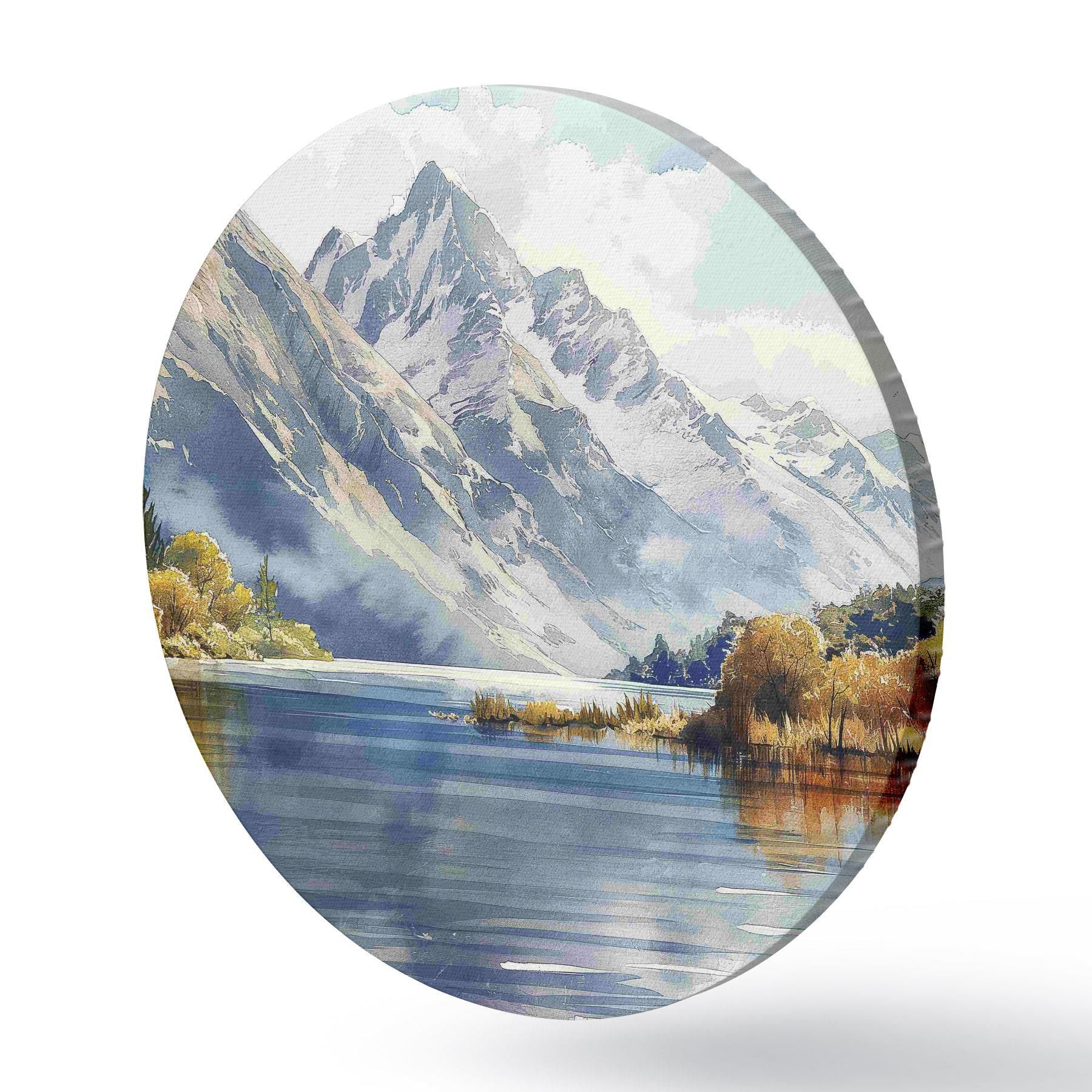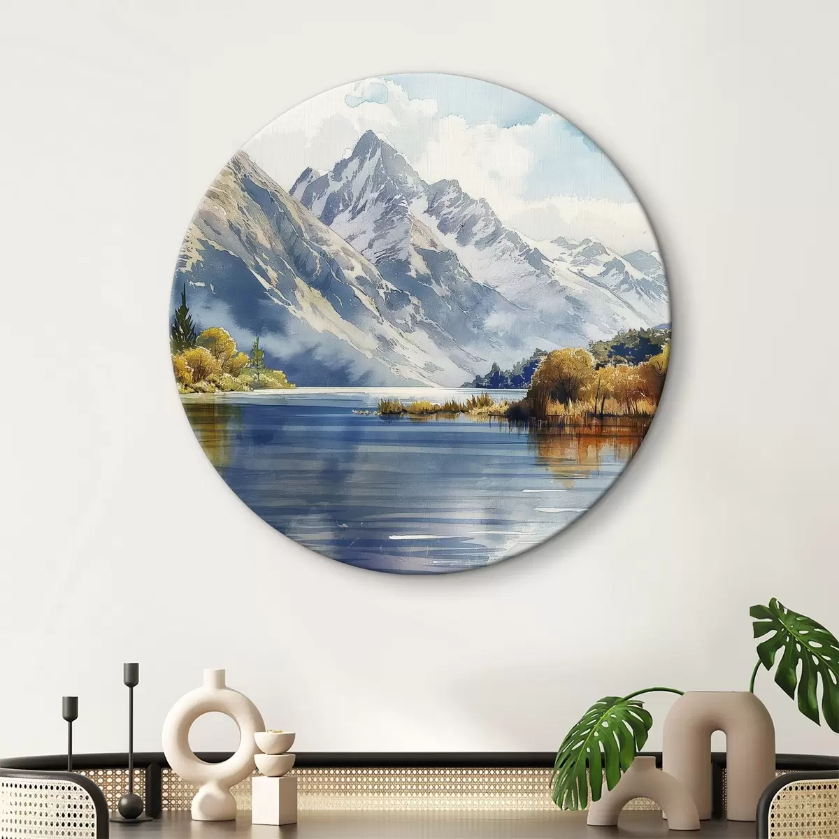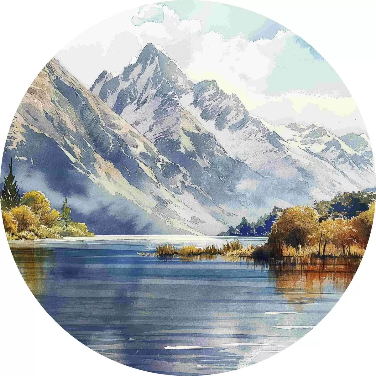Runde Gemälde Herbstlandschaft mit Bergen, Fluss und Bäumen r40309