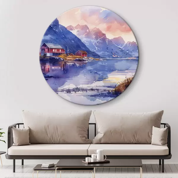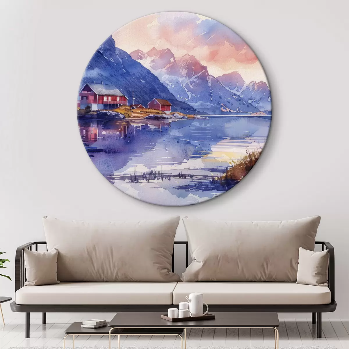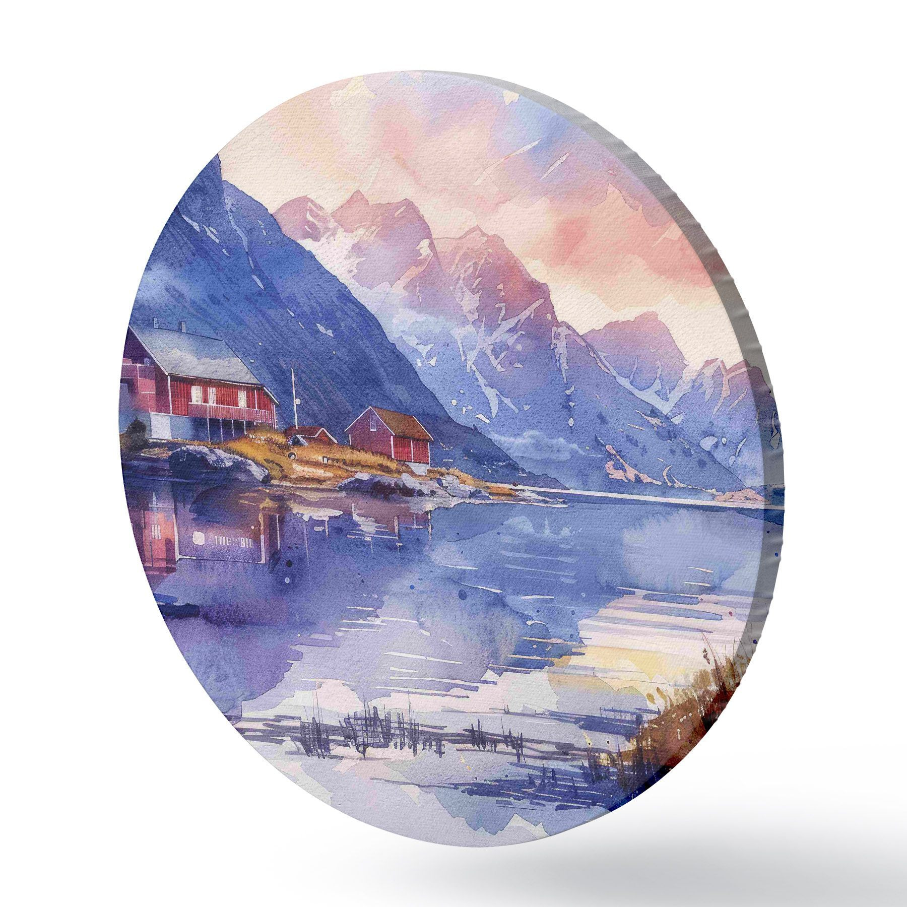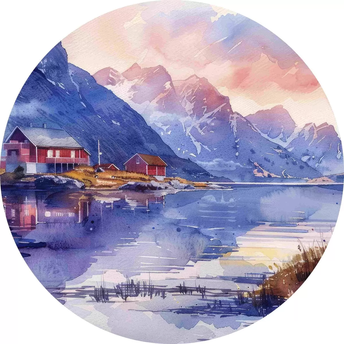 Runde Gemälde Norwegisches Dorf, Sonnenuntergang Himmel, ruhigen Fluss, Berge, Aquarell r40311