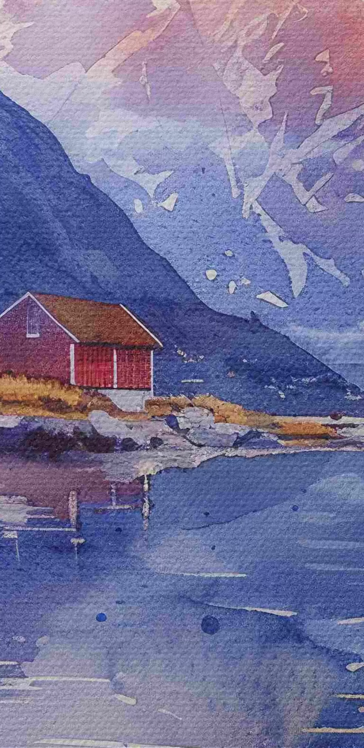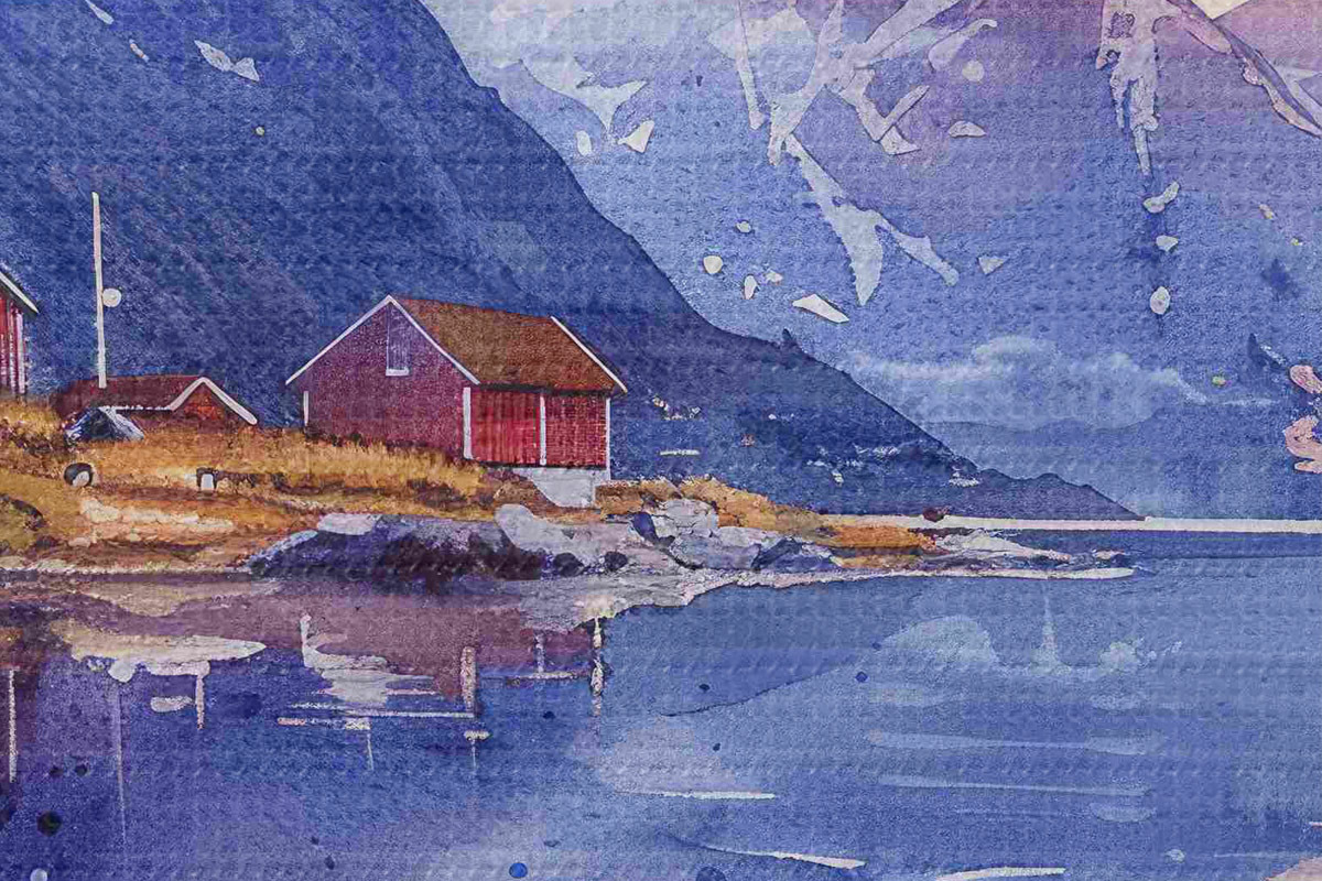 Bild Norwegisches Dorf, Sonnenuntergang Himmel, ruhigen Fluss, Berge, Aquarell Nr r40311