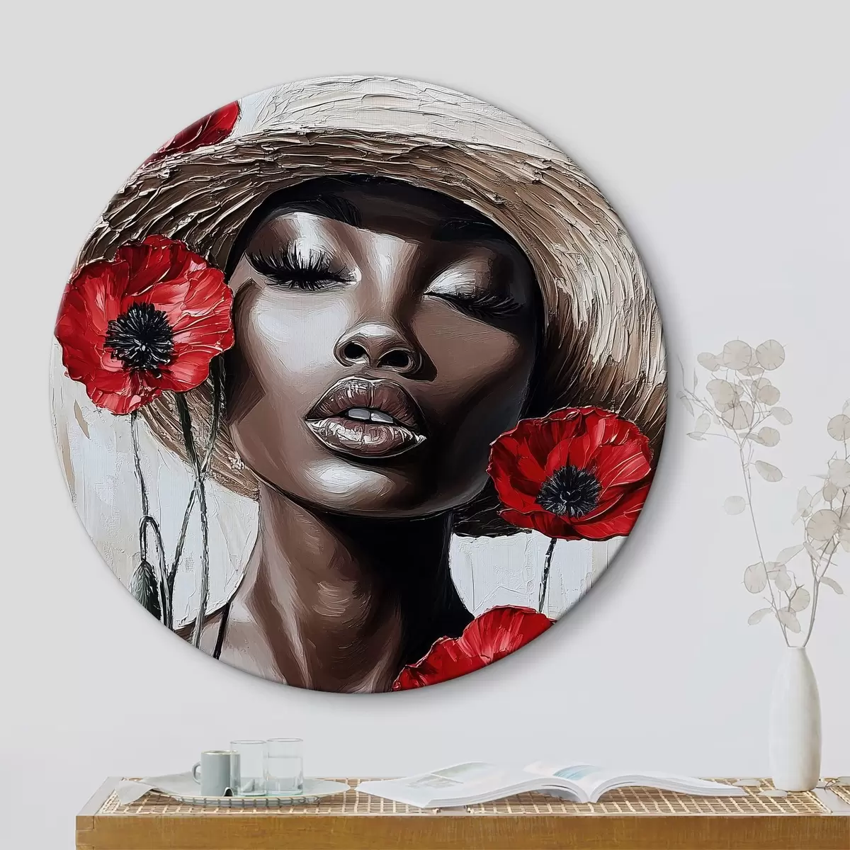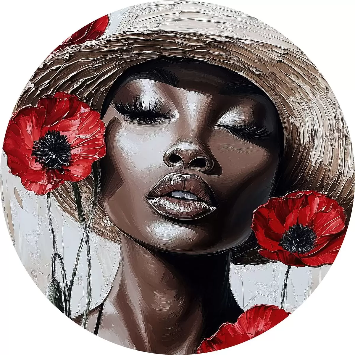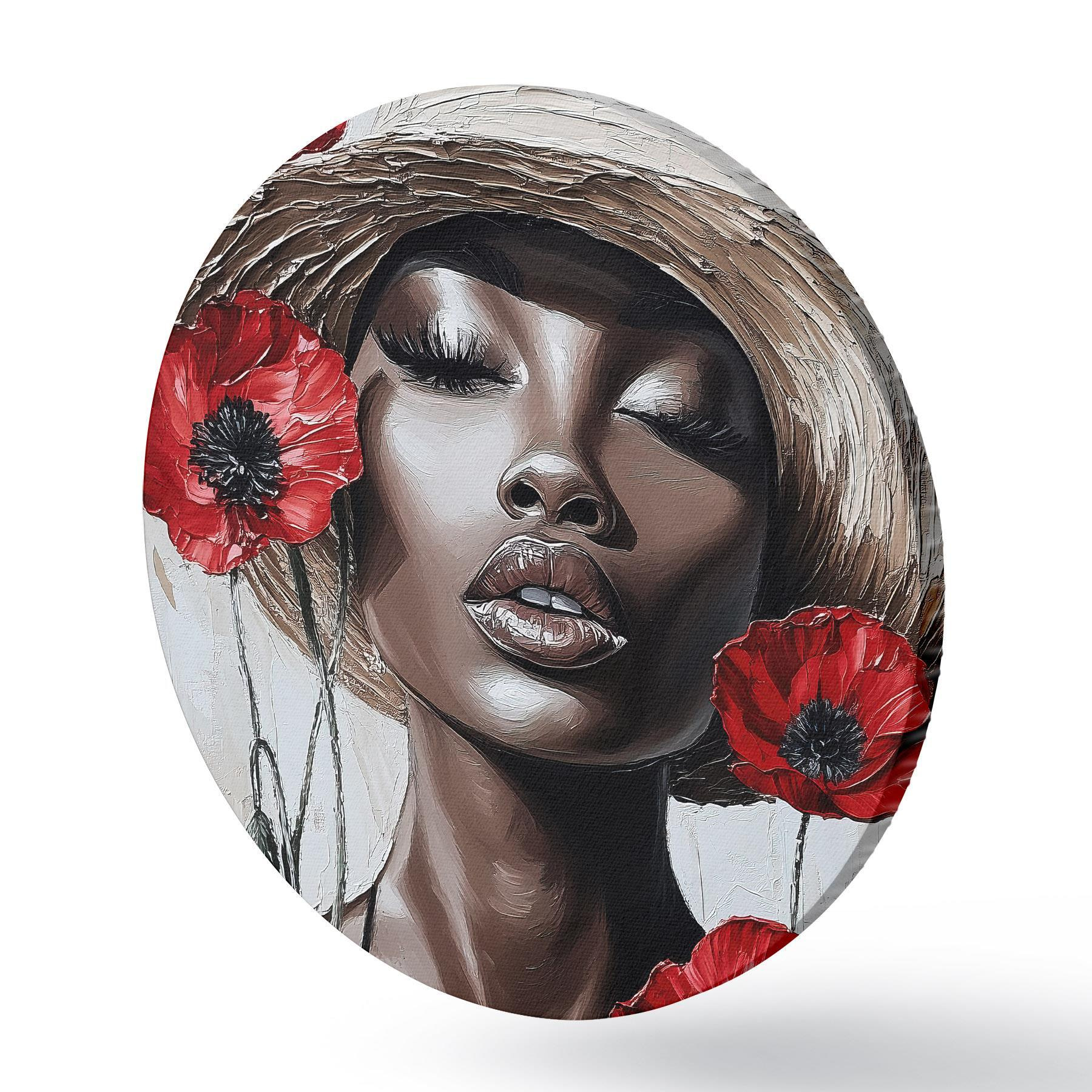 Runde Gemälde Porträt einer Frau mit Hut und roten Mohnblumen r40350