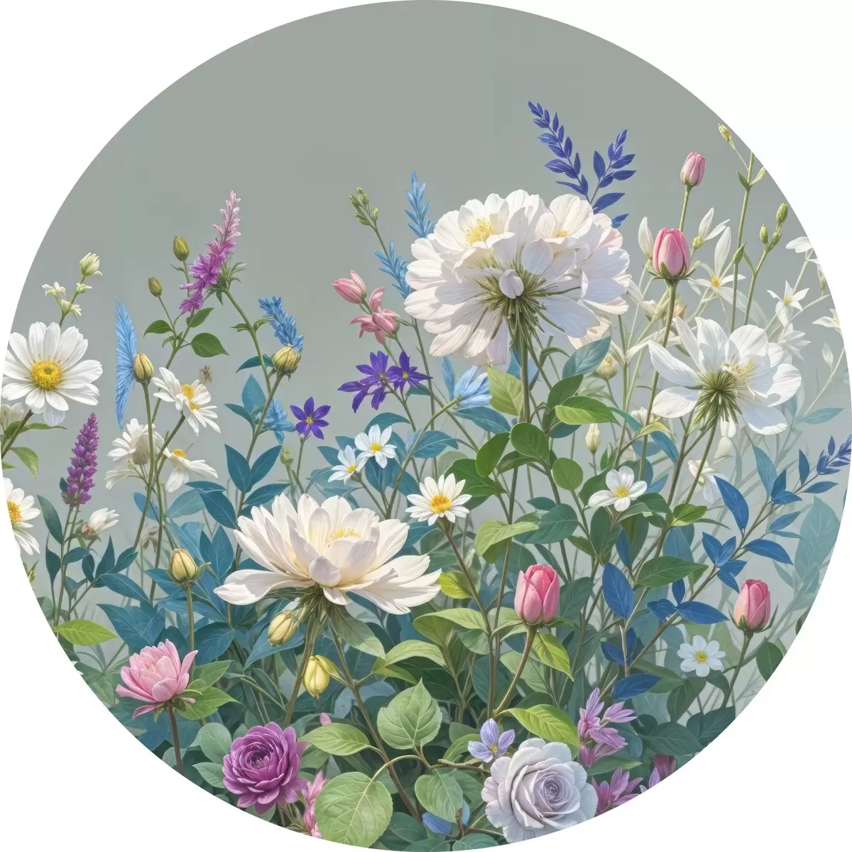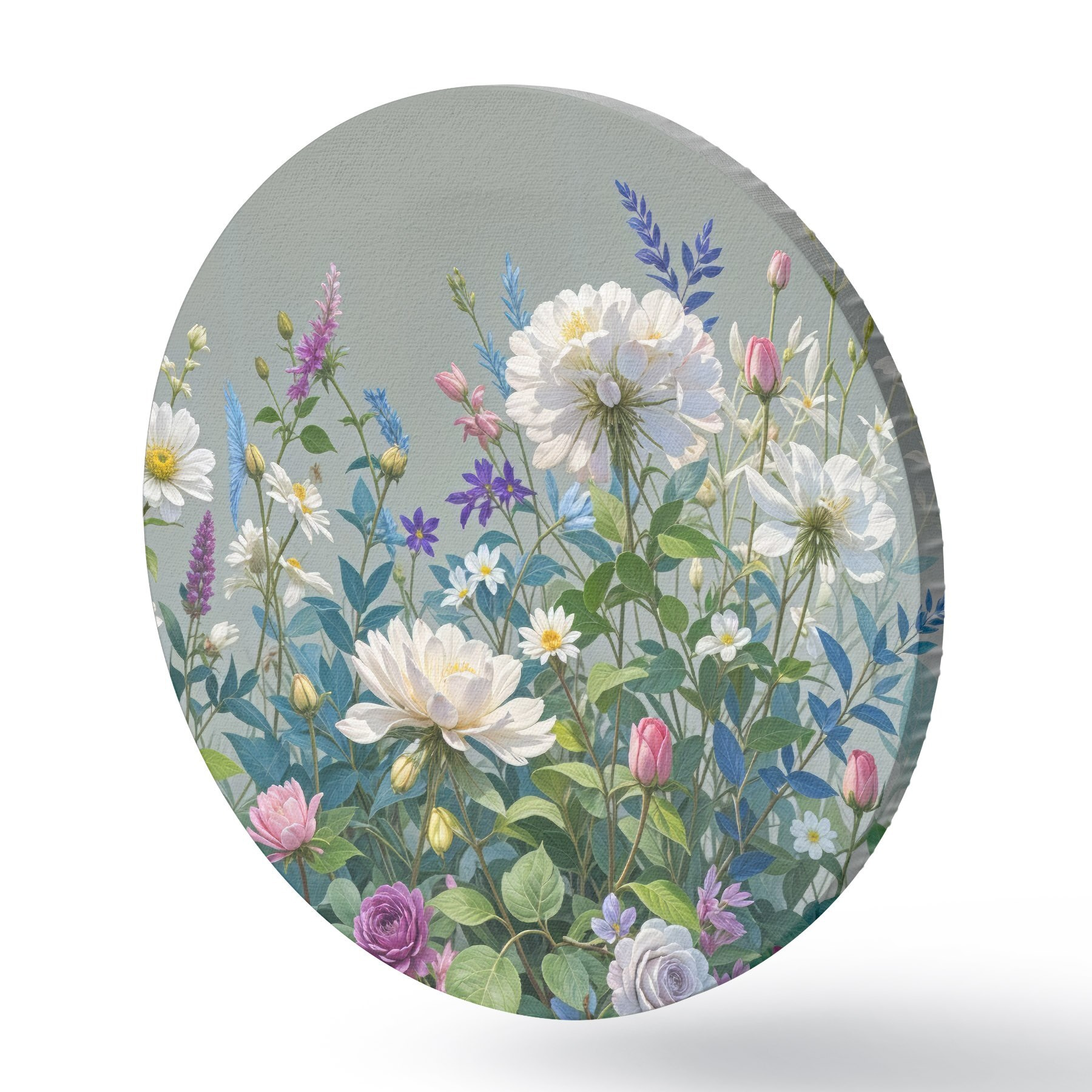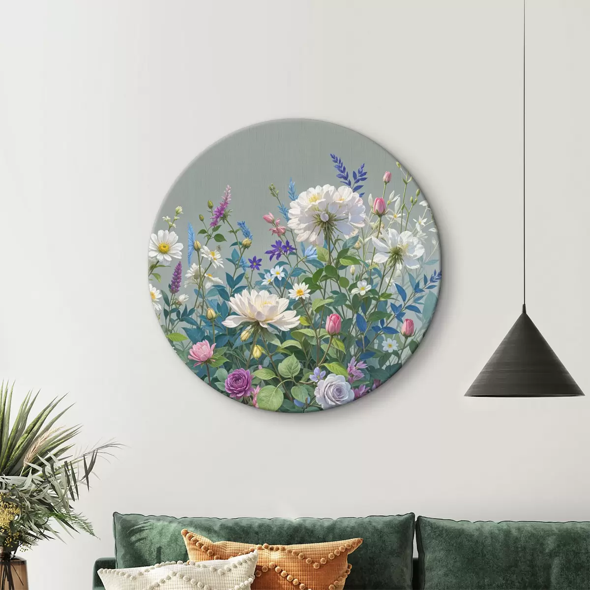 Runde Gemälde Ein üppiger, lebendiger Garten mit einer Vielzahl bunter Blumen und blühender Pflanzen vor einem grauen Hintergrund r40393