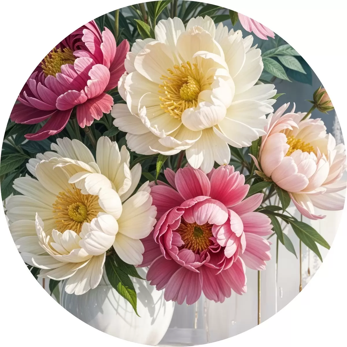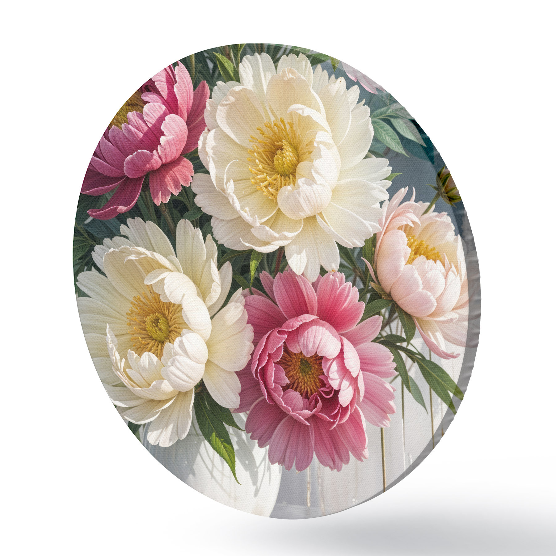 Runde Gemälde Ein Strauß lebendiger Pfingstrosenblüten in verschiedenen Rosa-, Weiß- und Gelbtönen mit Farbspritzern r40403