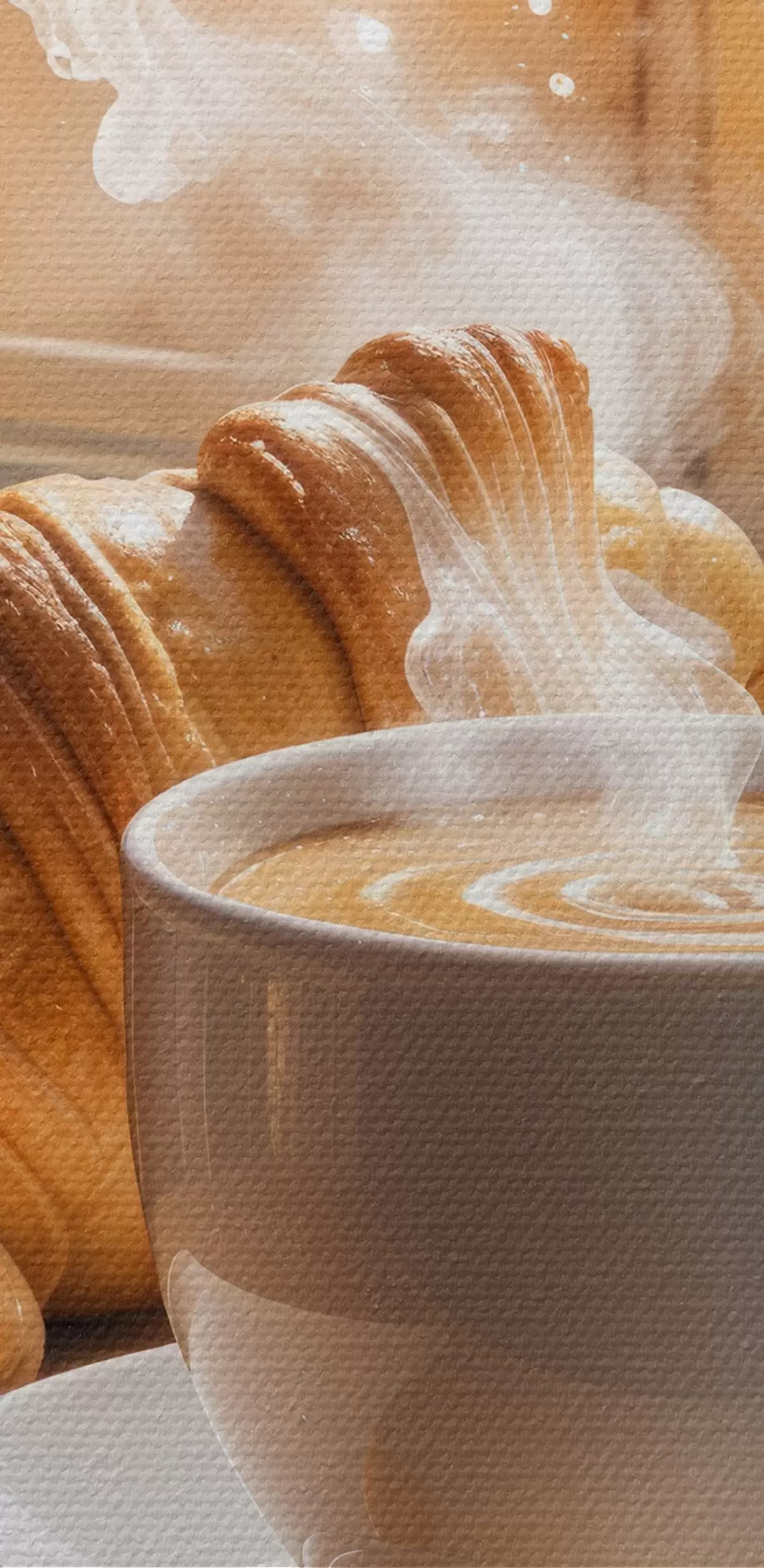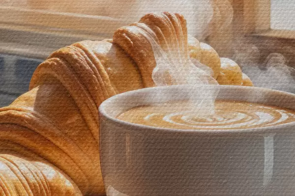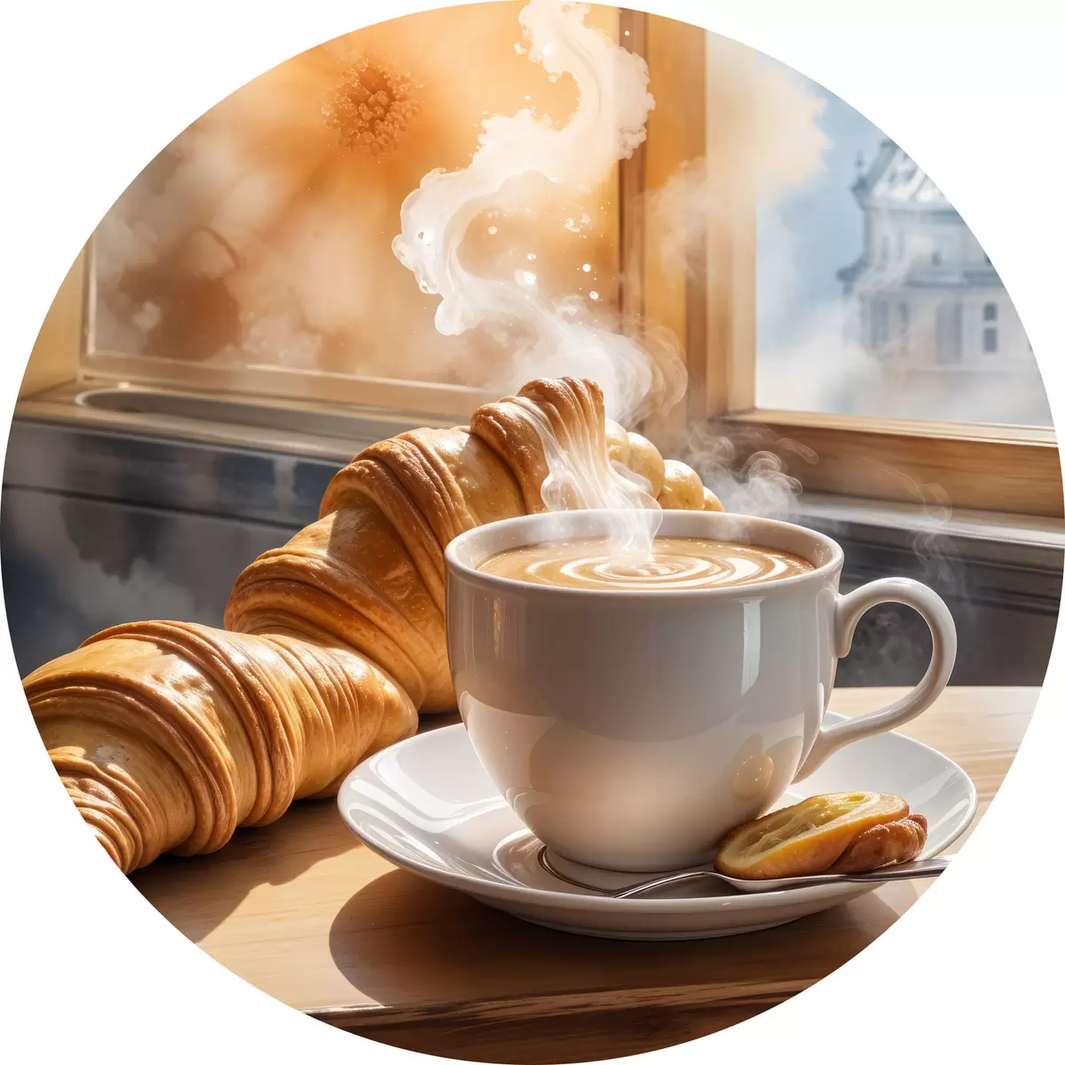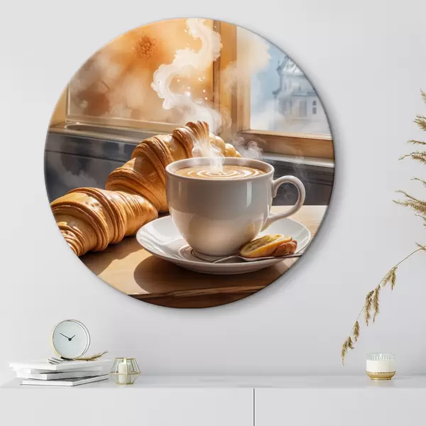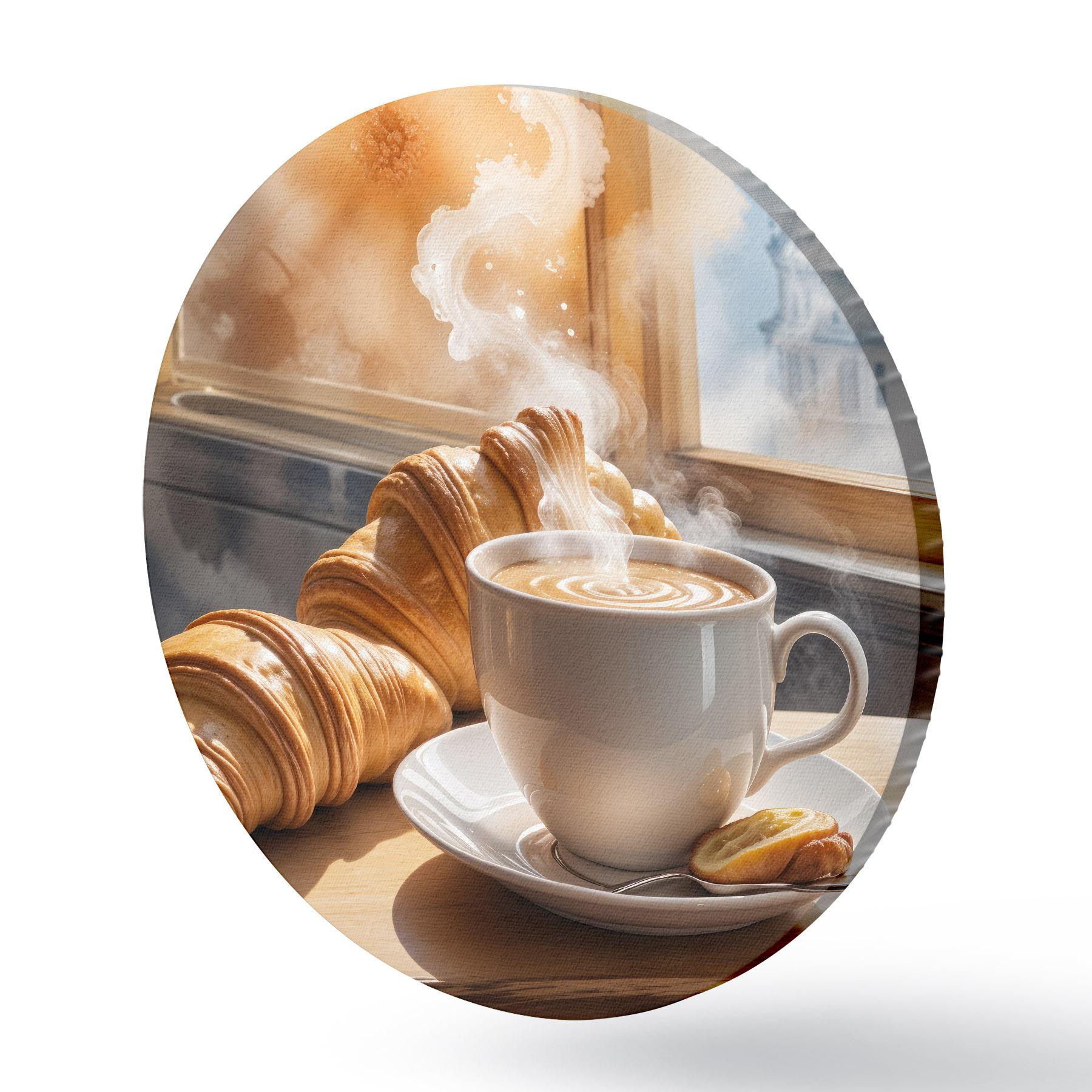 Runde Gemälde Eine warme Tasse Kaffee mit aufsteigendem Dampf, auf einem Tisch neben einem Croissant platziert, mit Blick auf ein historisches Gebäude r40405