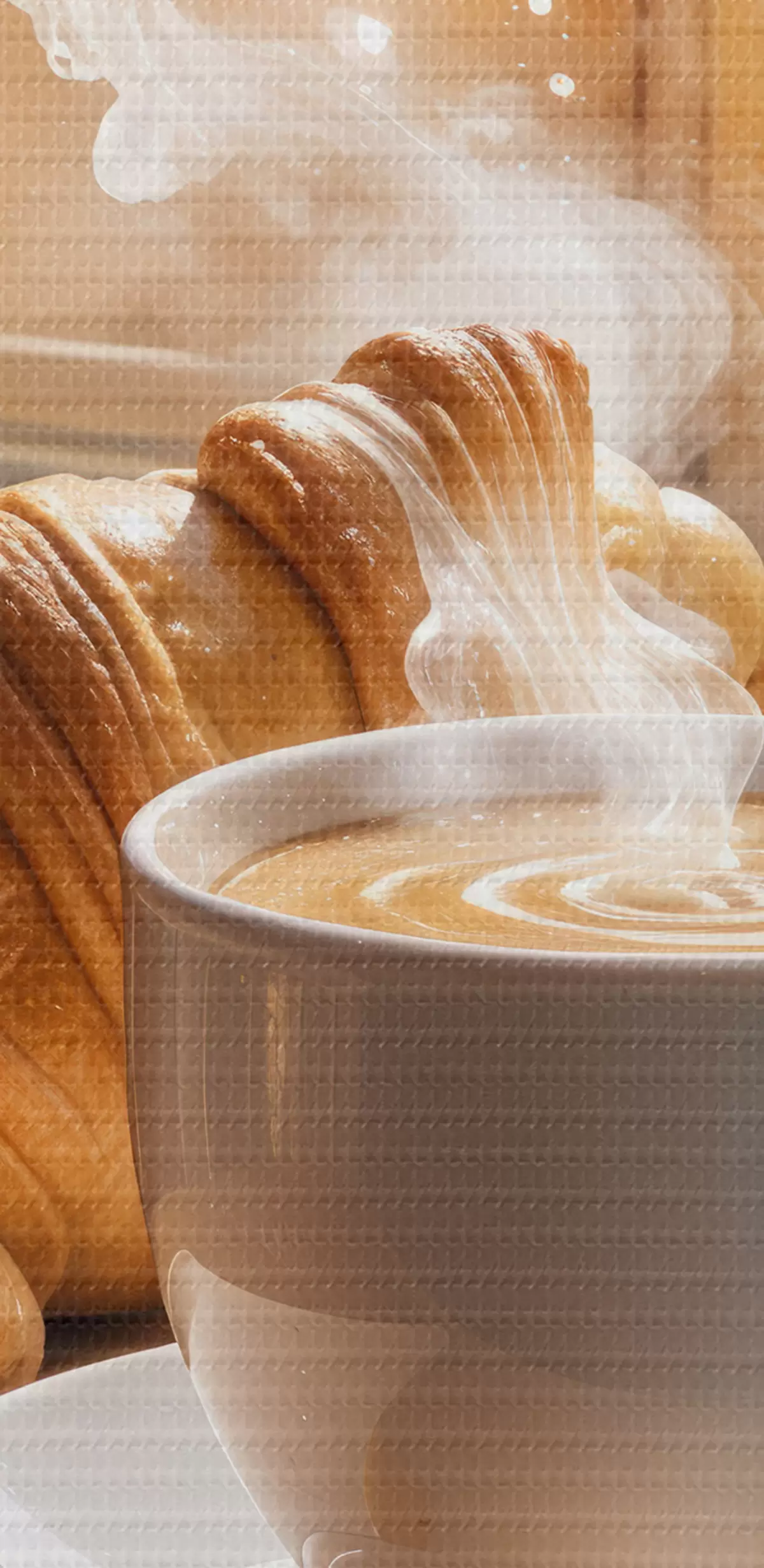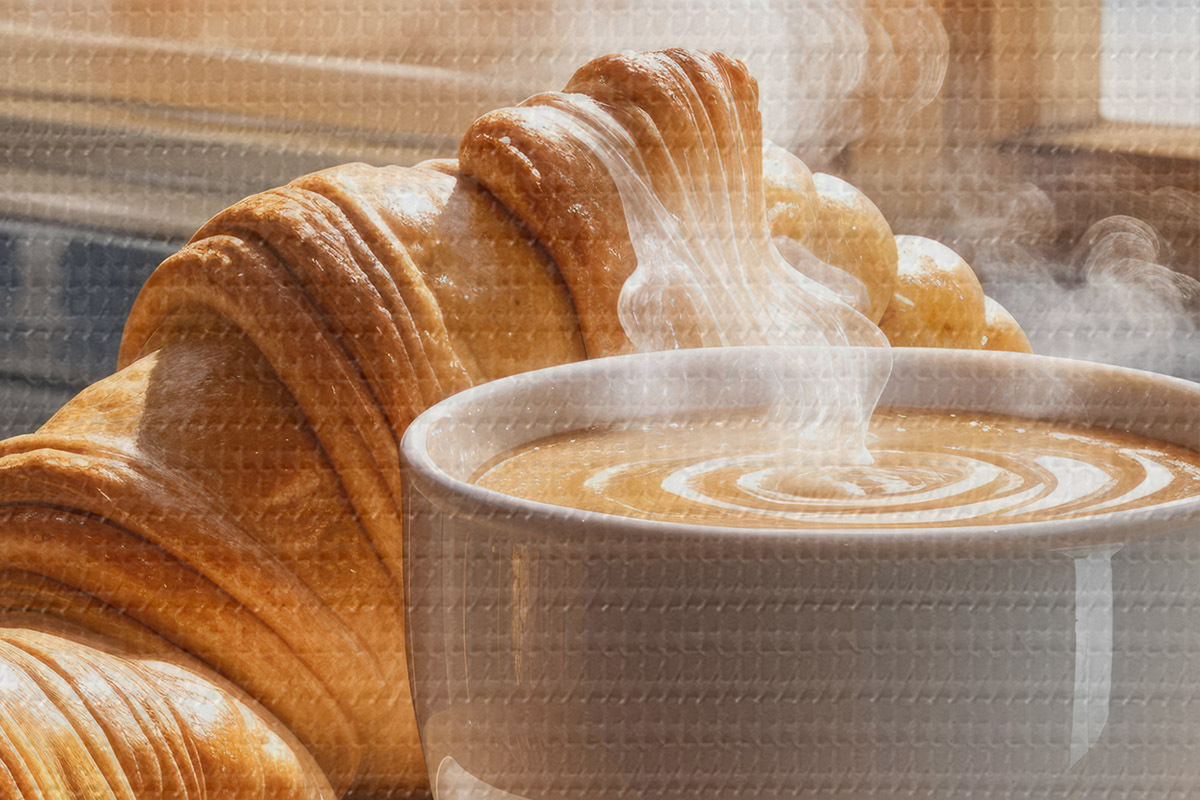 Bild Eine warme Tasse Kaffee mit aufsteigendem Dampf, auf einem Tisch neben einem Croissant platziert, mit Blick auf ein historisches Gebäude Nr r40405