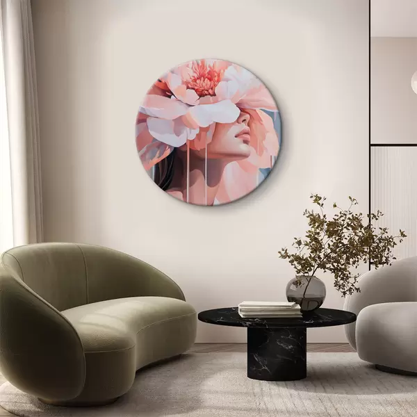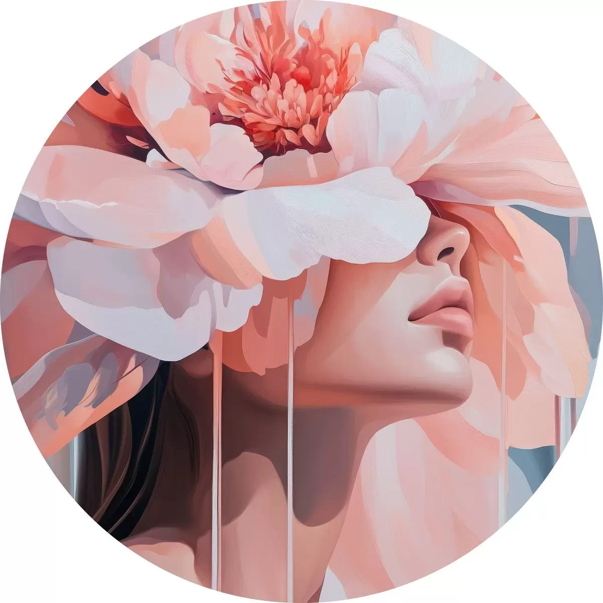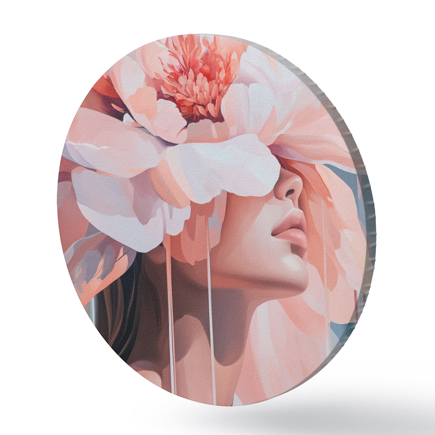 Runde Gemälde Porträt einer Frau mit einer großen rosa Blume auf dem Kopf r40430