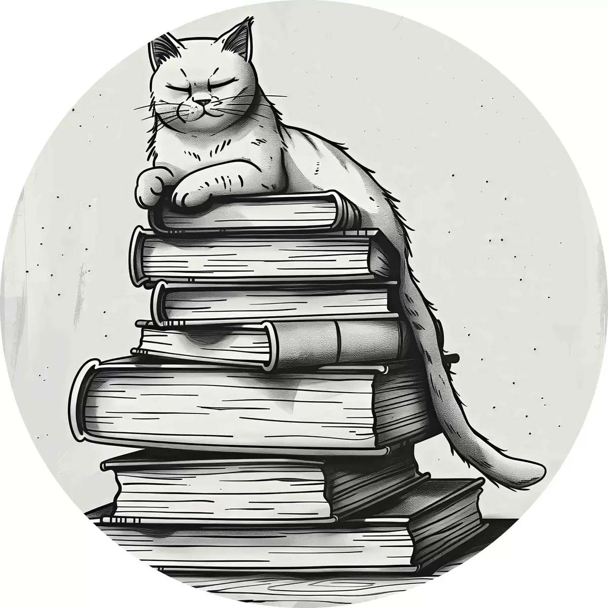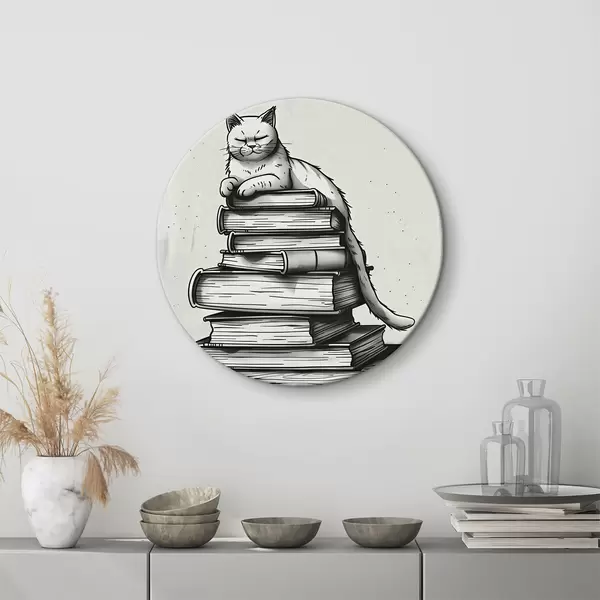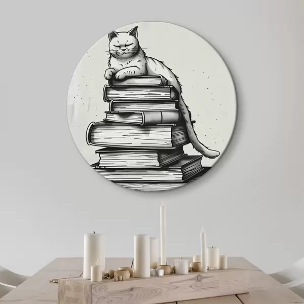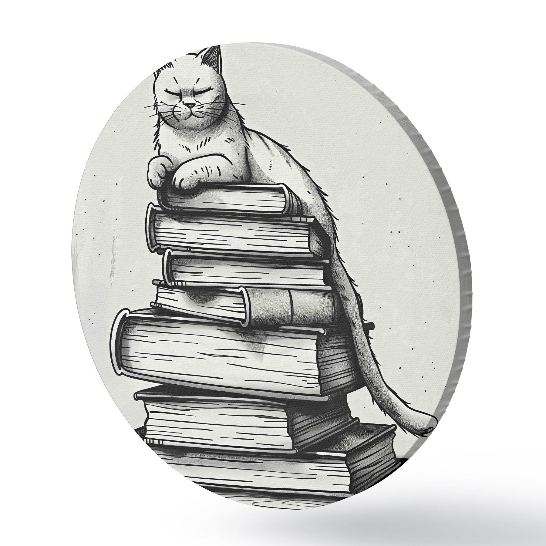 Runde Gemälde Schwarze und weiße Katze auf einem Bücherstapel r40435