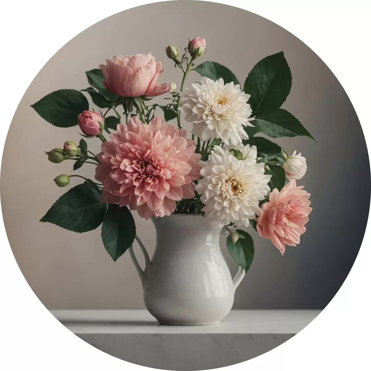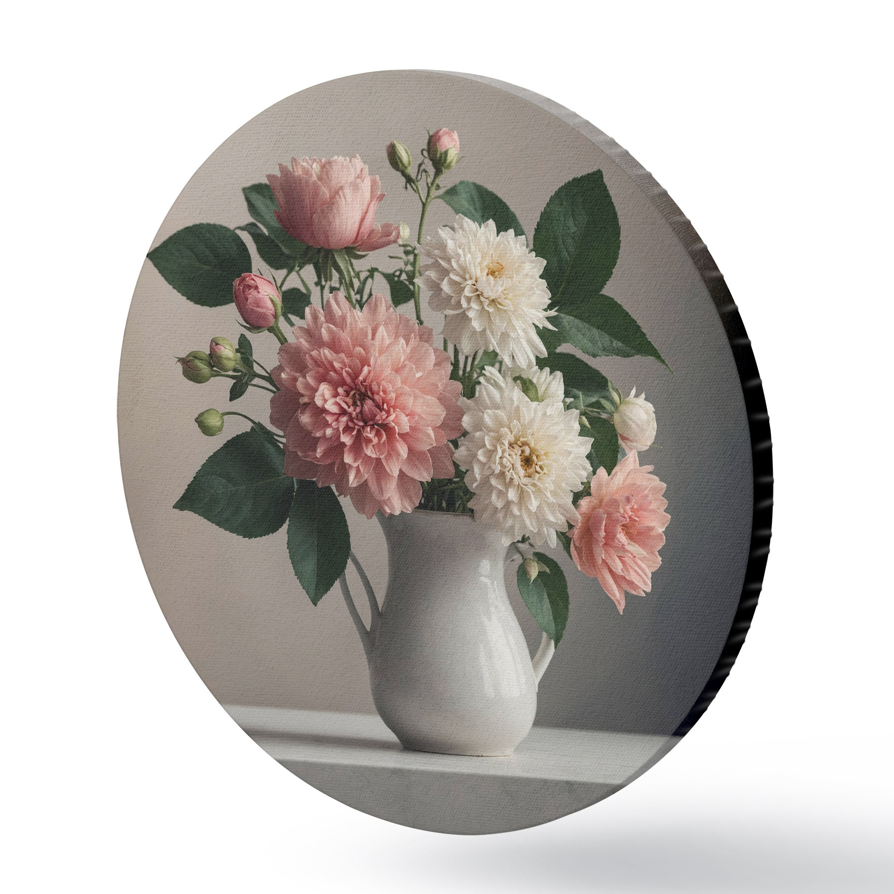 Runde Gemälde Blumen in einer weißen Vase auf dem Tisch r40472