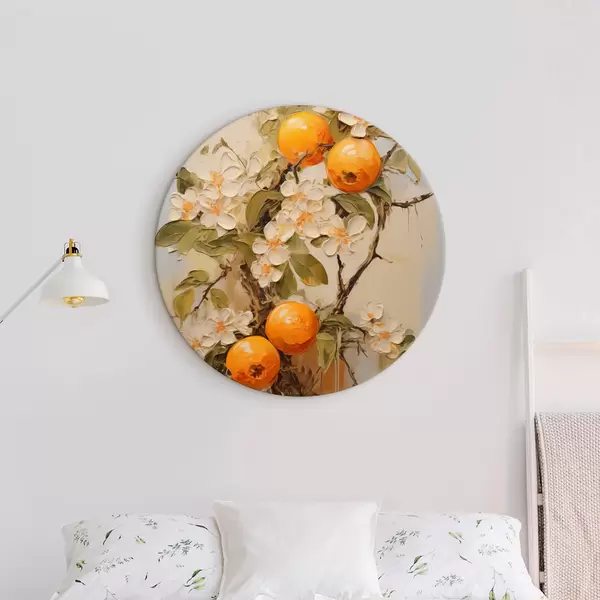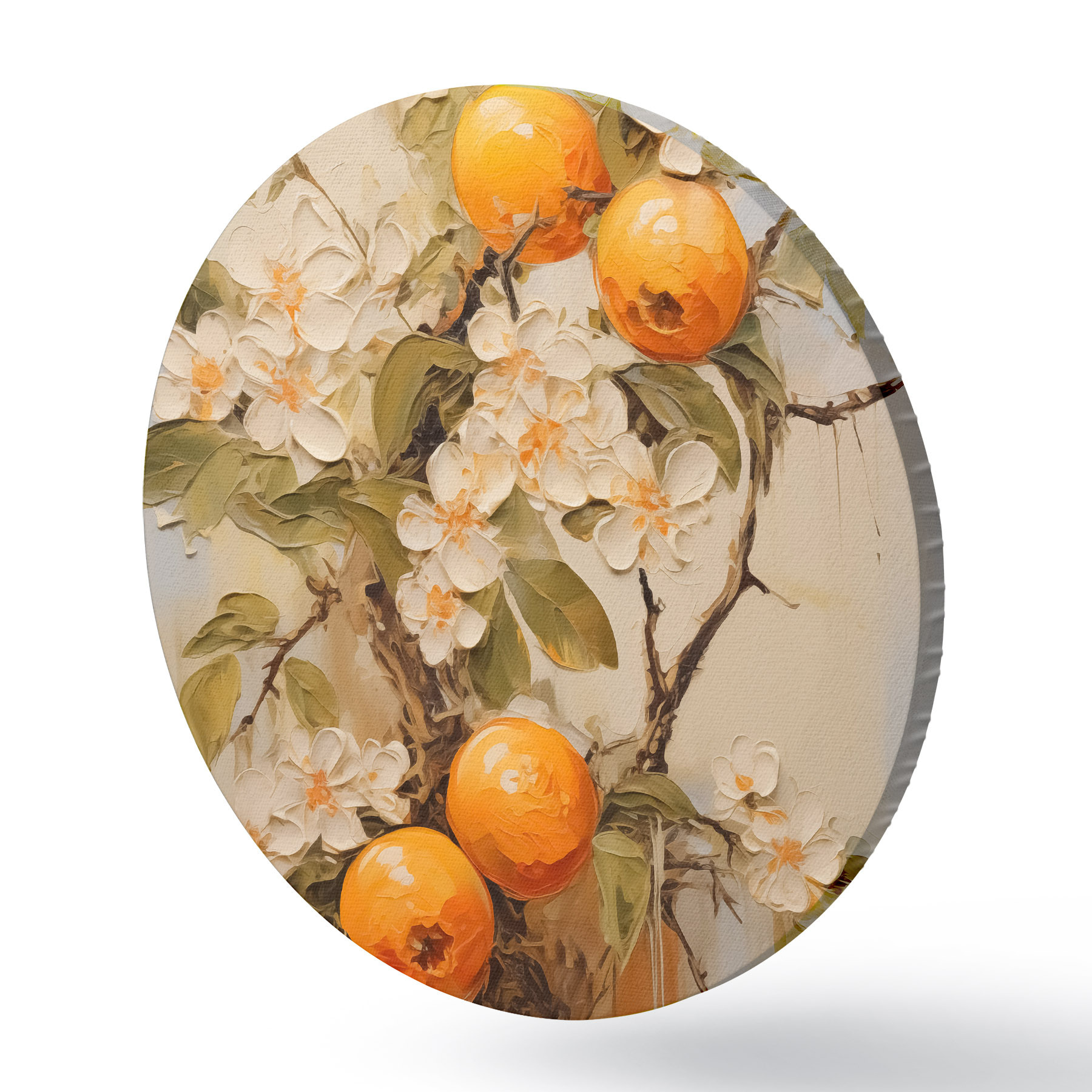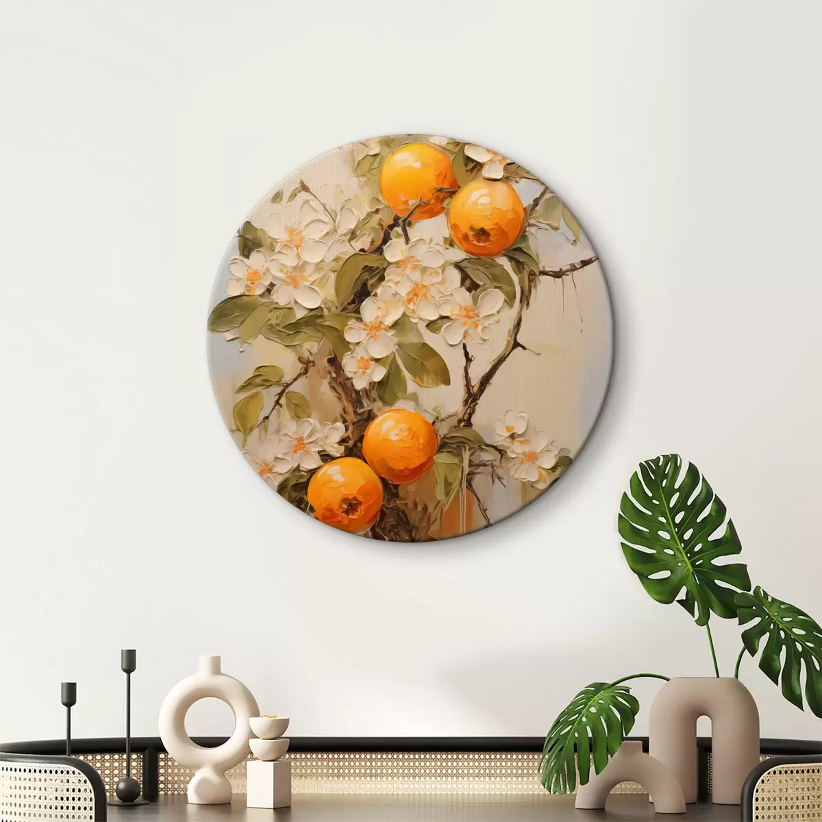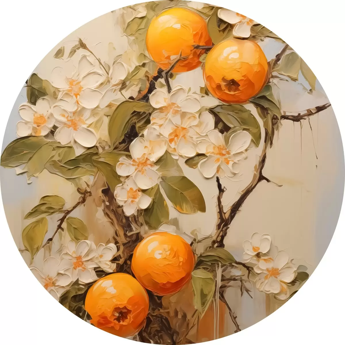 Runde Gemälde Zweig mit weißen Blüten und Orangen auf graubeigem Hintergrund r40486