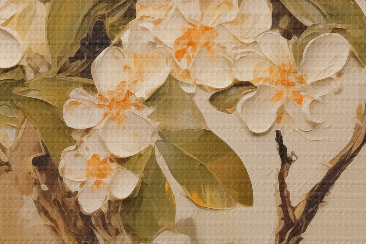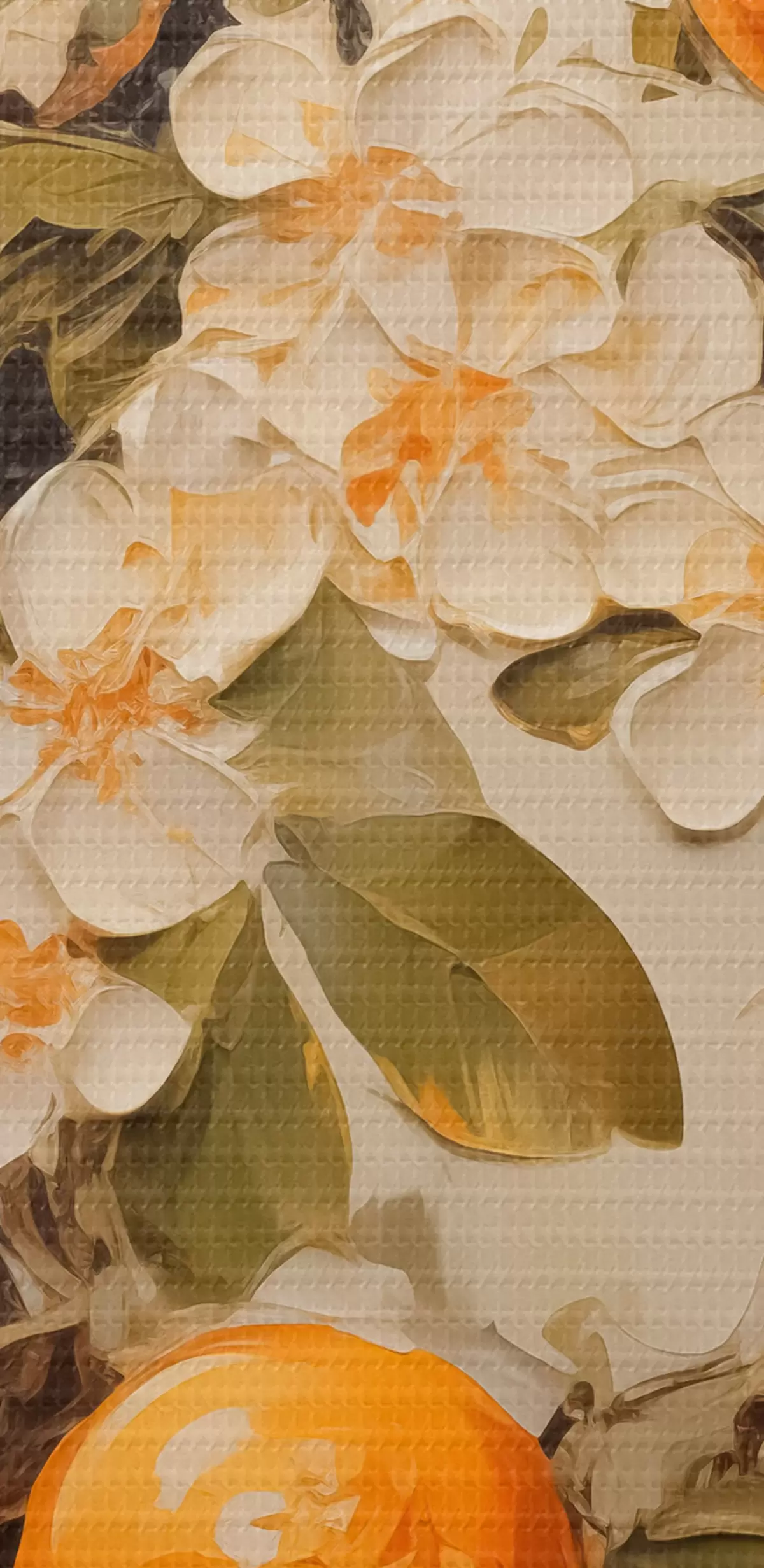 Bild Zweig mit weißen Blüten und Orangen auf graubeigem Hintergrund Nr r40486