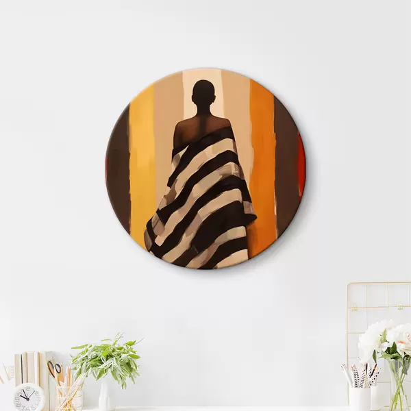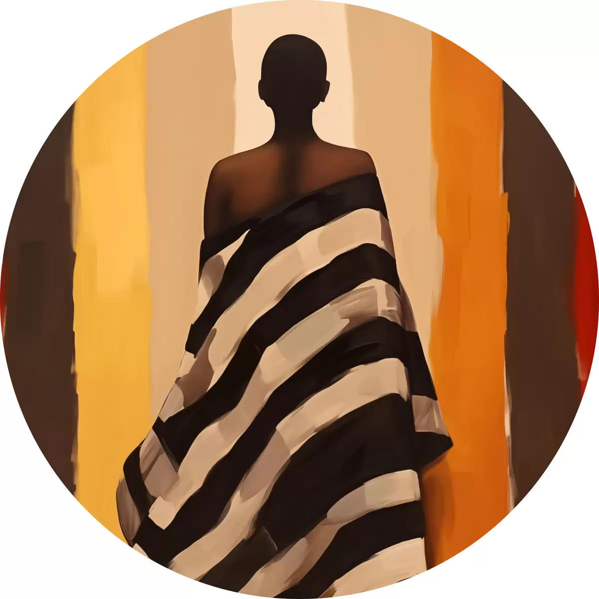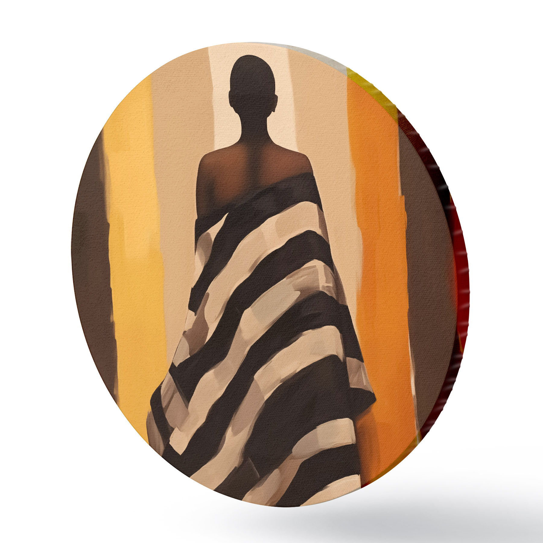 Runde Gemälde Silhouette einer Afroamerikanerin in einem gestreiften Umhang auf einem Hintergrund mit vertikalen Streifen, schwarz, beige, gelb, rot, braun r40487