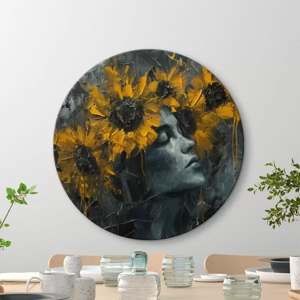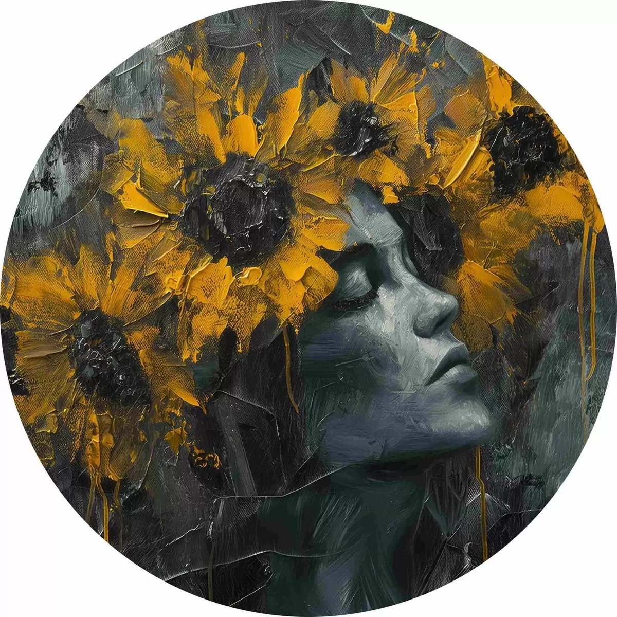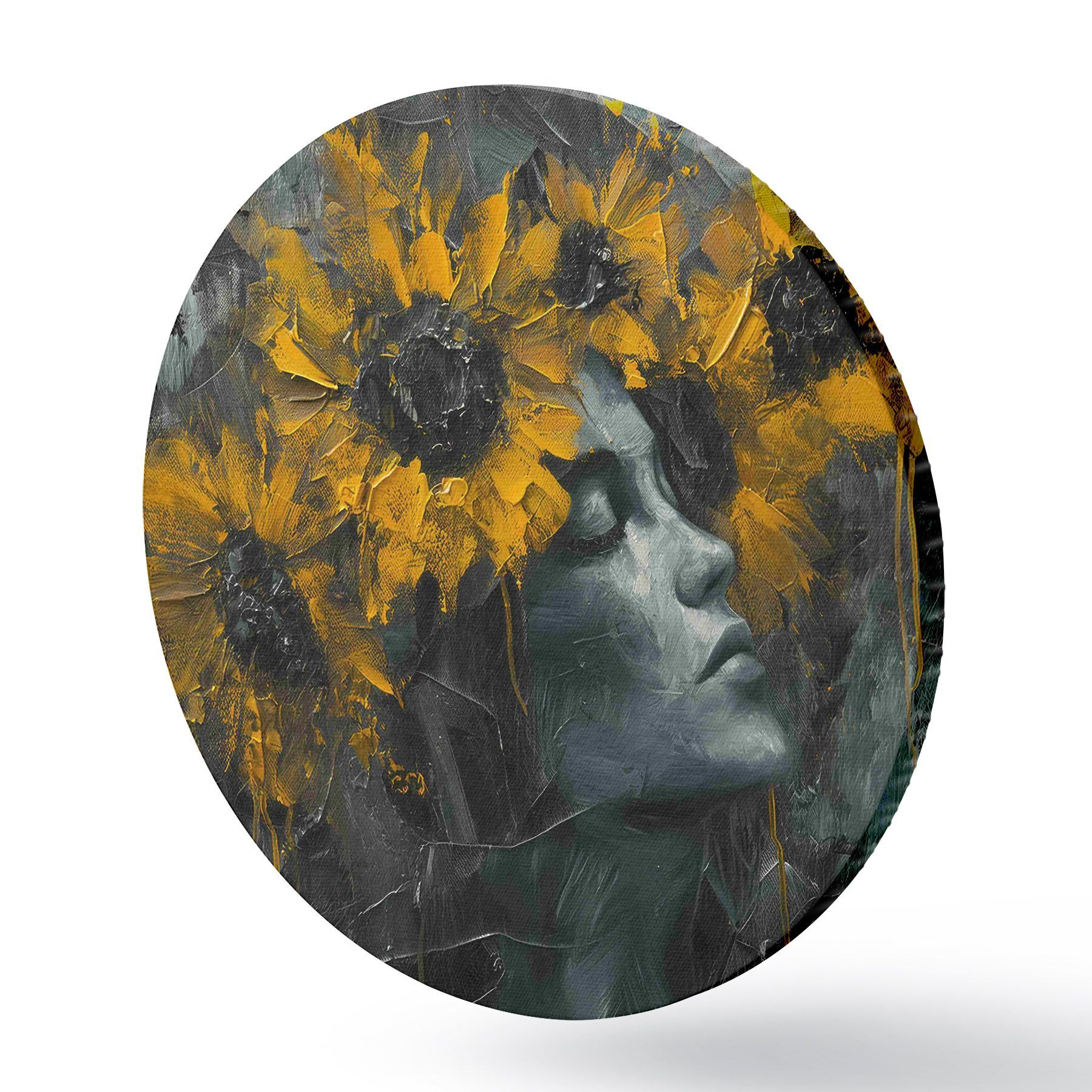 Runde Gemälde Gesicht einer Frau in Grautönen mit Sonnenblumen r40500