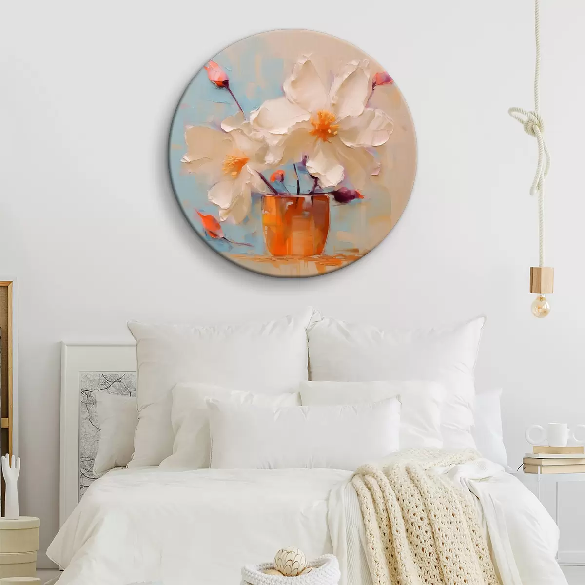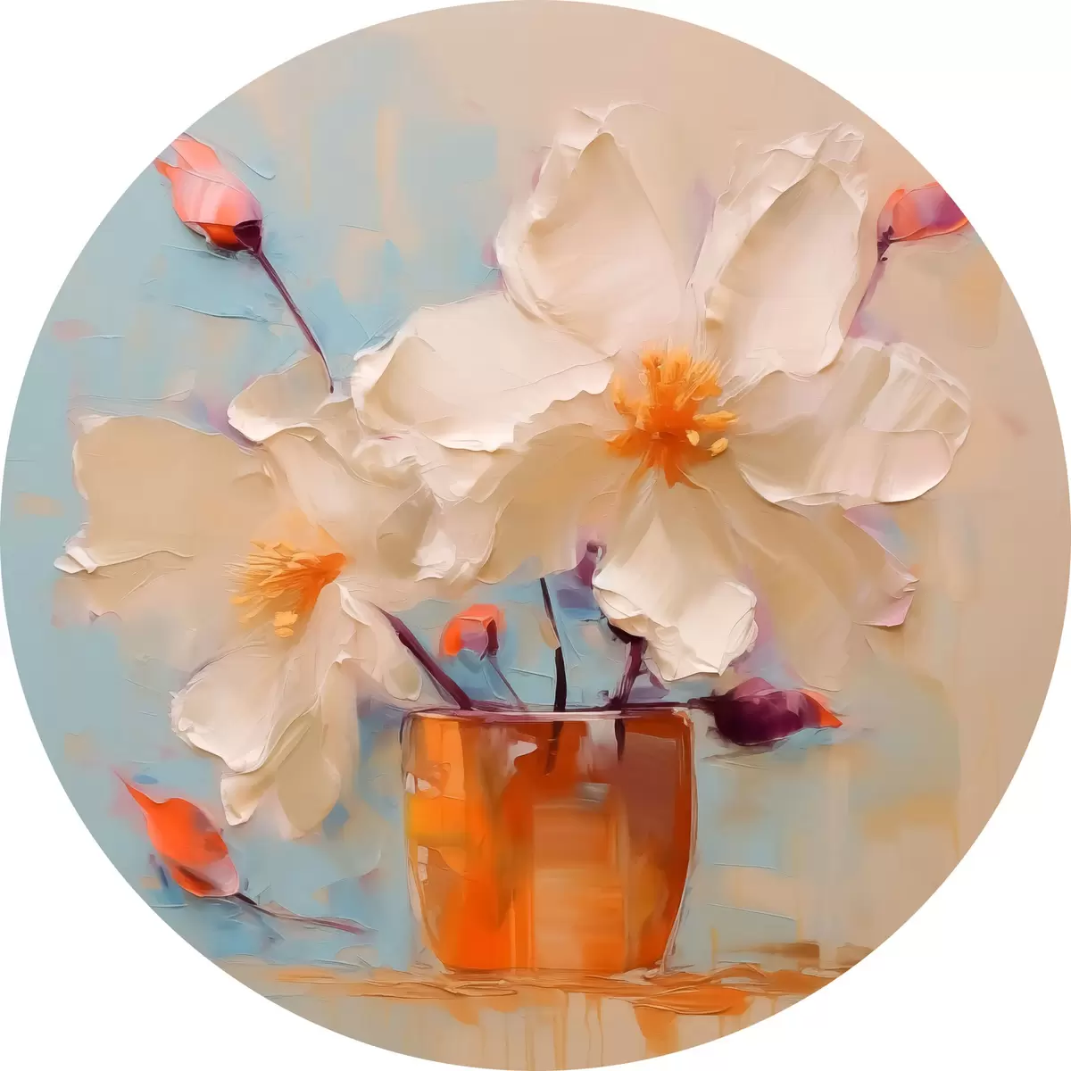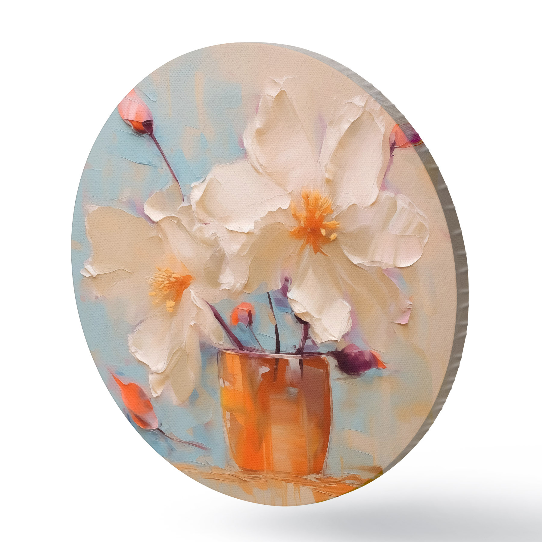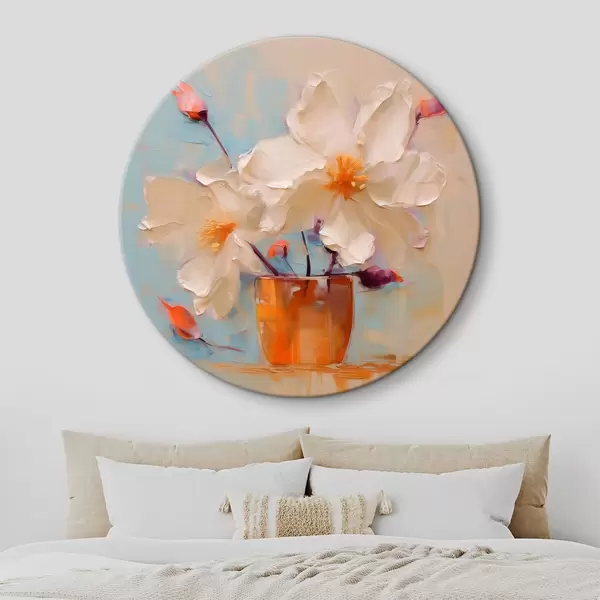 Runde Gemälde Narzissen in einer Vase, weiß, orange, beige, blau r40520