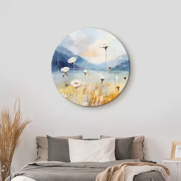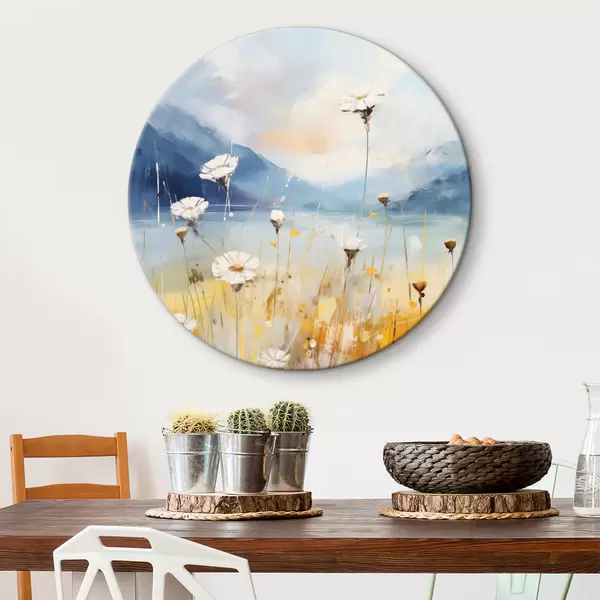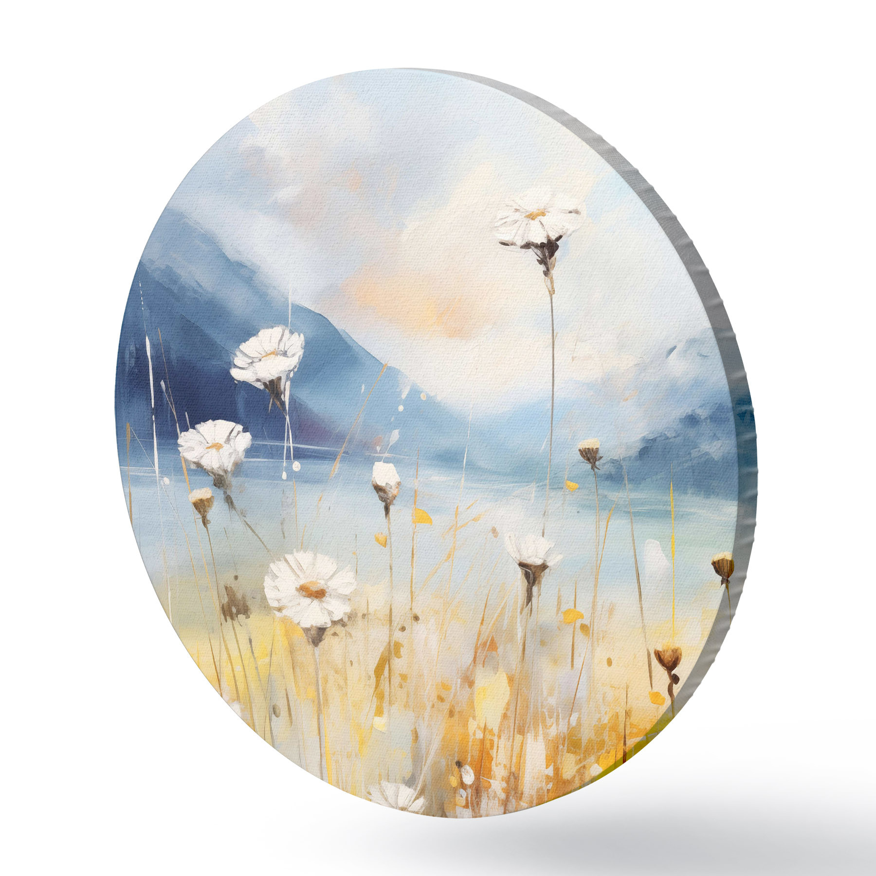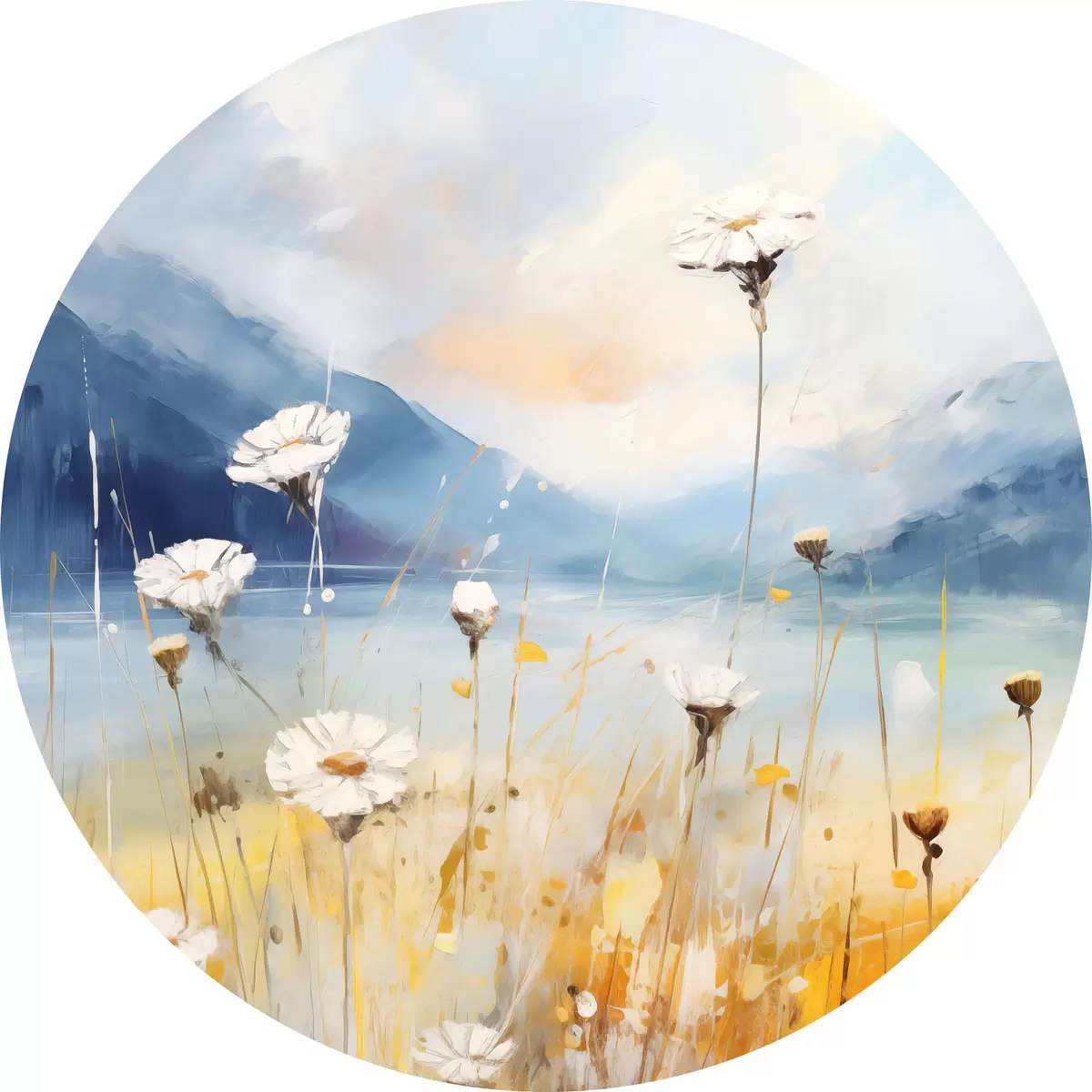 Runde Gemälde Weiße Gänseblümchen vor dem Hintergrund der Berge, blau, gelb, orange Farben r40522