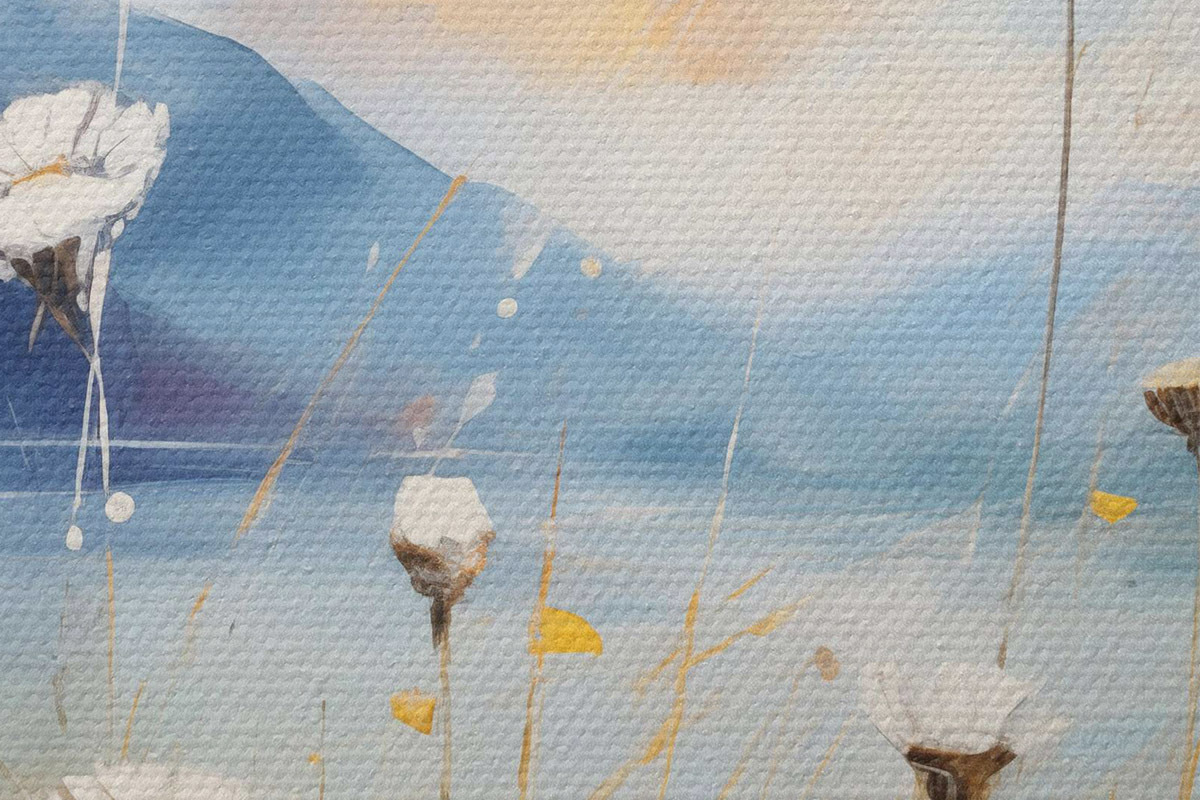 Bild Weiße Gänseblümchen vor dem Hintergrund der Berge, blau, gelb, orange Farben Nr r40522