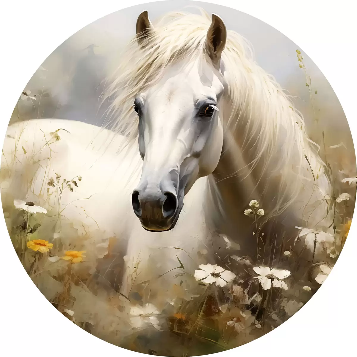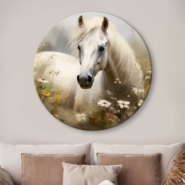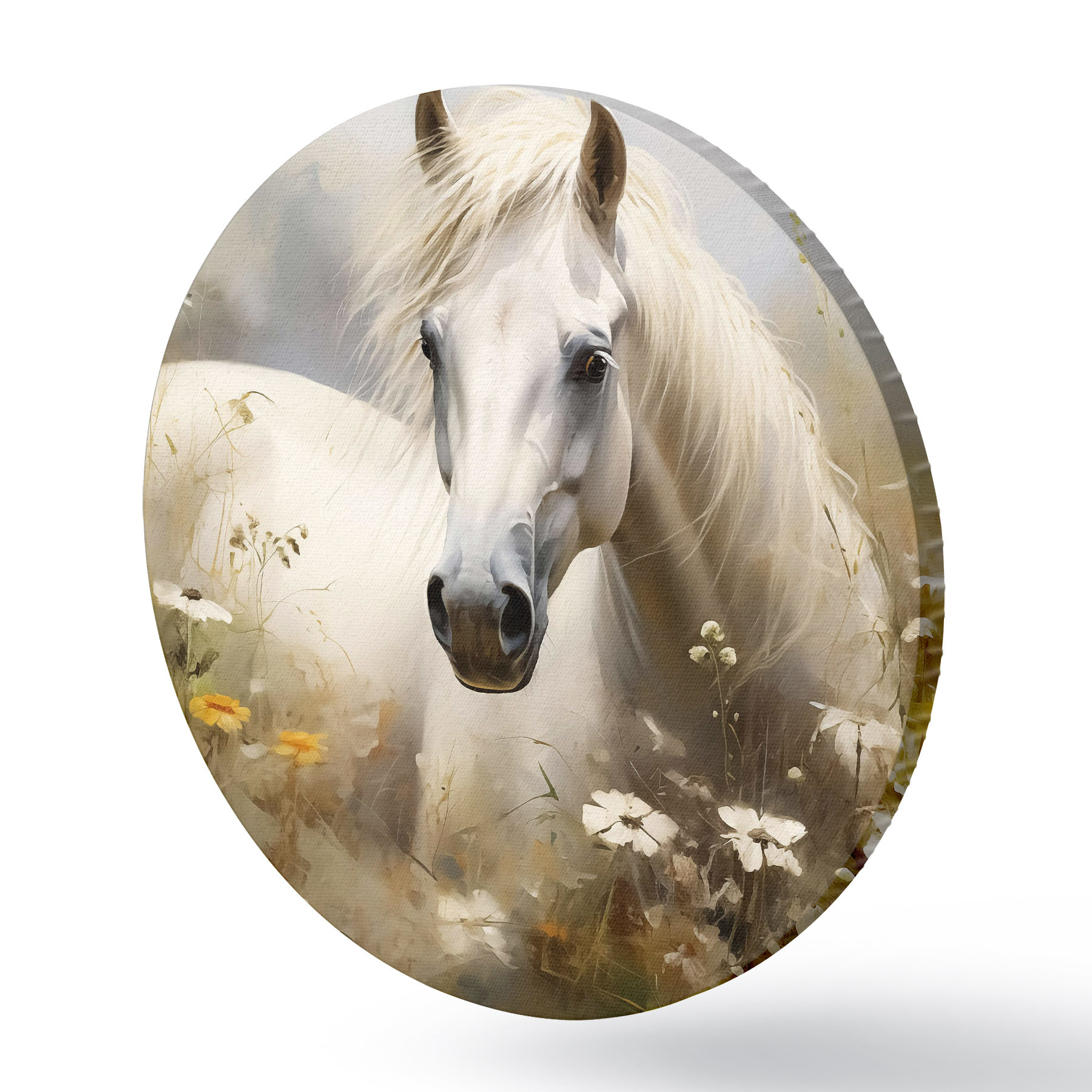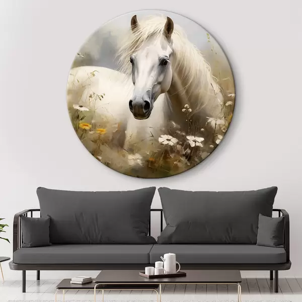 Runde Gemälde Weißes Pferd im Gras zwischen Gänseblümchen r40533