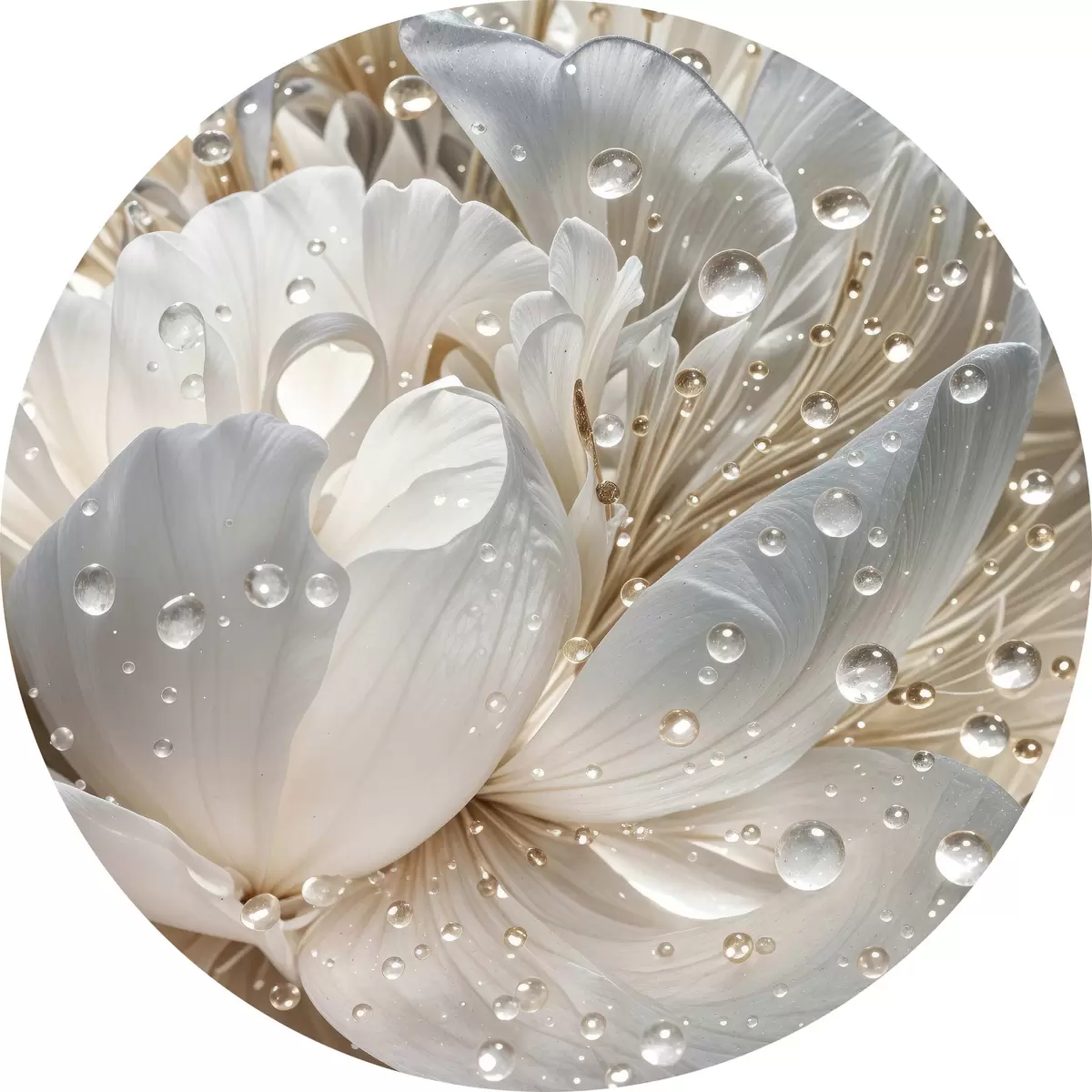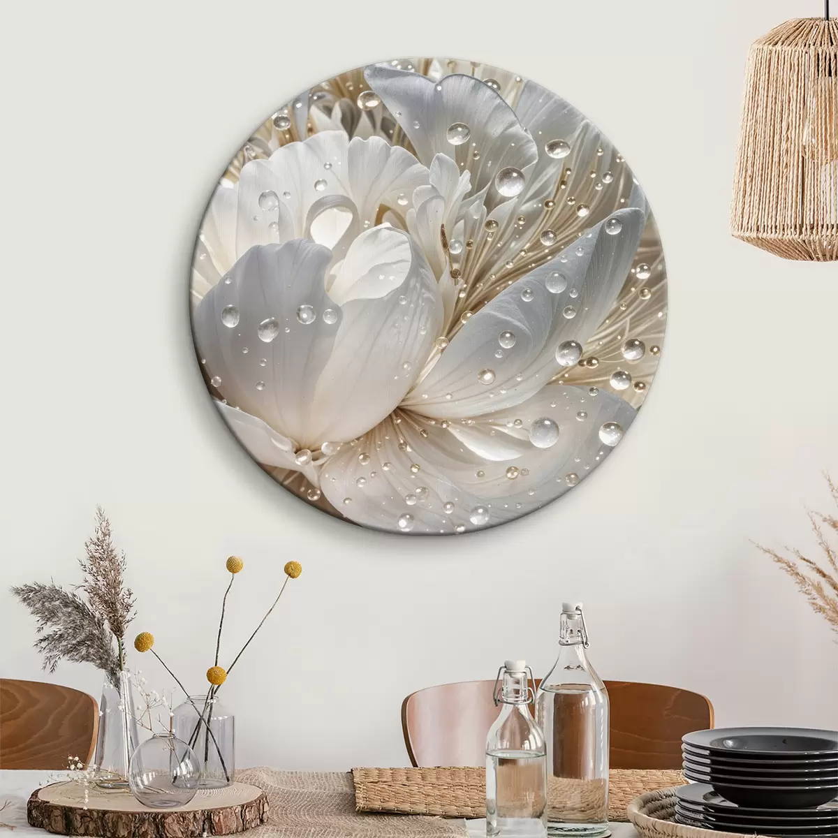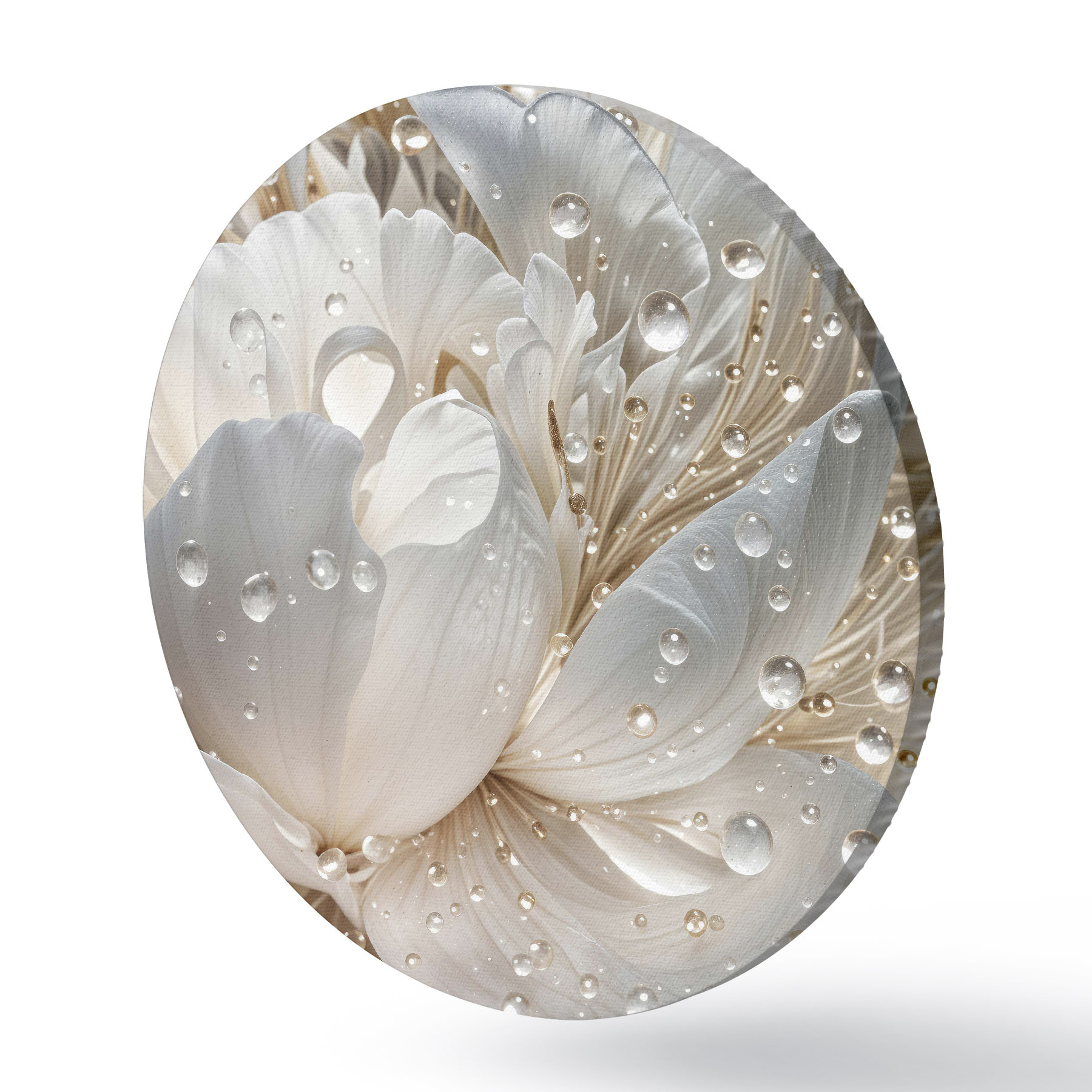 Runde Gemälde Nahaufnahme einer weißen Pfingstrose mit Wassertropfen auf den Blütenblättern, vor einem unscharfen Hintergrund r40539