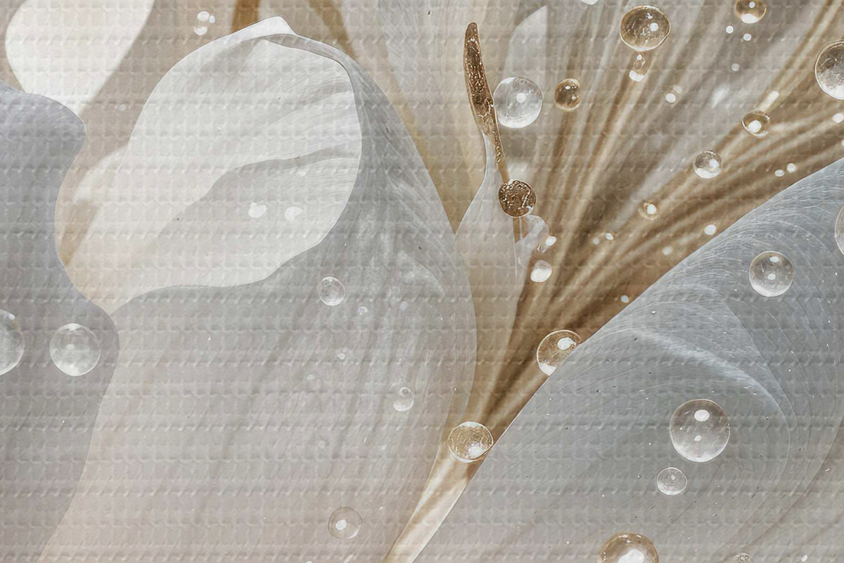 Bild Nahaufnahme einer weißen Pfingstrose mit Wassertropfen auf den Blütenblättern, vor einem unscharfen Hintergrund Nr r40539