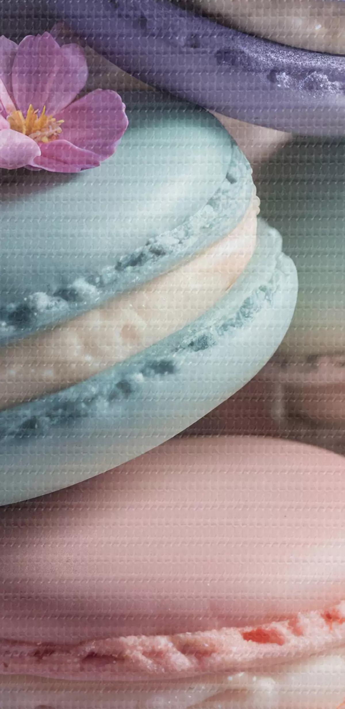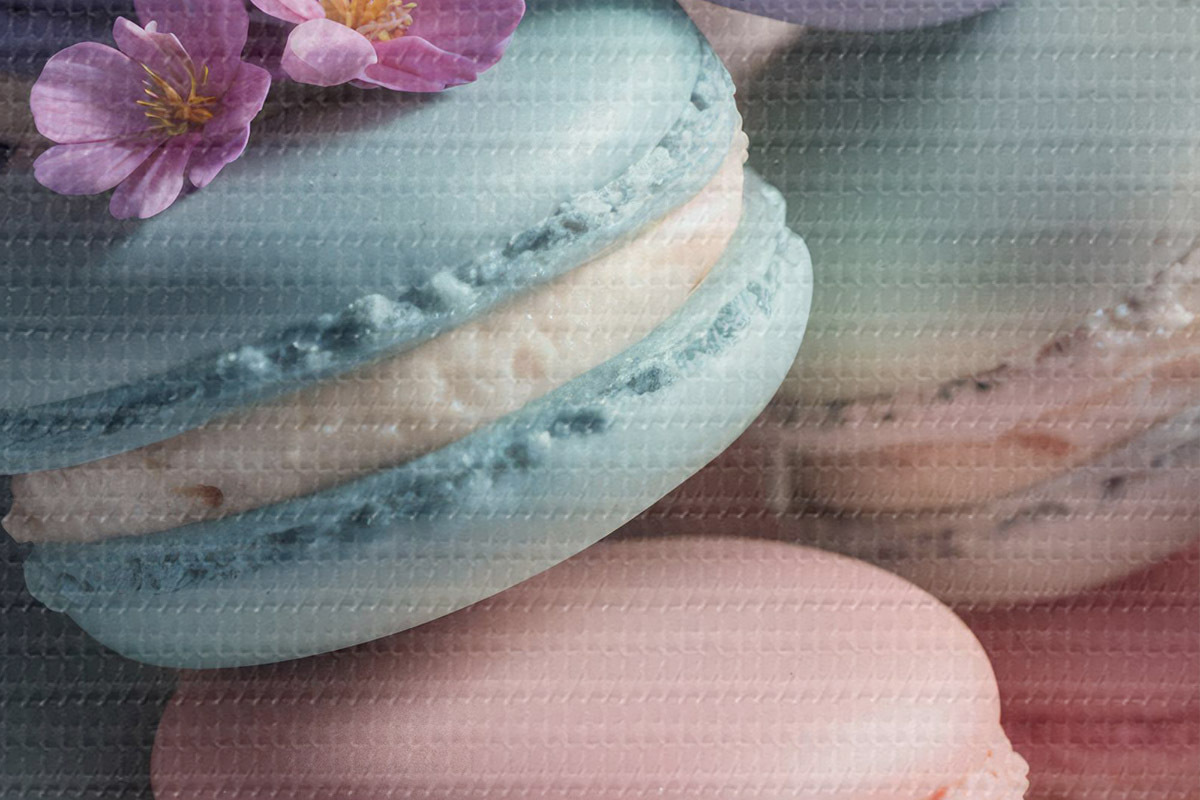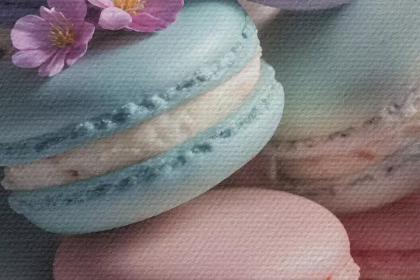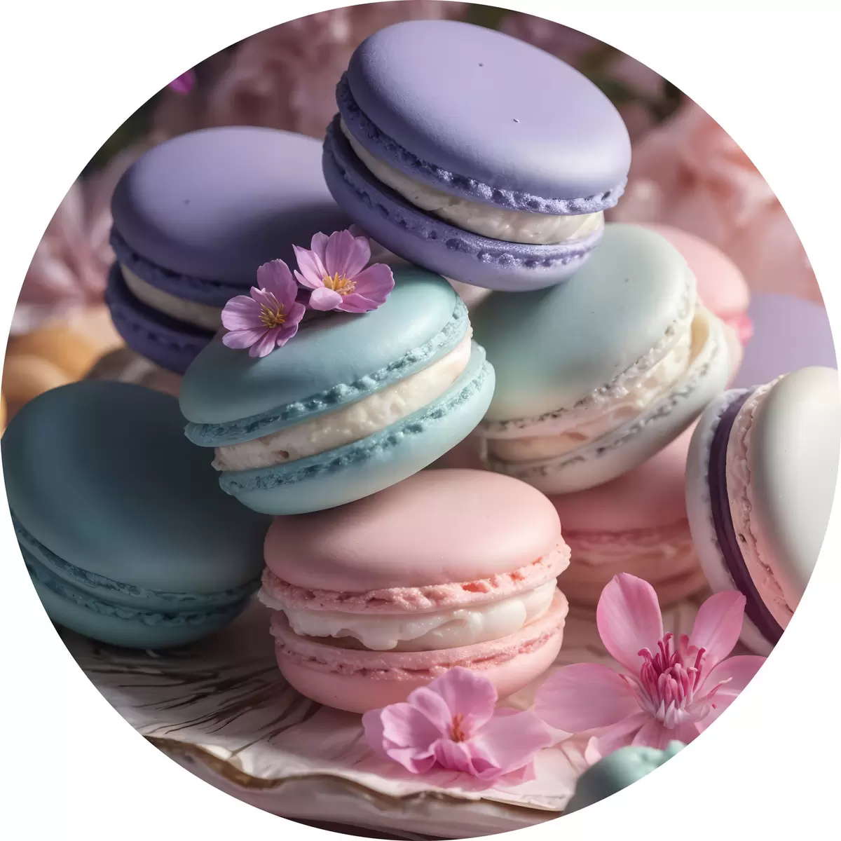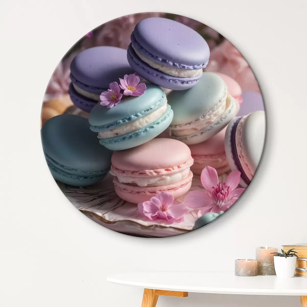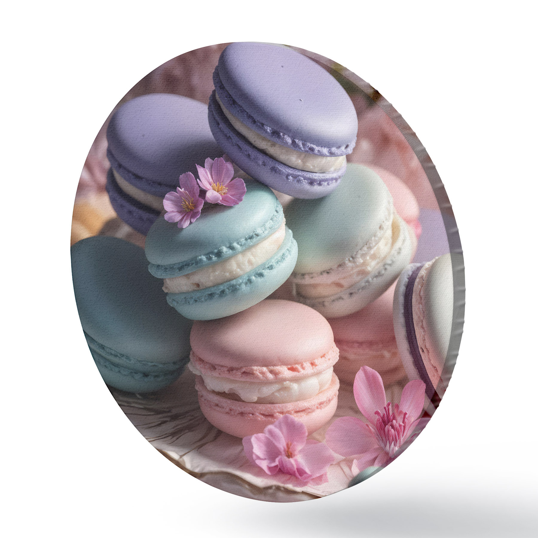 Runde Gemälde Bunte Makronen mit rosa und lila Blumen auf einem Teller, Nahaufnahme r40546