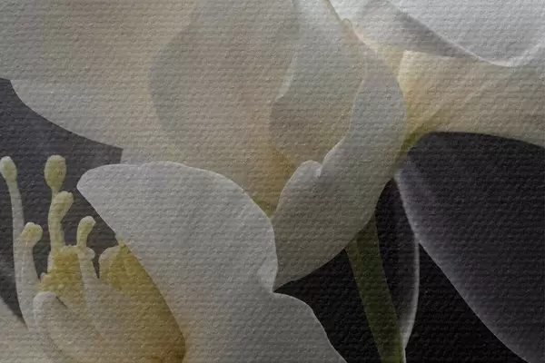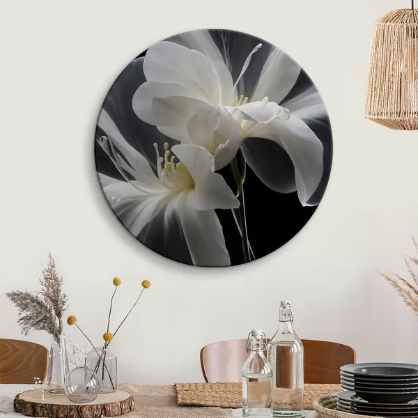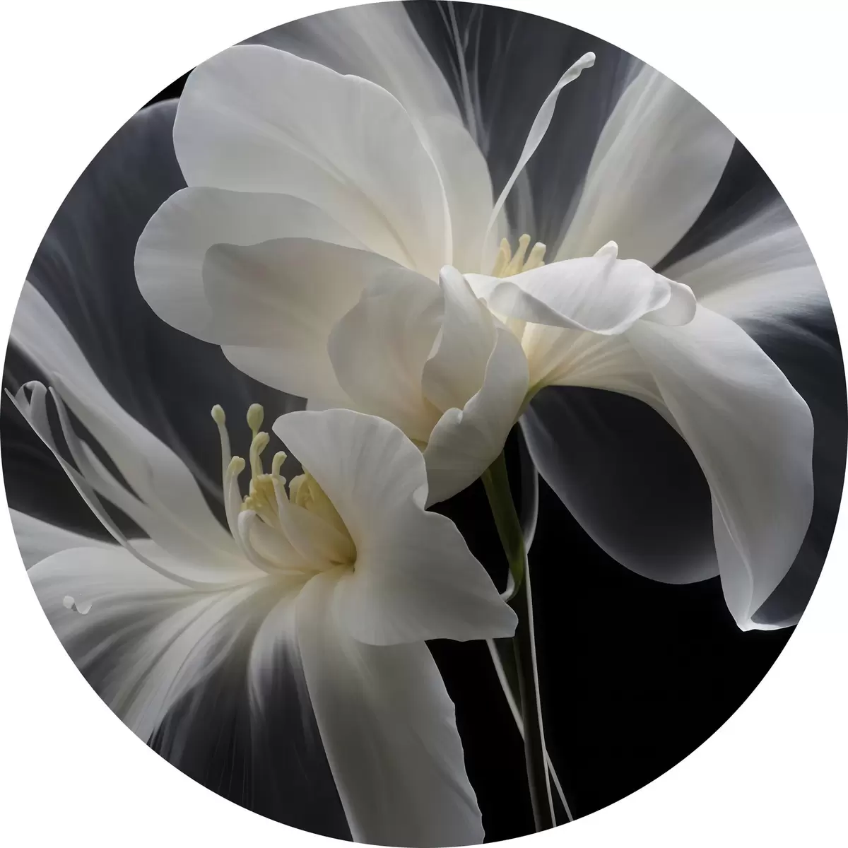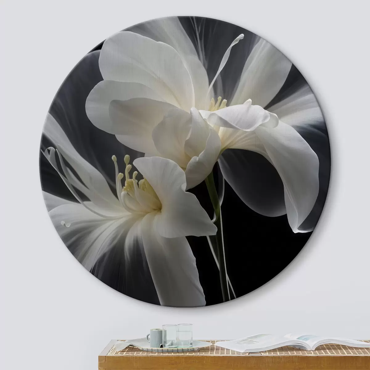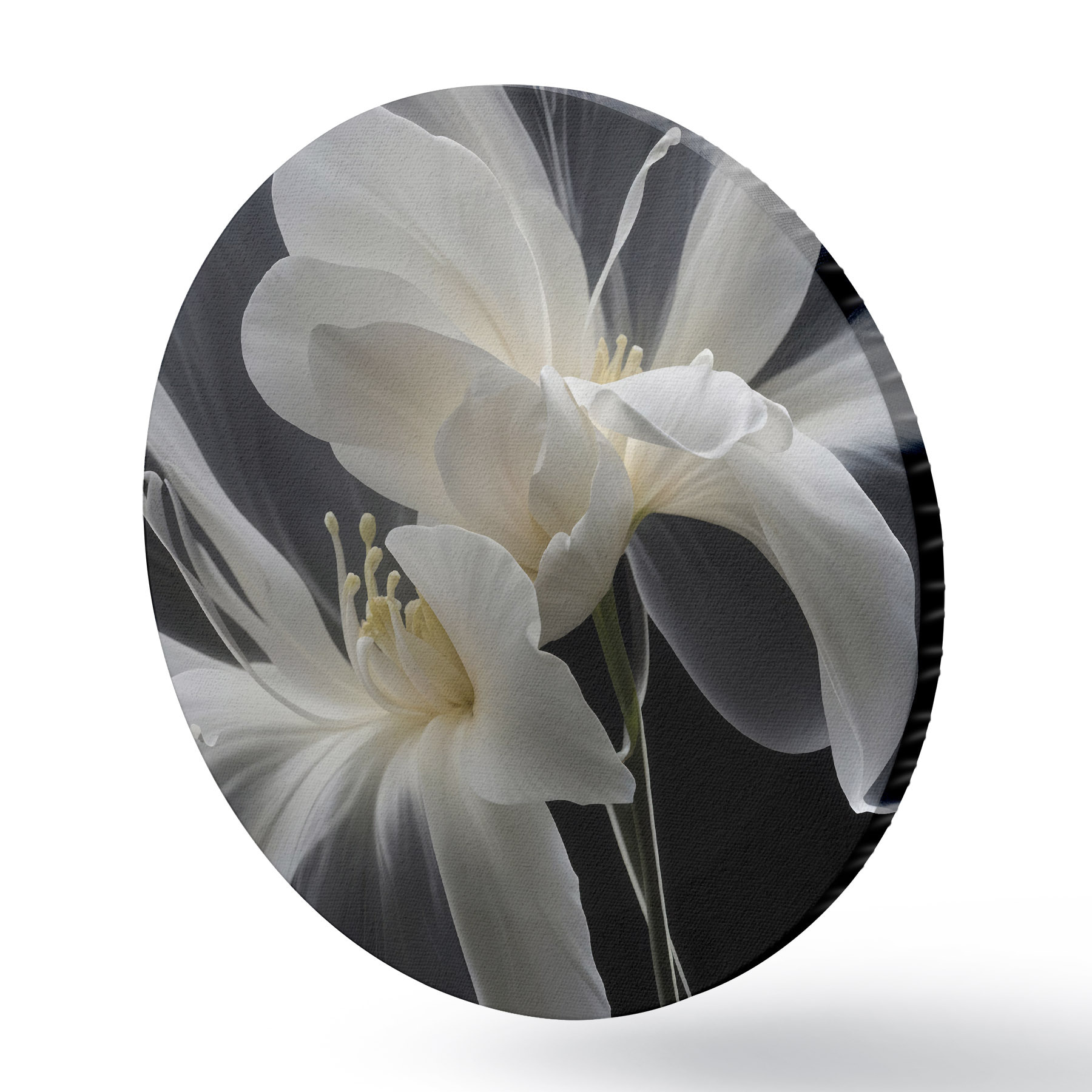 Runde Gemälde Nahaufnahme von zwei weißen Blumen mit zarten Blütenblättern und gelben Zentren auf dunklem Hintergrund r40549