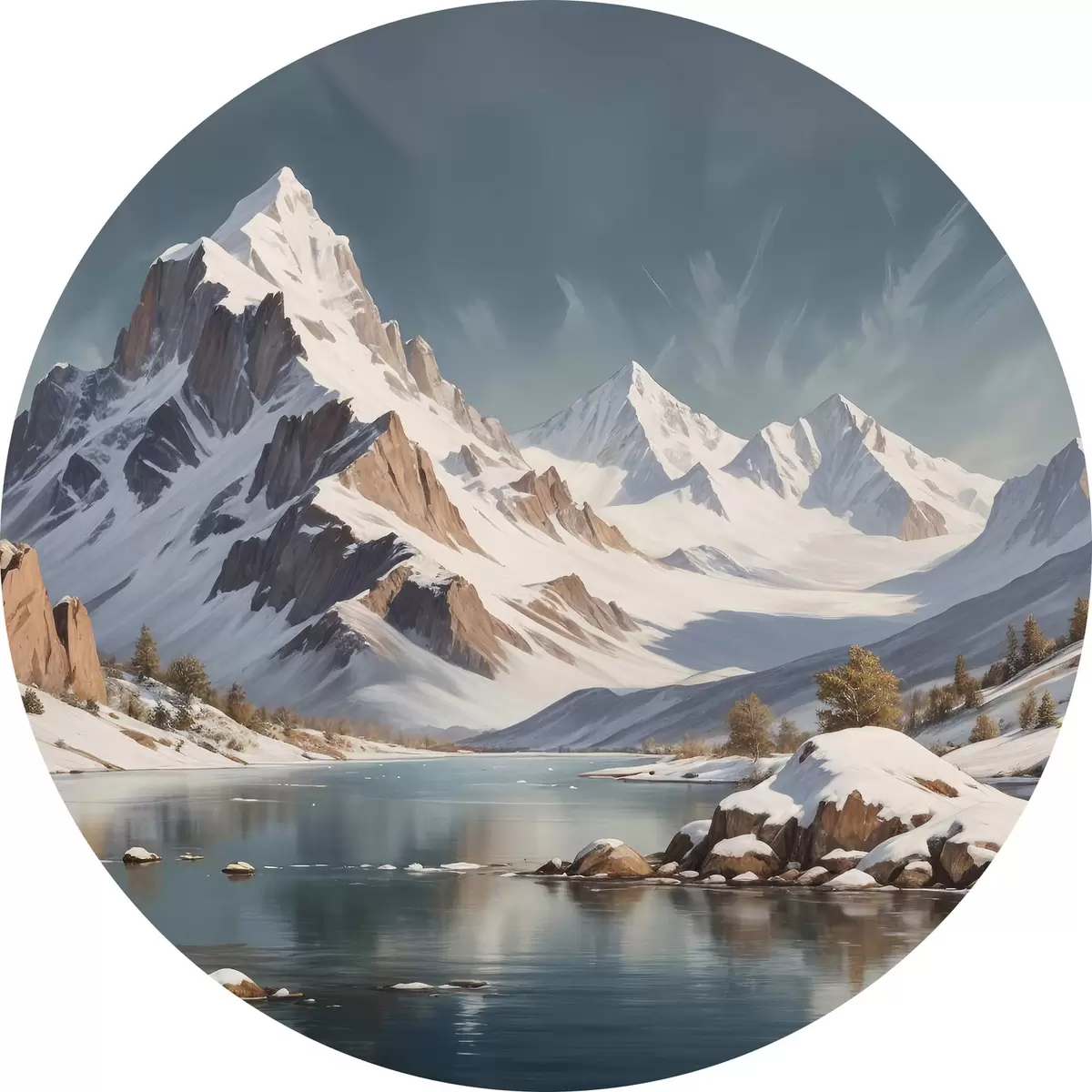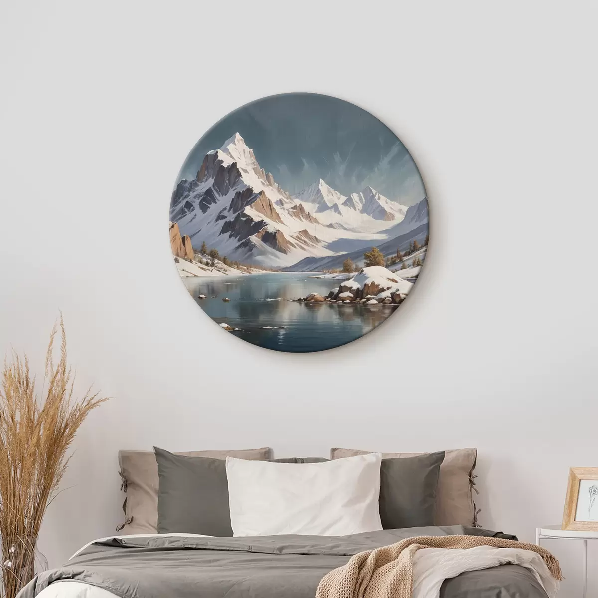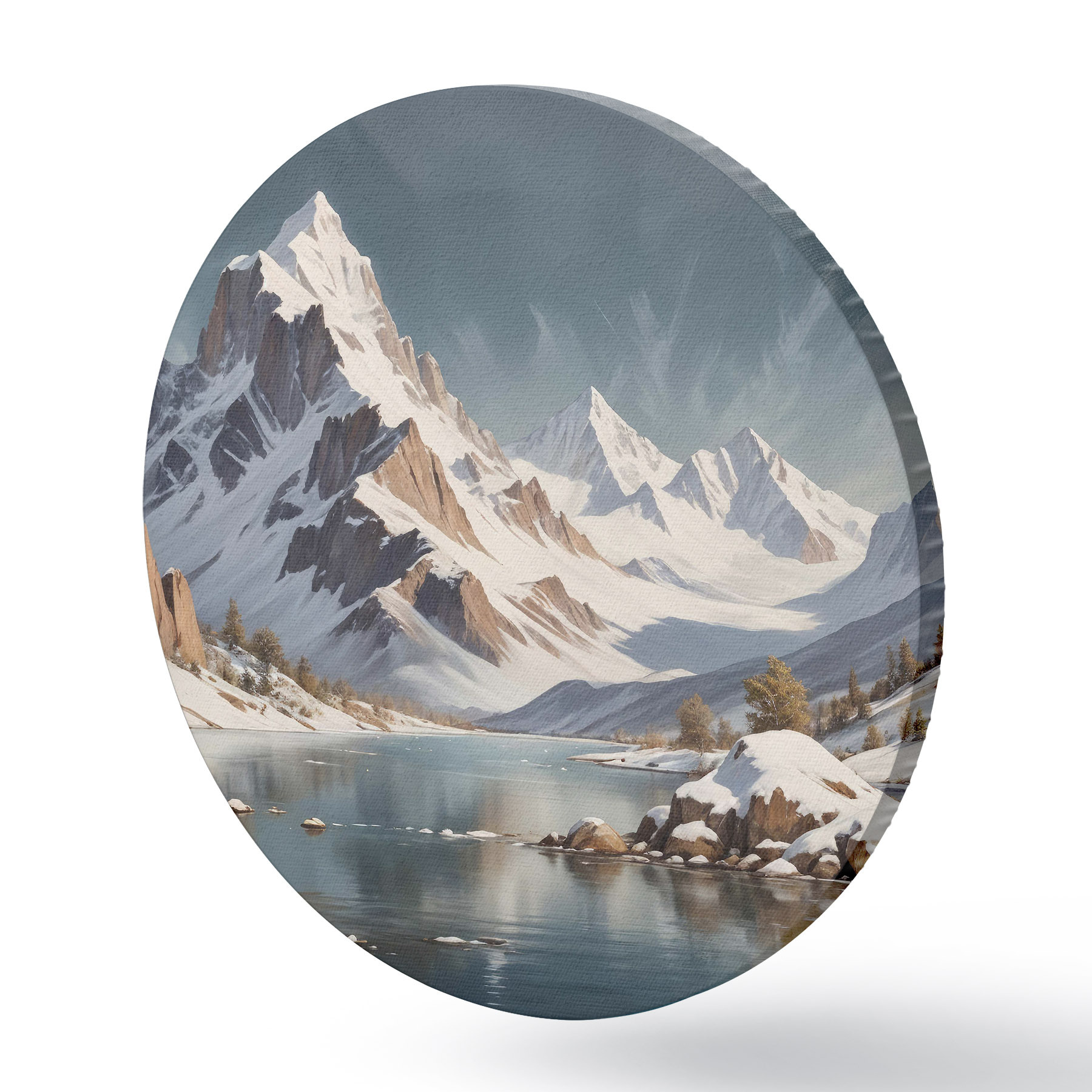 Runde Gemälde Eine verschneite Bergkette, die sich in einem ruhigen See spiegelt, mit Booten, die auf dem Wasser treiben, und einem dramatisch bewölkten Himmel r40551