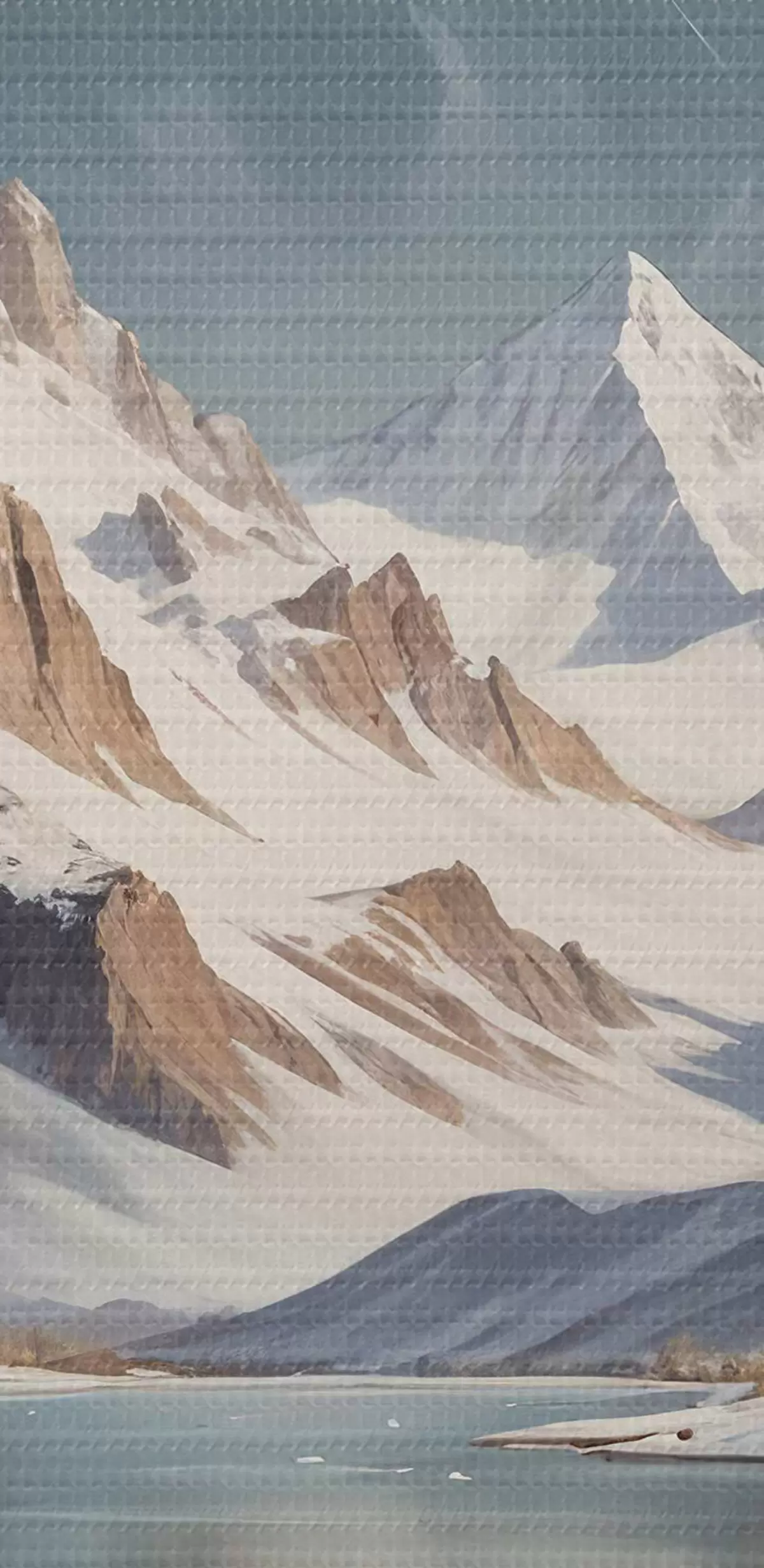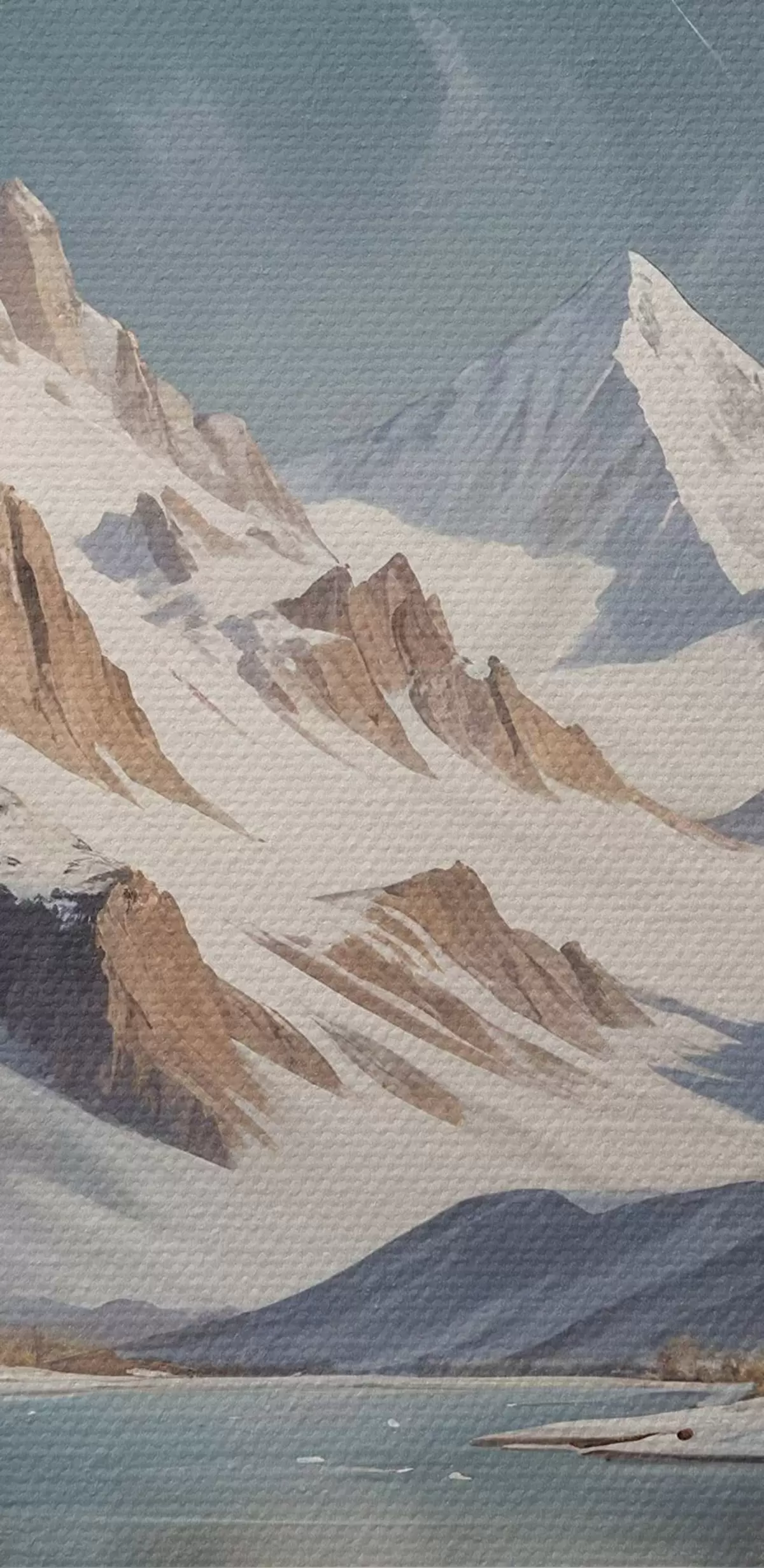Bild Eine verschneite Bergkette, die sich in einem ruhigen See spiegelt, mit Booten, die auf dem Wasser treiben, und einem dramatisch bewölkten Himmel Nr r40551