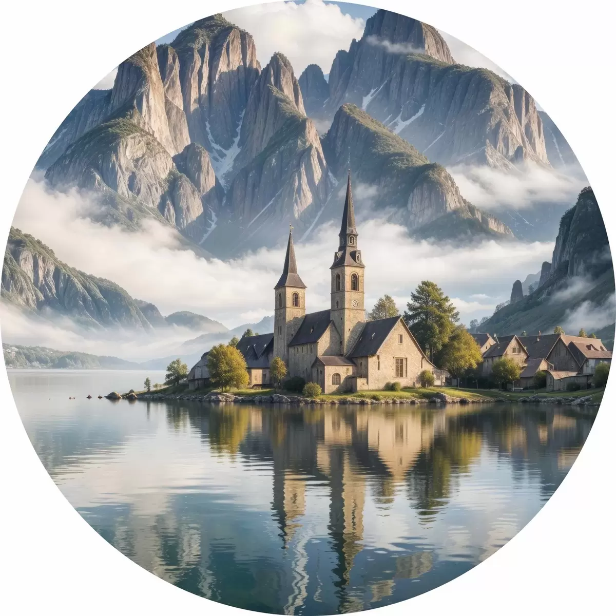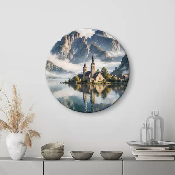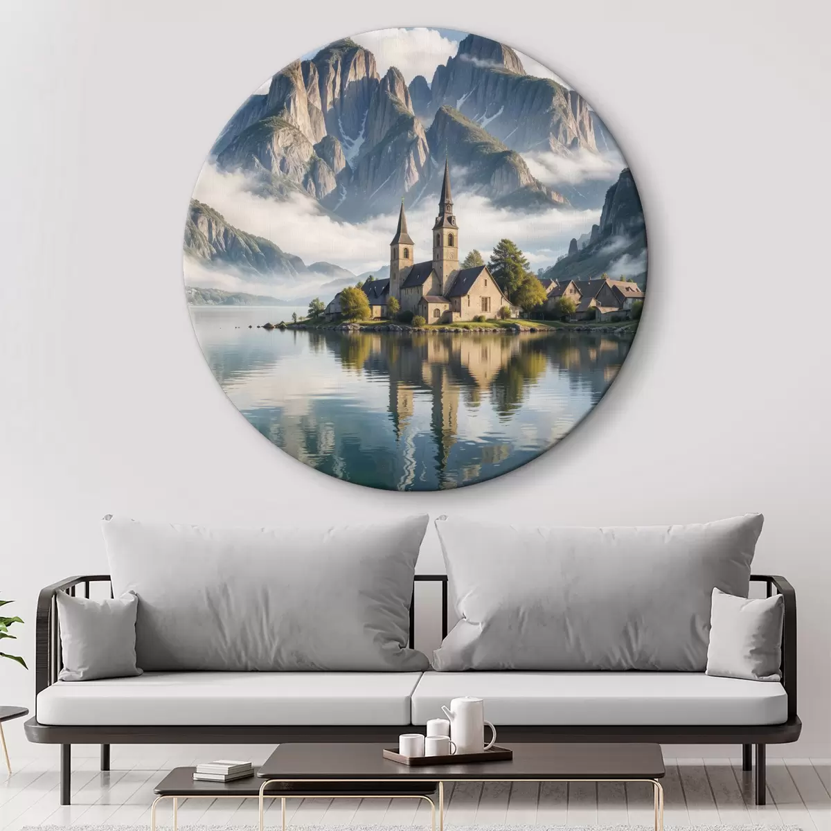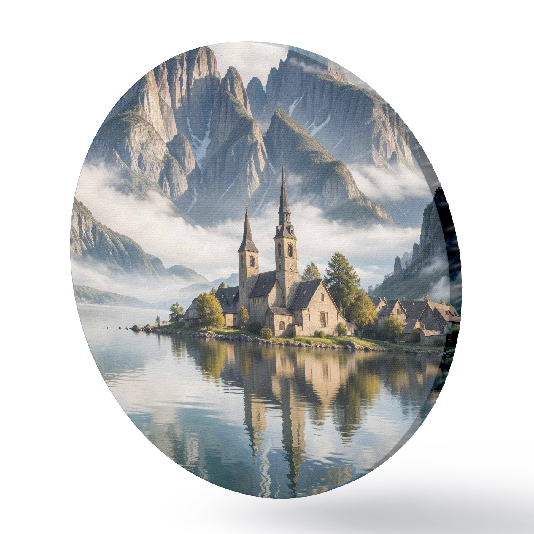 Runde Gemälde Ein malerisches Alpendorf an einem ruhigen See, über dem sich schneebedeckte Berge erheben r40554
