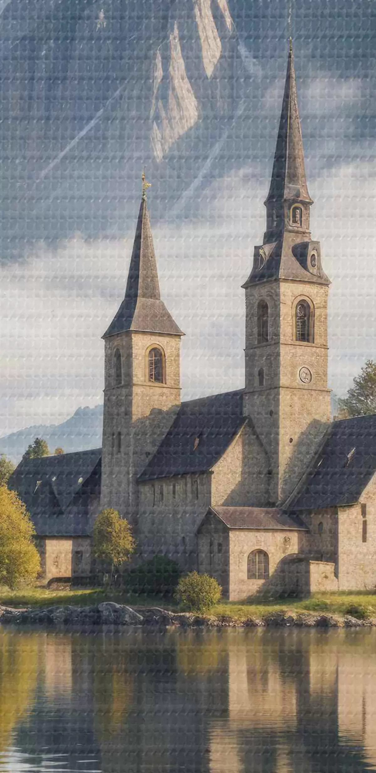 Bild Ein malerisches Alpendorf an einem ruhigen See, über dem sich schneebedeckte Berge erheben Nr r40554