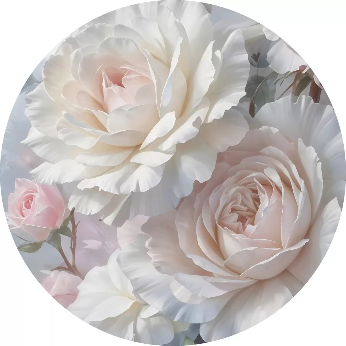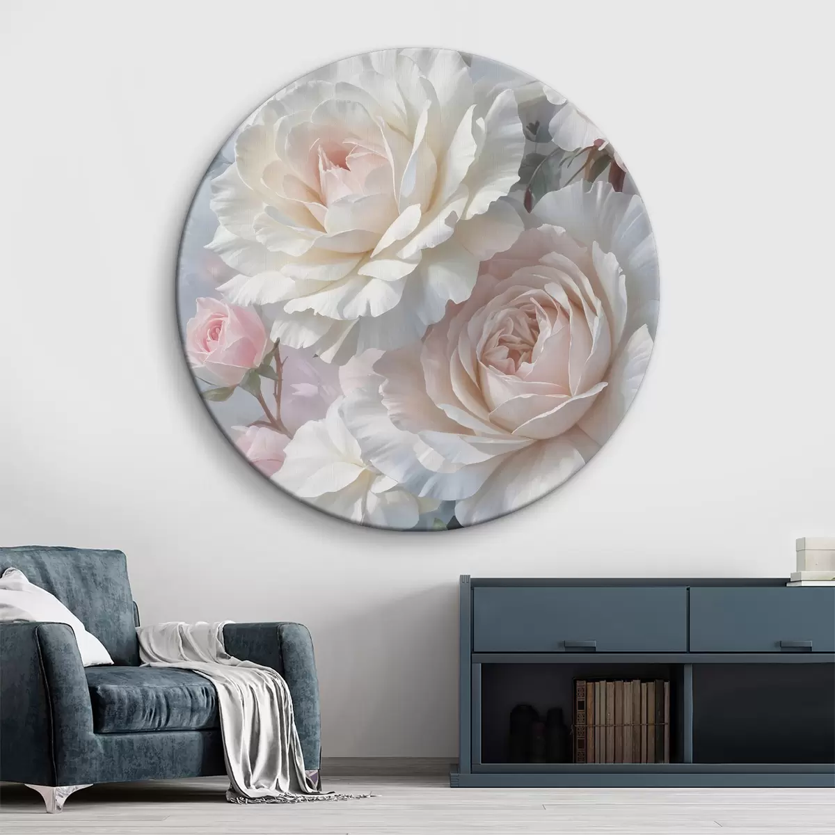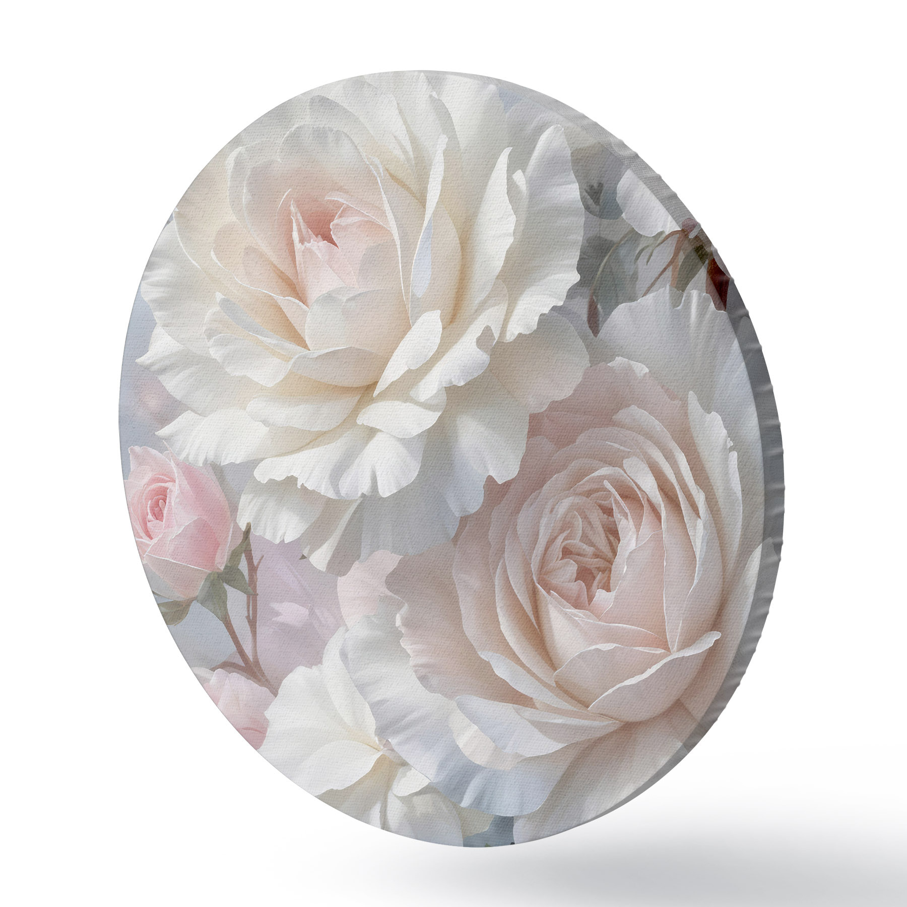 Runde Gemälde Weiche, zarte weiße und rosa Rosen mit unscharfem Hintergrund r40562
