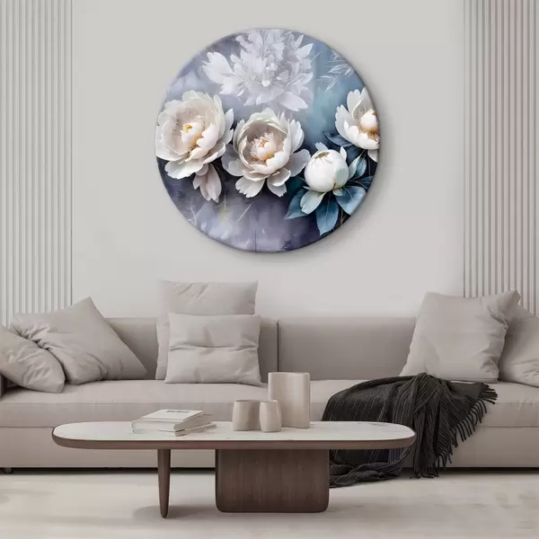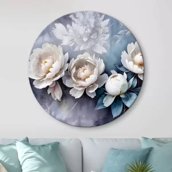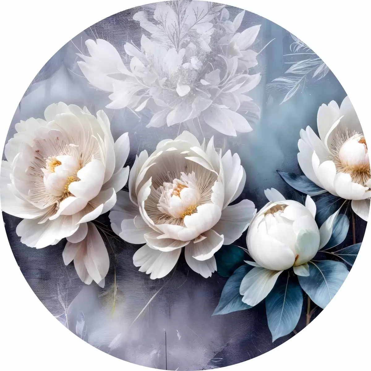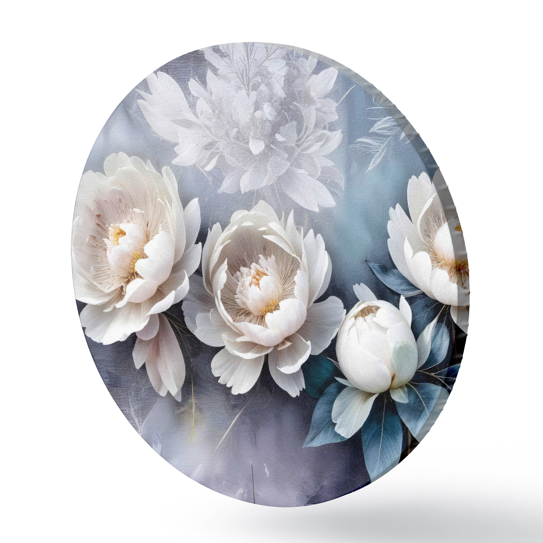Runde Gemälde Weiße Pfingstrosenblüten mit grünen Blättern auf blauem strukturiertem Hintergrund r40569