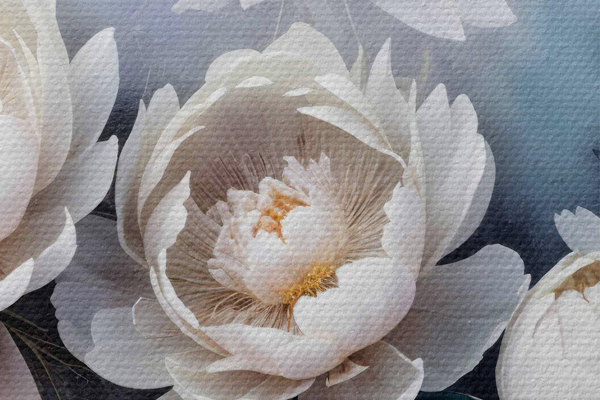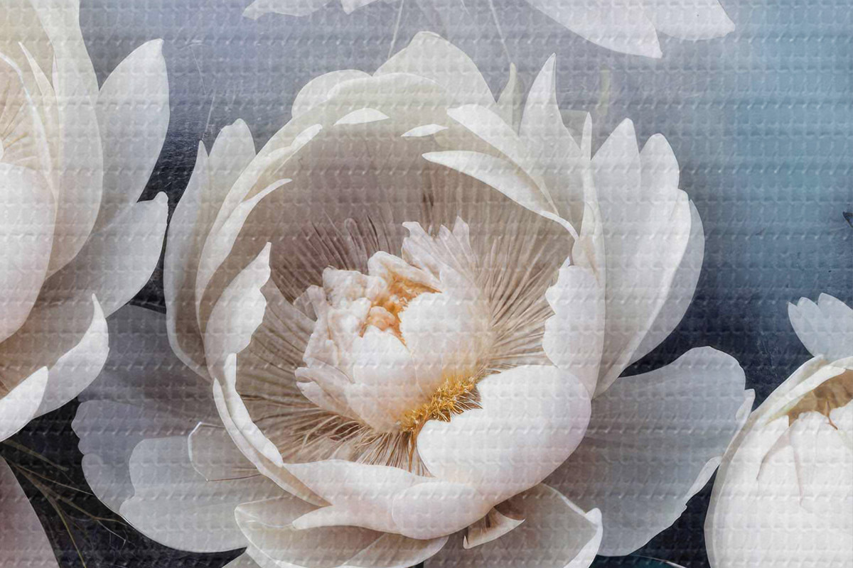 Bild Weiße Pfingstrosenblüten mit grünen Blättern auf blauem strukturiertem Hintergrund Nr r40569