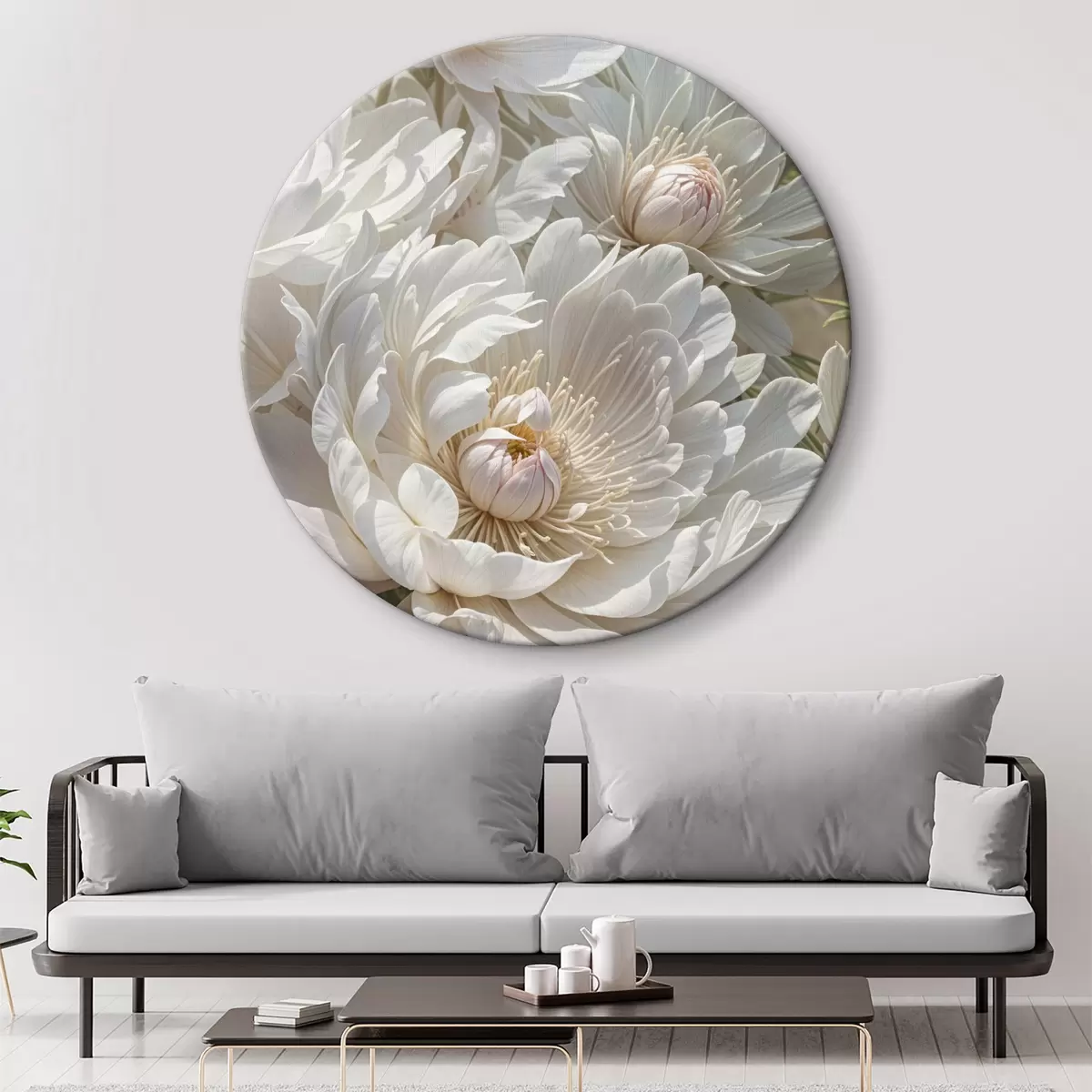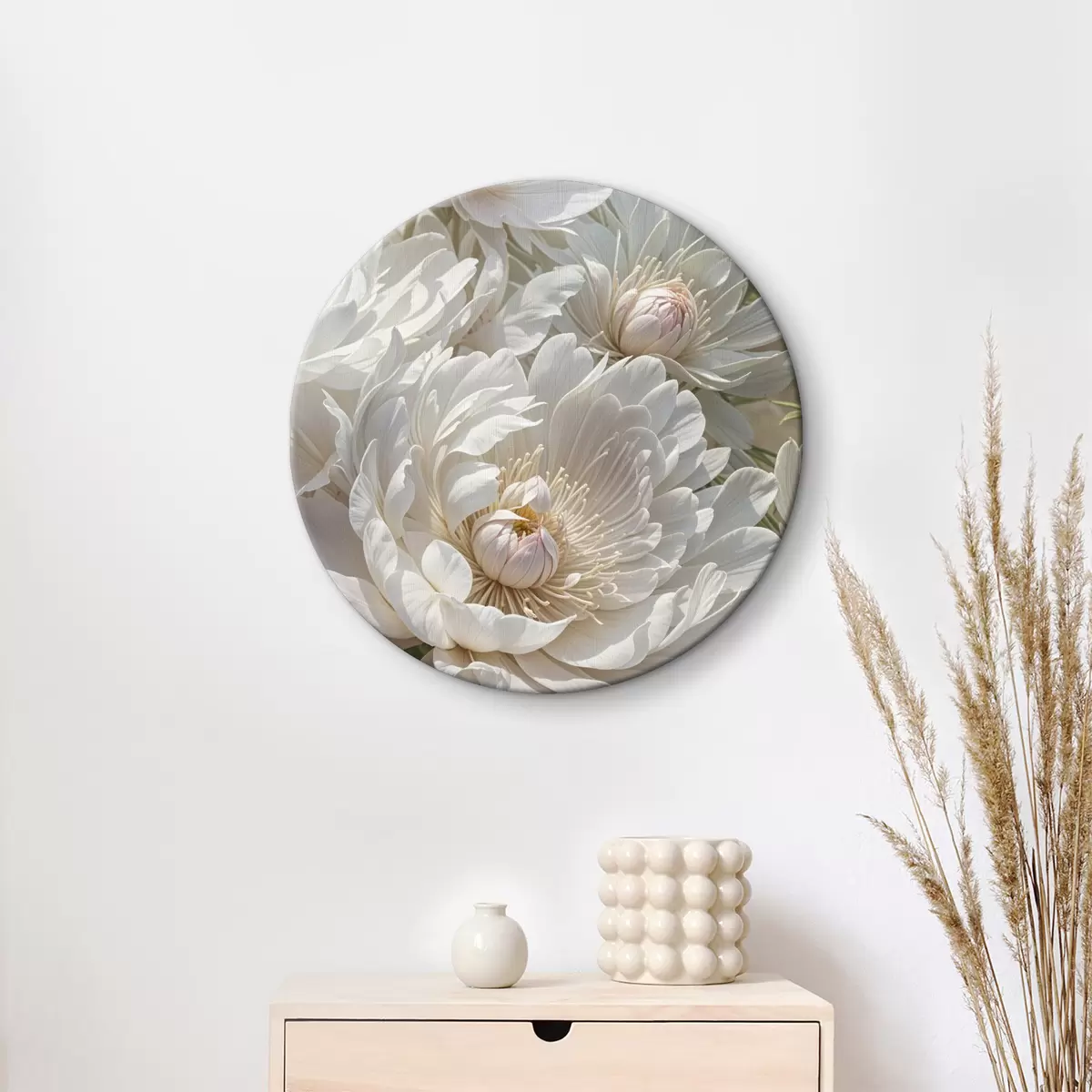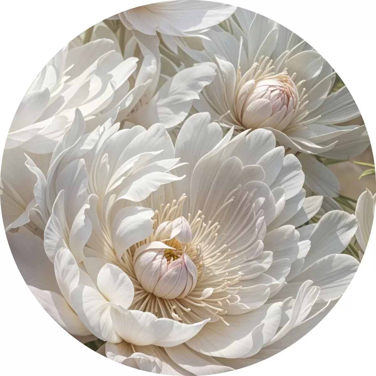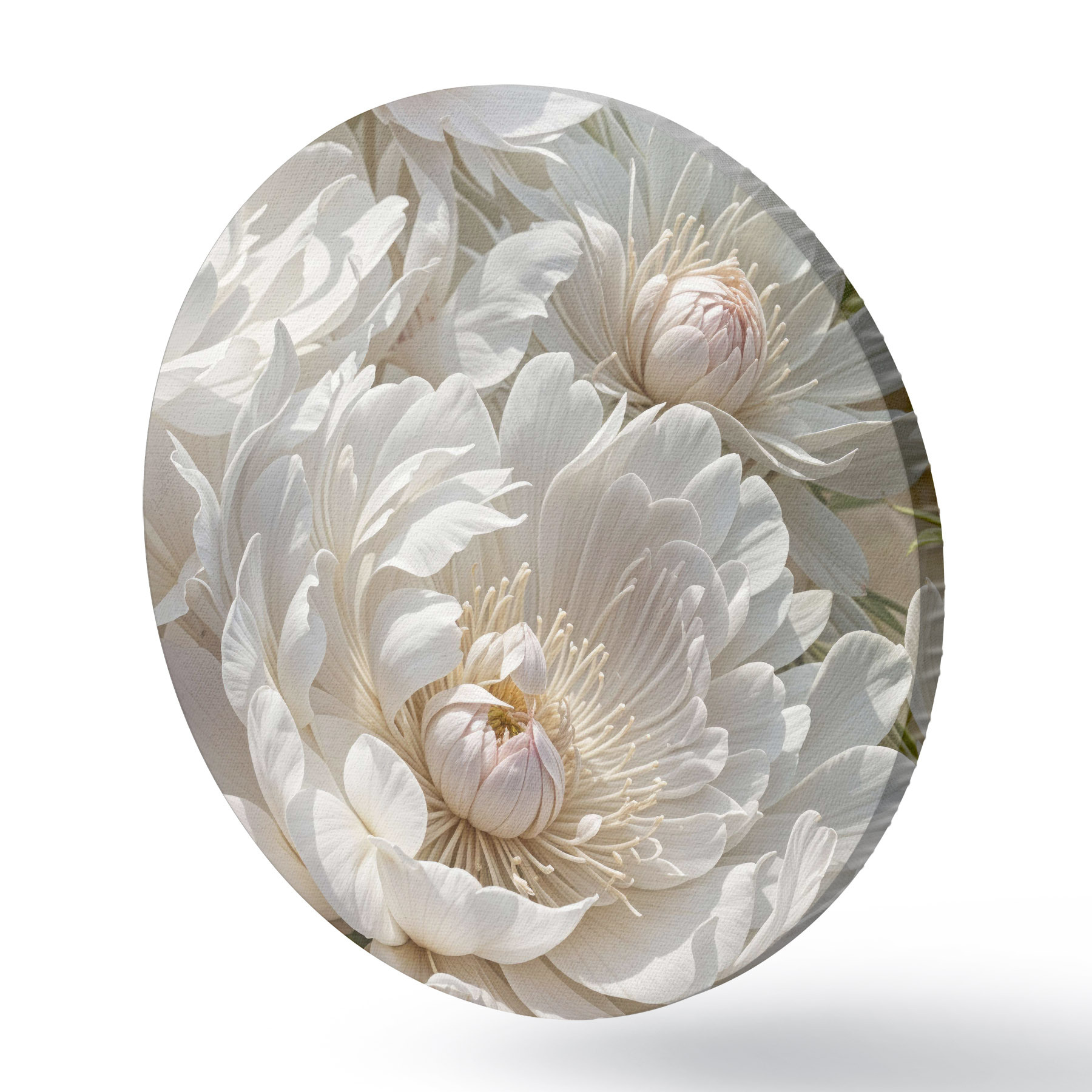 Runde Gemälde Nahaufnahme mehrerer großer, weißer Pfingstrosenblüten mit weichen, zarten Blütenblättern und leuchtend gelber Mitte r40575