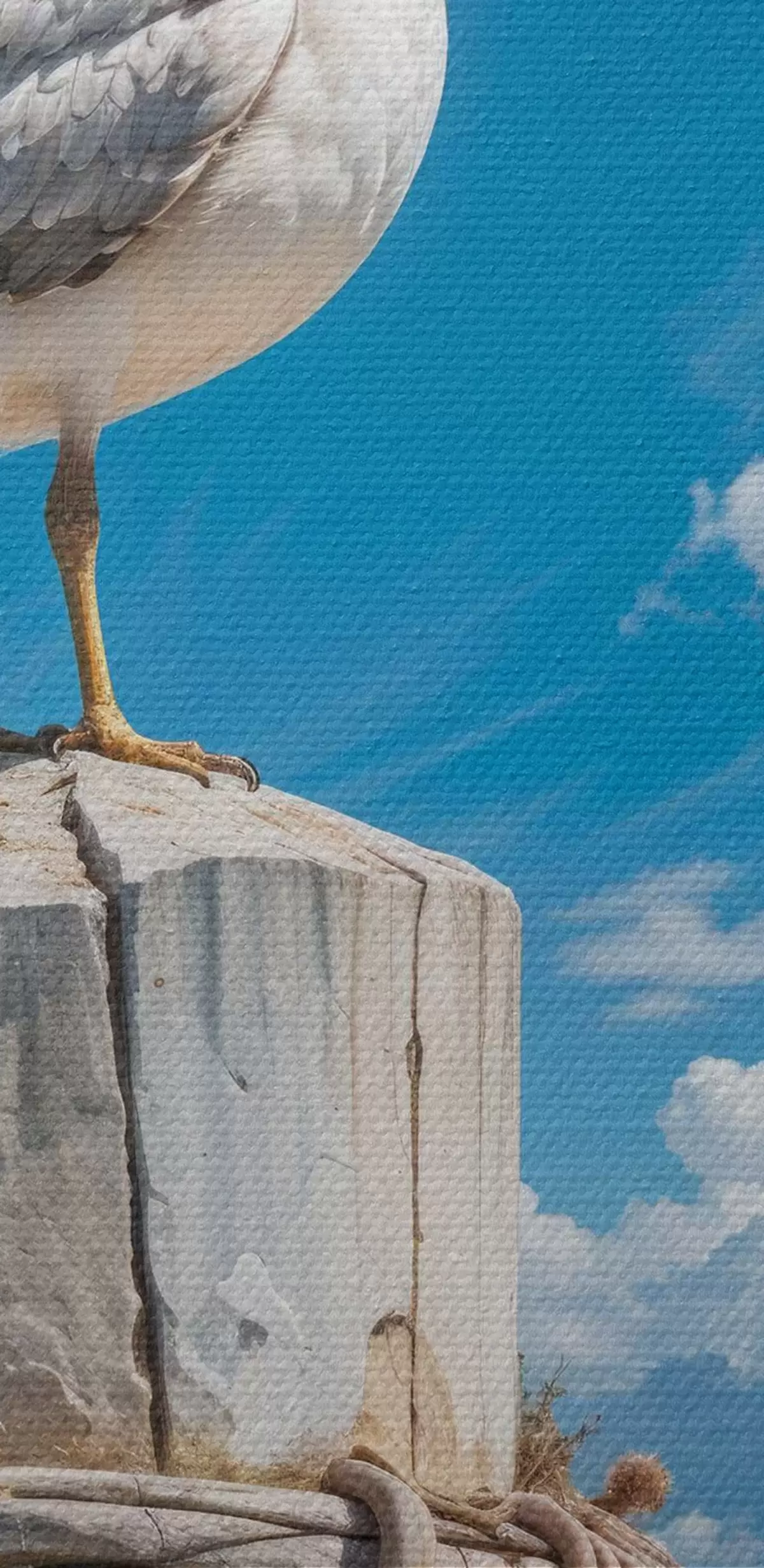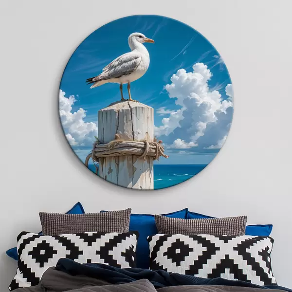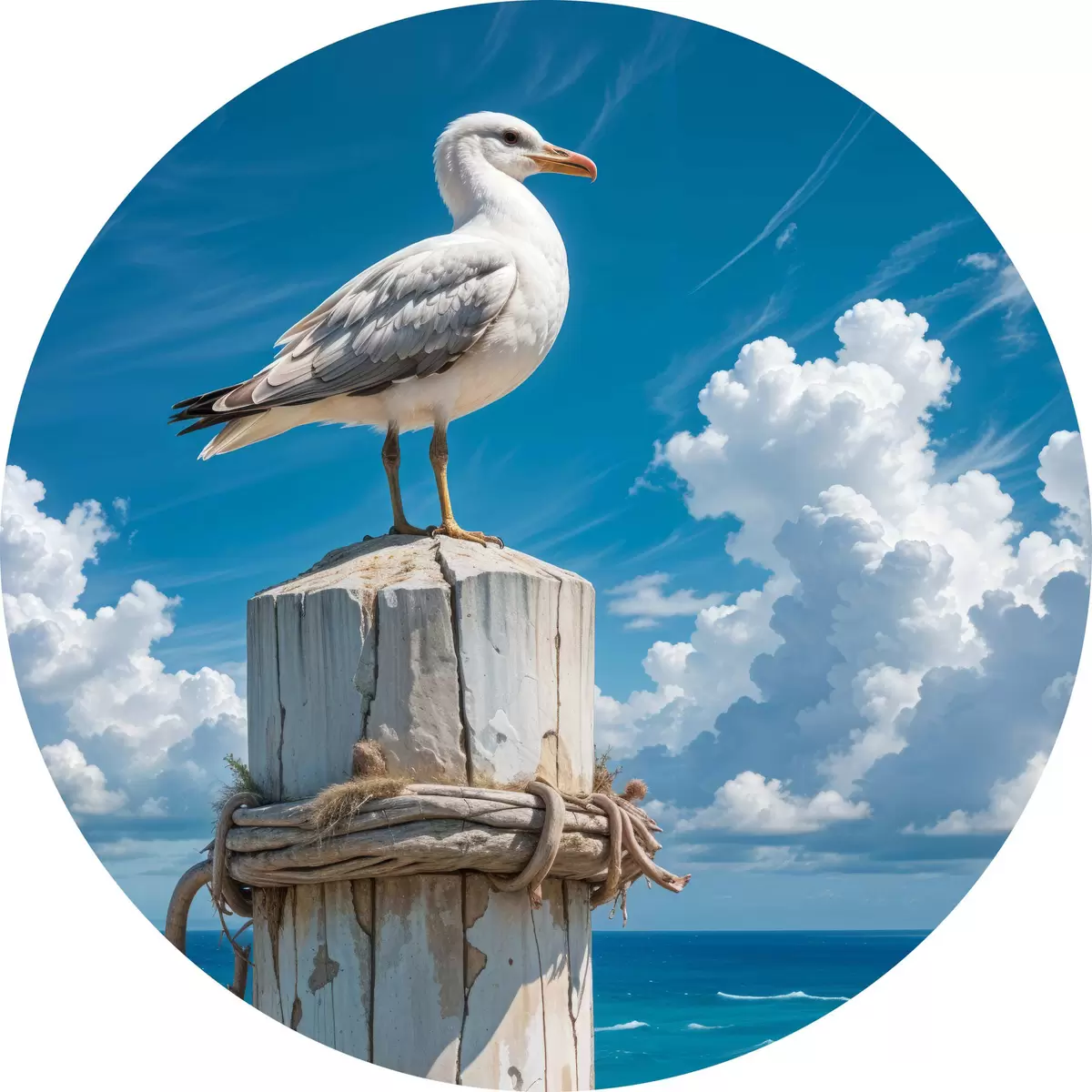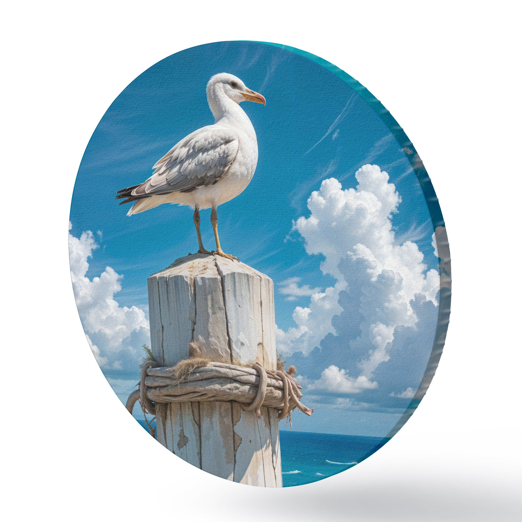 Runde Gemälde Eine weiße Möwe sitzt auf einem Holzpfahl vor dem Hintergrund eines hellblauen Himmels und des Ozeans mit Wellen r40590