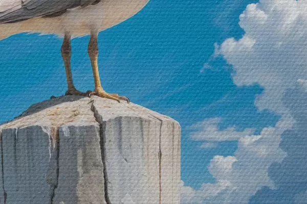 Runde Gemälde Eine weiße Möwe sitzt auf einem Holzpfahl vor dem Hintergrund eines hellblauen Himmels und des Ozeans mit Wellen r40590