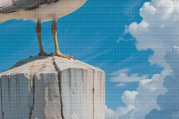 Bild Eine weiße Möwe sitzt auf einem Holzpfahl vor dem Hintergrund eines hellblauen Himmels und des Ozeans mit Wellen Nr r40590