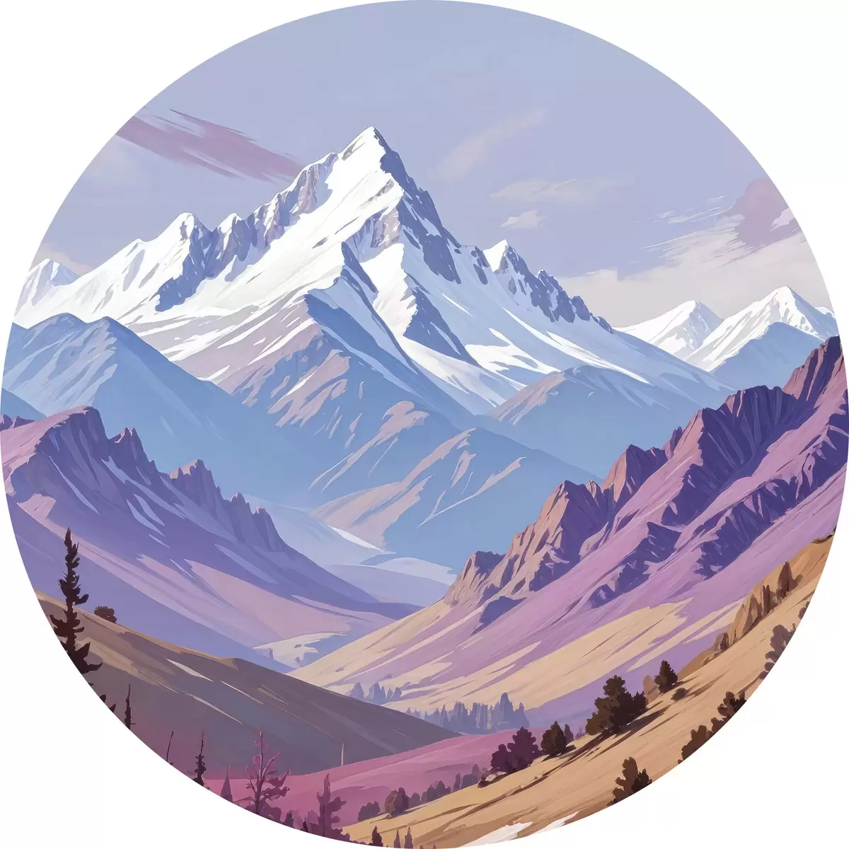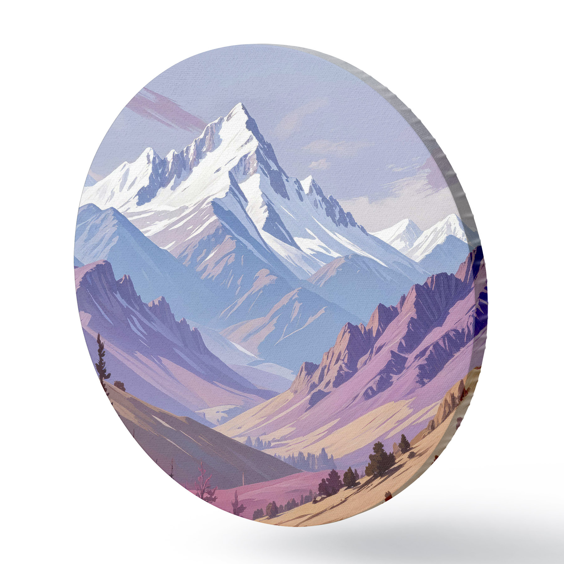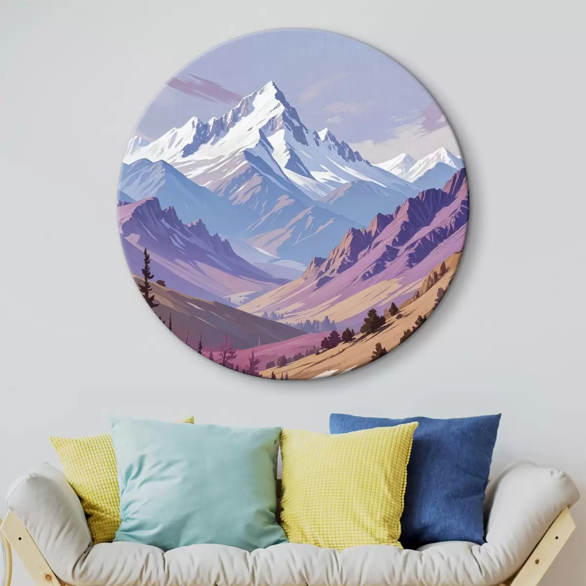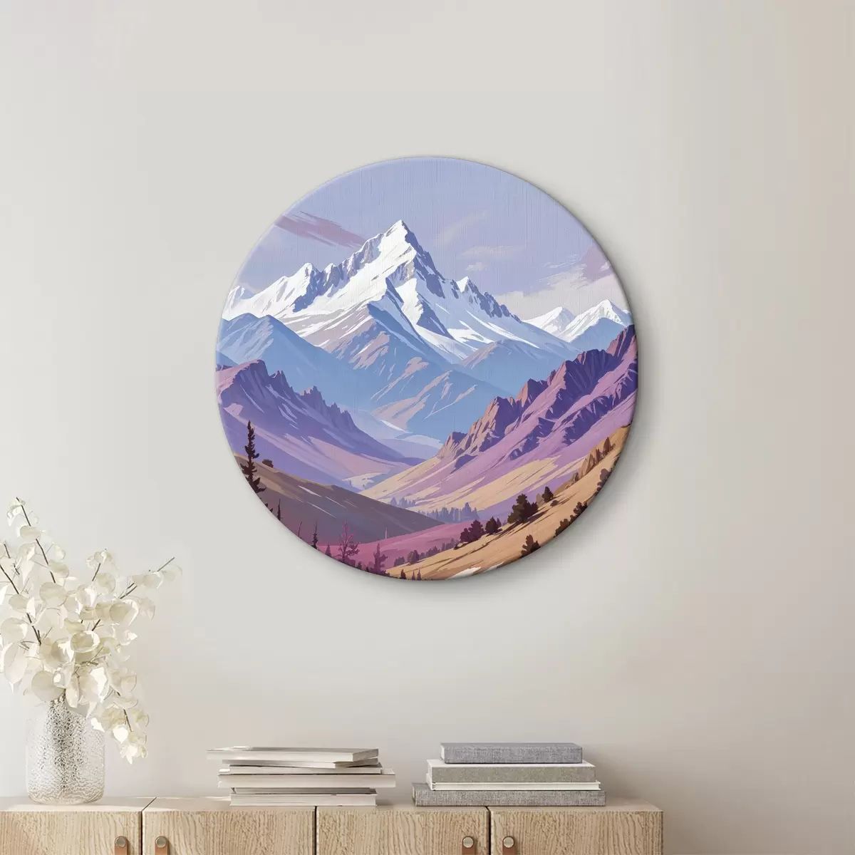 Runde Gemälde Schneebedeckte Berggipfel in einer bunten Landschaft mit Kiefern im Vordergrund r40595