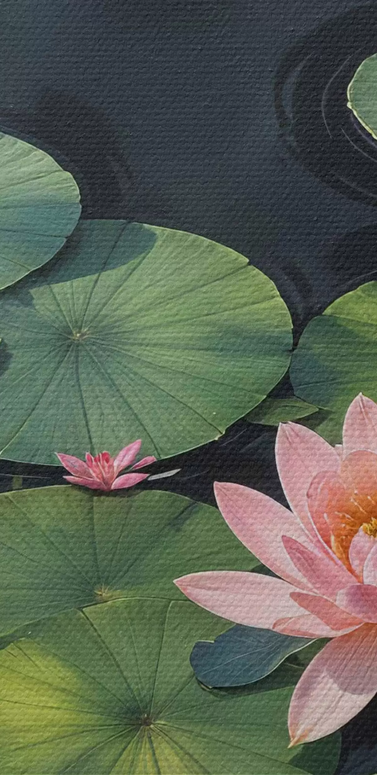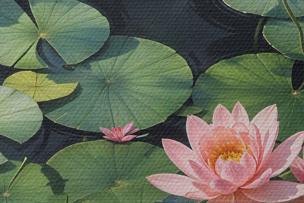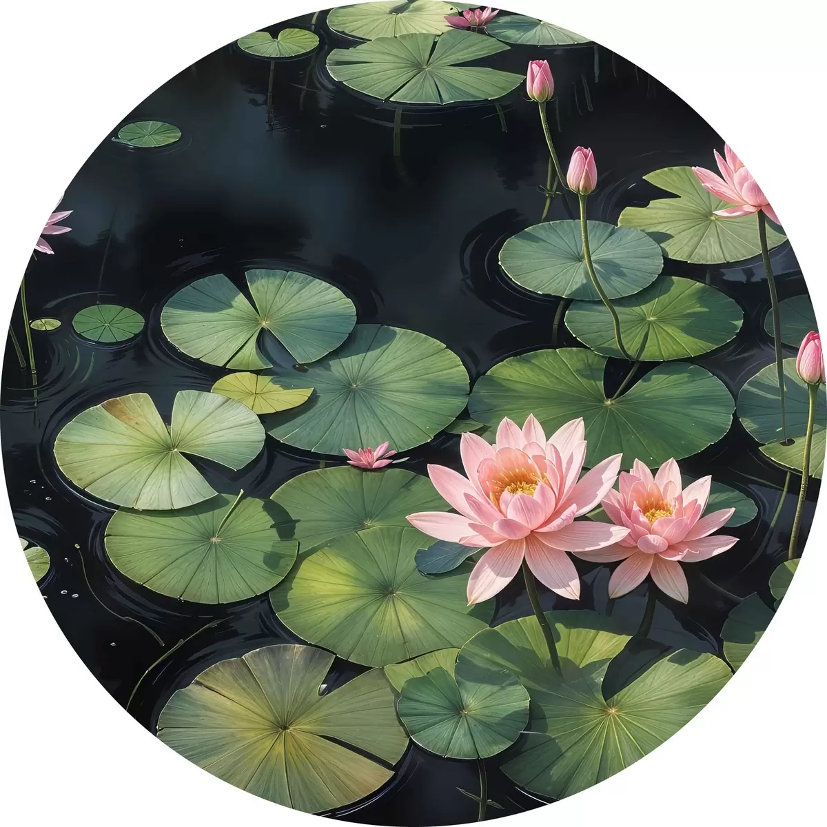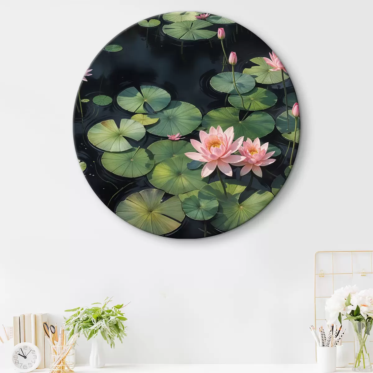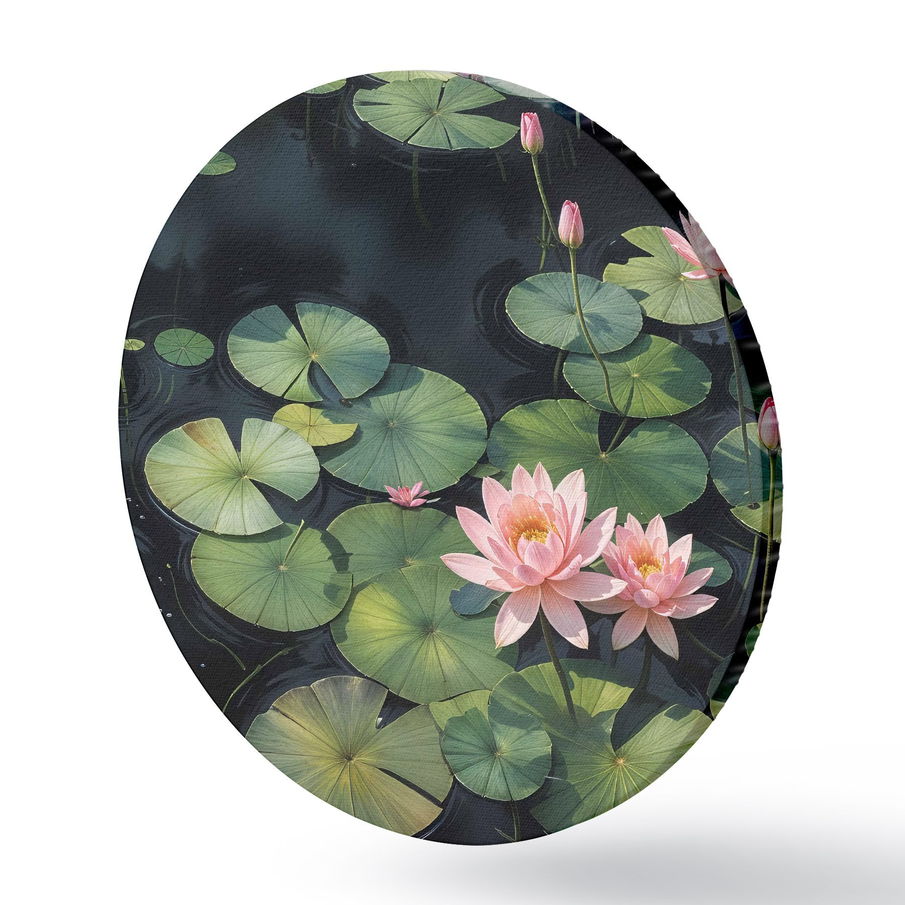 Runde Gemälde Ein Teich mit rosa Seerosen und grünen Seerosenblättern, die auf der Oberfläche schwimmen, umgeben von einem dunklen Hintergrund r40598