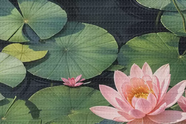 Bild Ein Teich mit rosa Seerosen und grünen Seerosenblättern, die auf der Oberfläche schwimmen, umgeben von einem dunklen Hintergrund Nr r40598